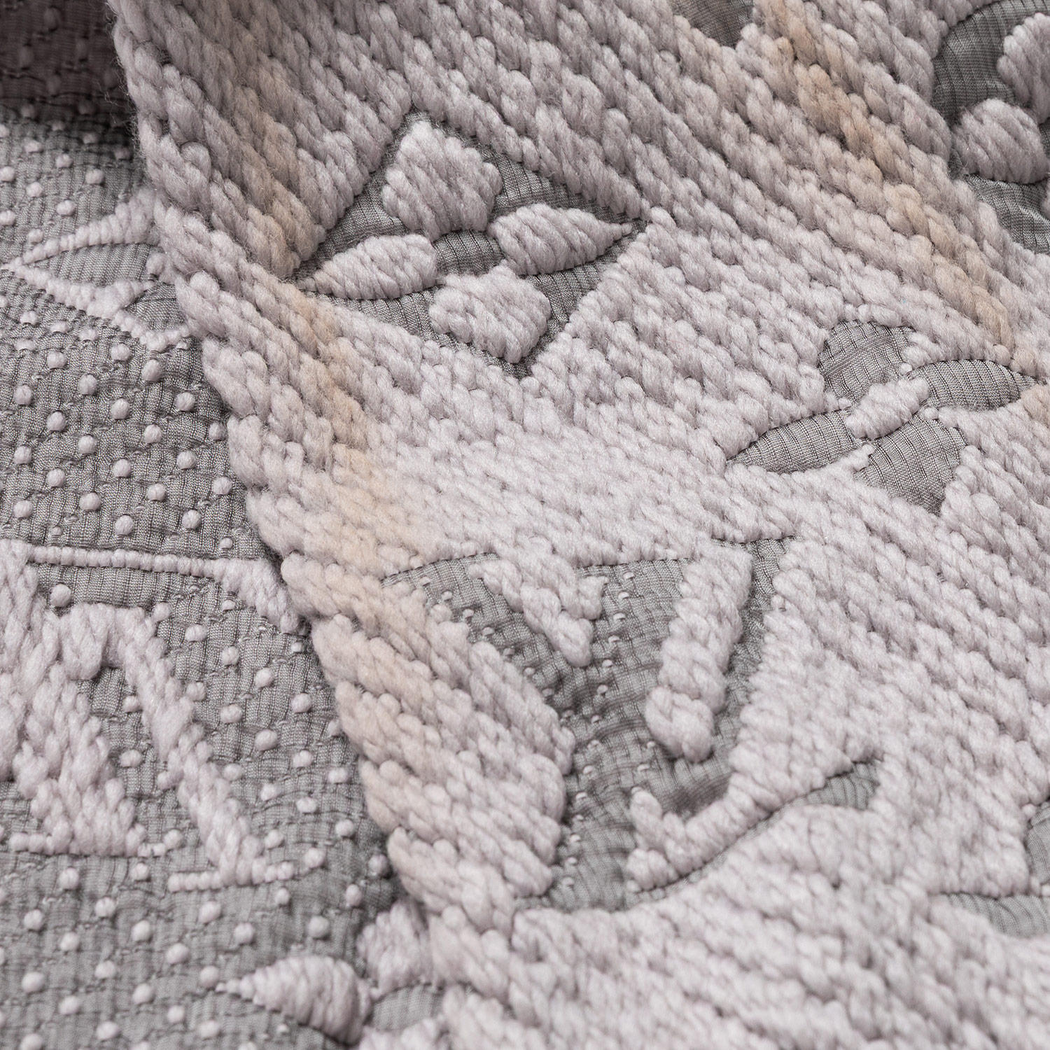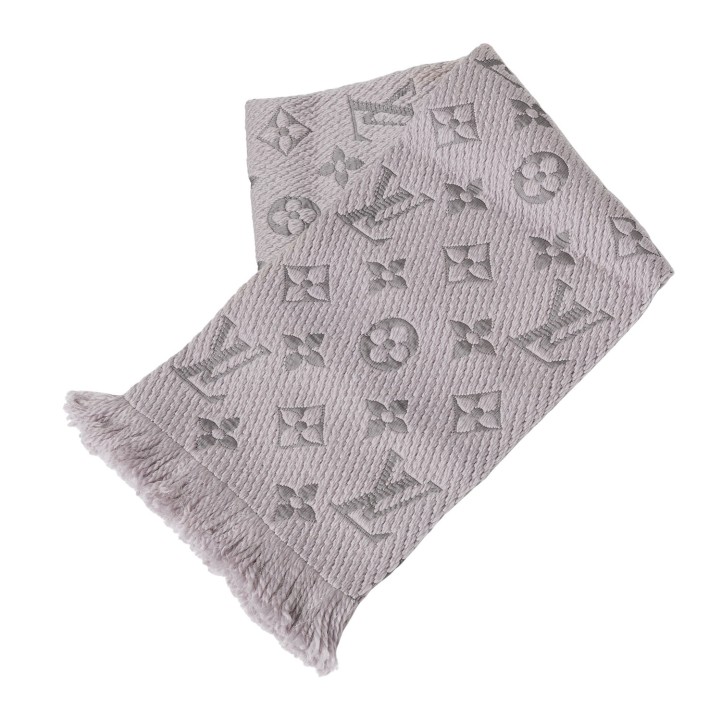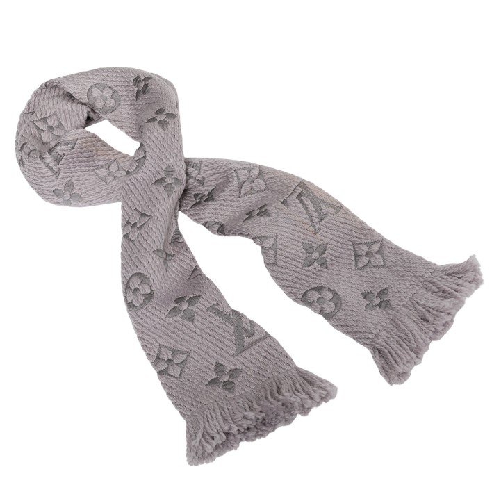 LOUIS VUITTON scarf 'LOGOMANIA'. 94% wool, 6% silk. Grey model with monogram flower and logo inserts. Signs of wear, stains. 160 x 30 cm.
