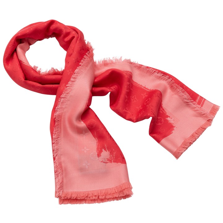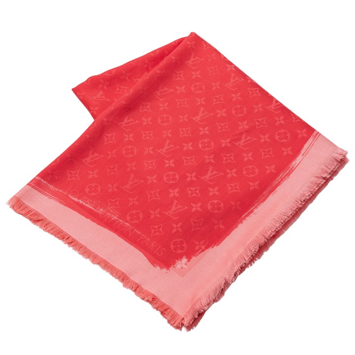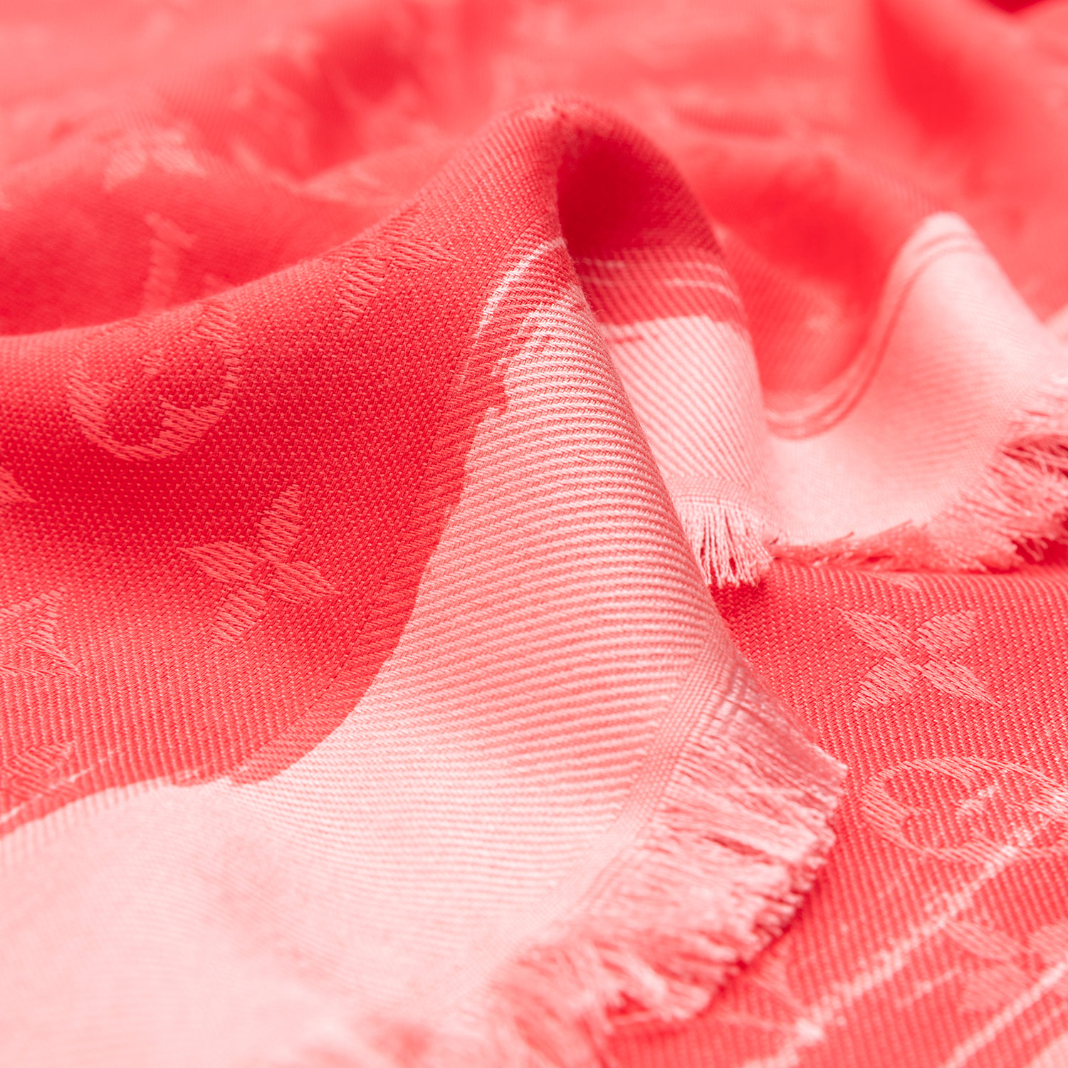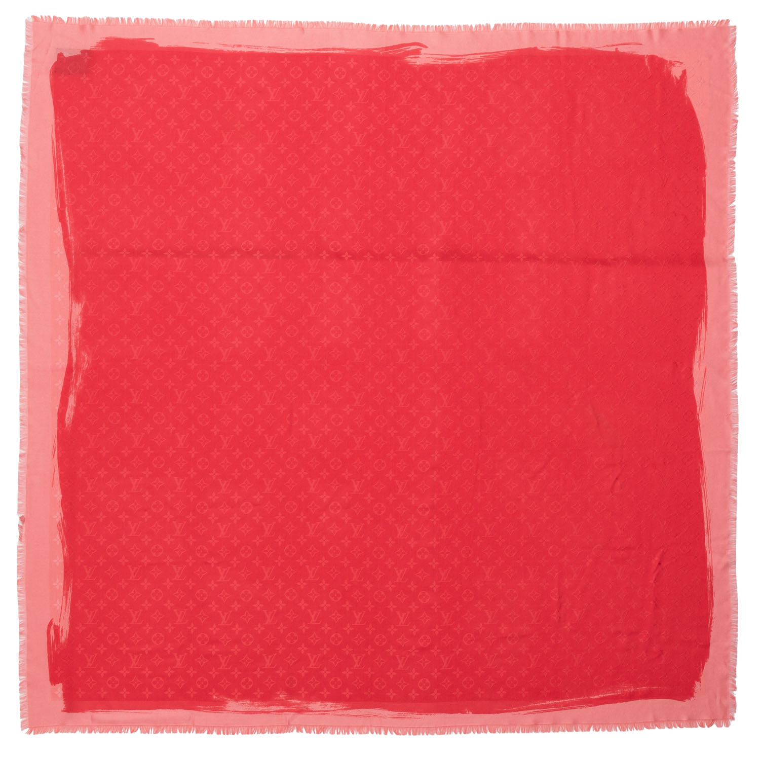 LOUIS VUITTON scarf 'MONOGRAM ARTIE'. 60% silk, 40% wool. Jacquard fabric in shades of pink with colour gradient and fringed edge. Signs of wear. 140 x 140 cm.
