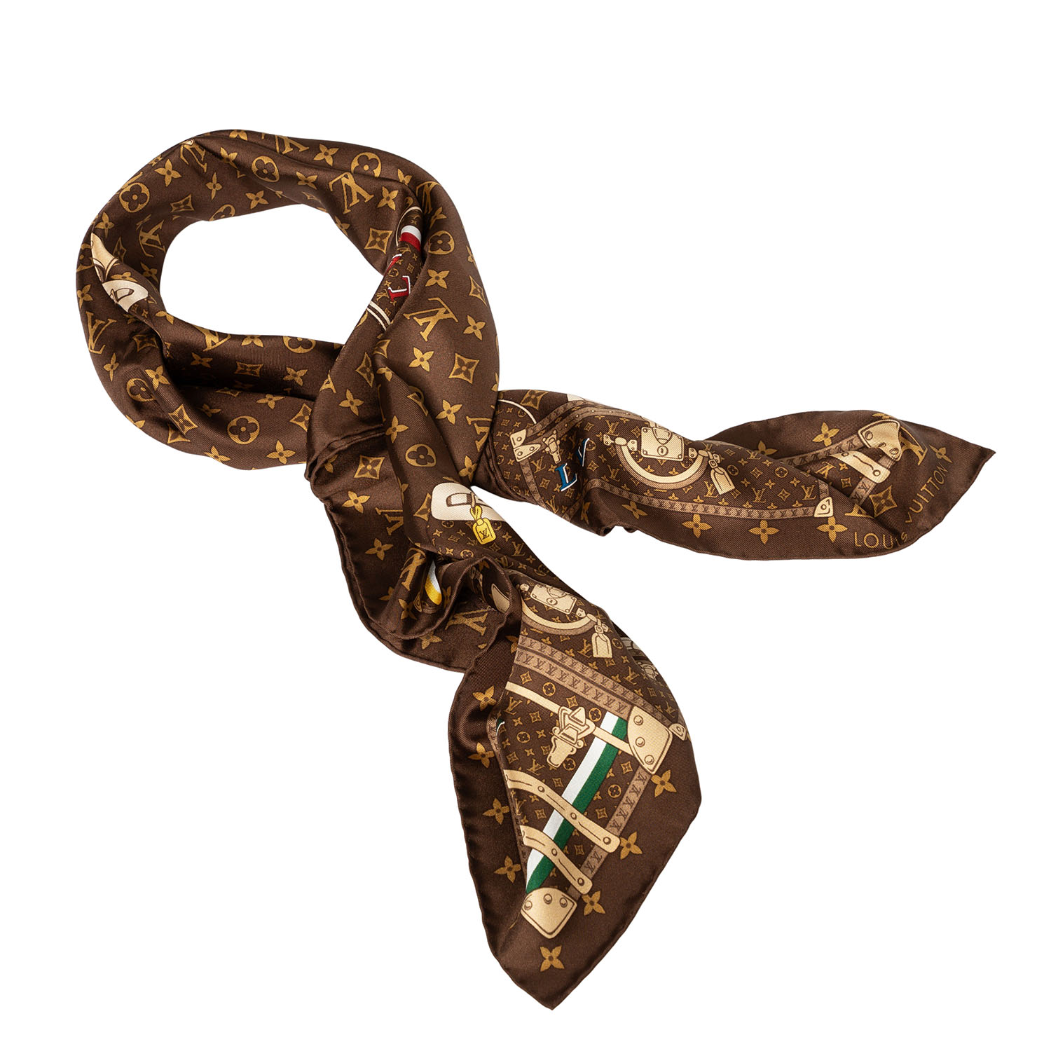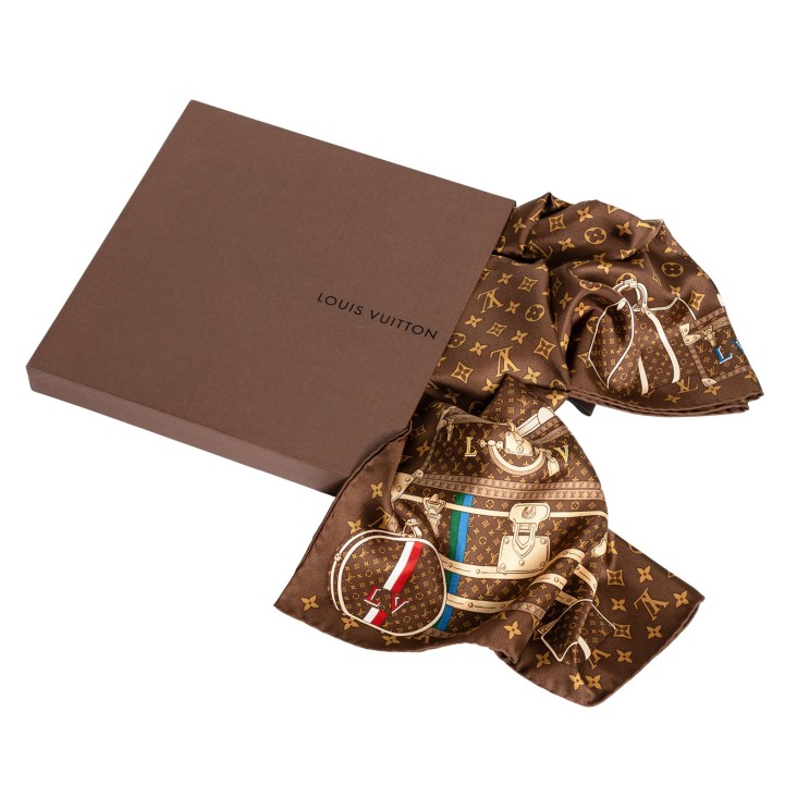 LOUIS VUITTON silk scarf 'TRUNKS', retail price: 490,-€. 100% silk. Monogram as basic motif with trunk and luggage design. Hand-rolled hems. 90 x 90 cm. Box included. Very good condition.