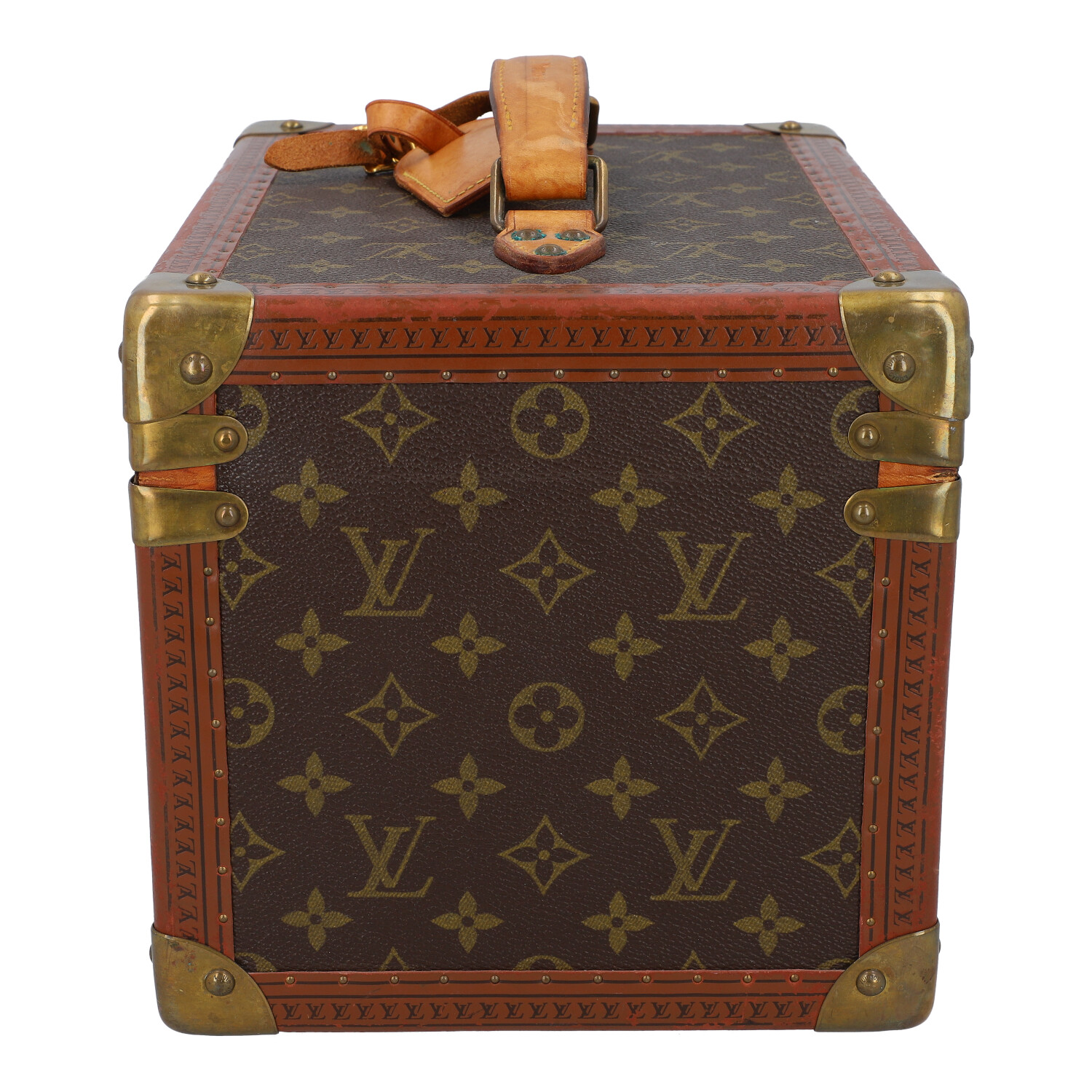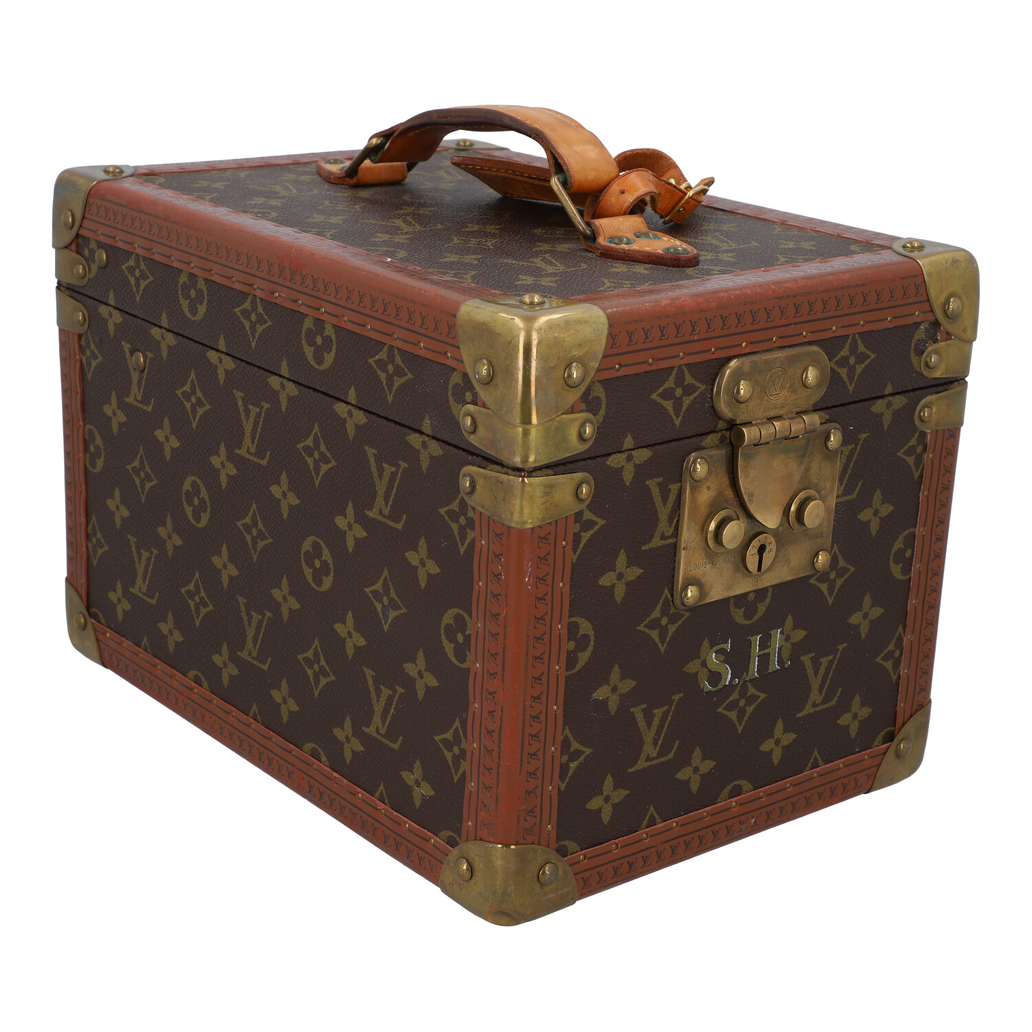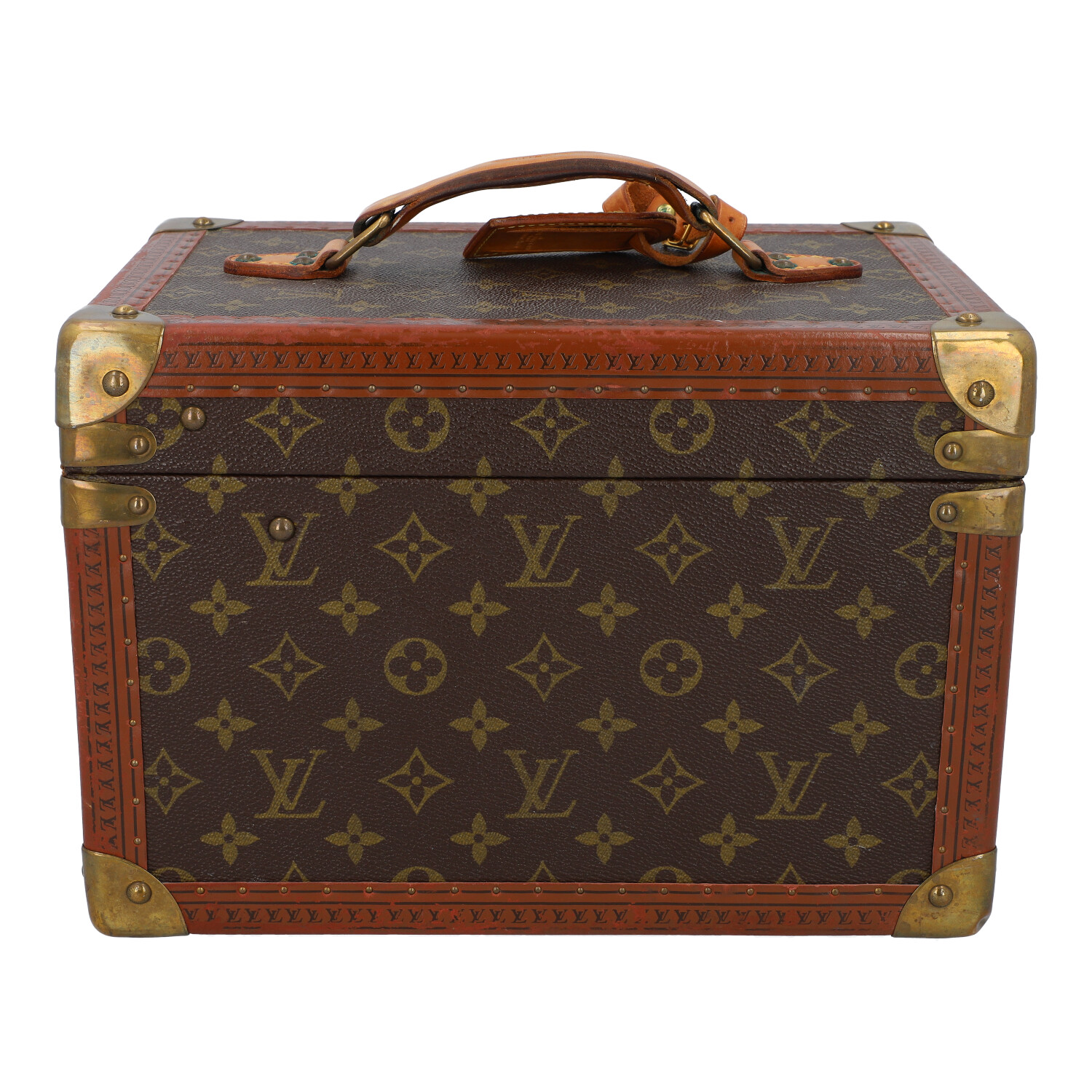 LOUIS VUITTON VINTAGE cosmetic case. Monogram Canvas series with cowhide leather details and gold-tone hardware, handle, solid clasp. Interior in nude with an additional small insert and with integrated mirror. Key enclosed. Heavy signs of use present.