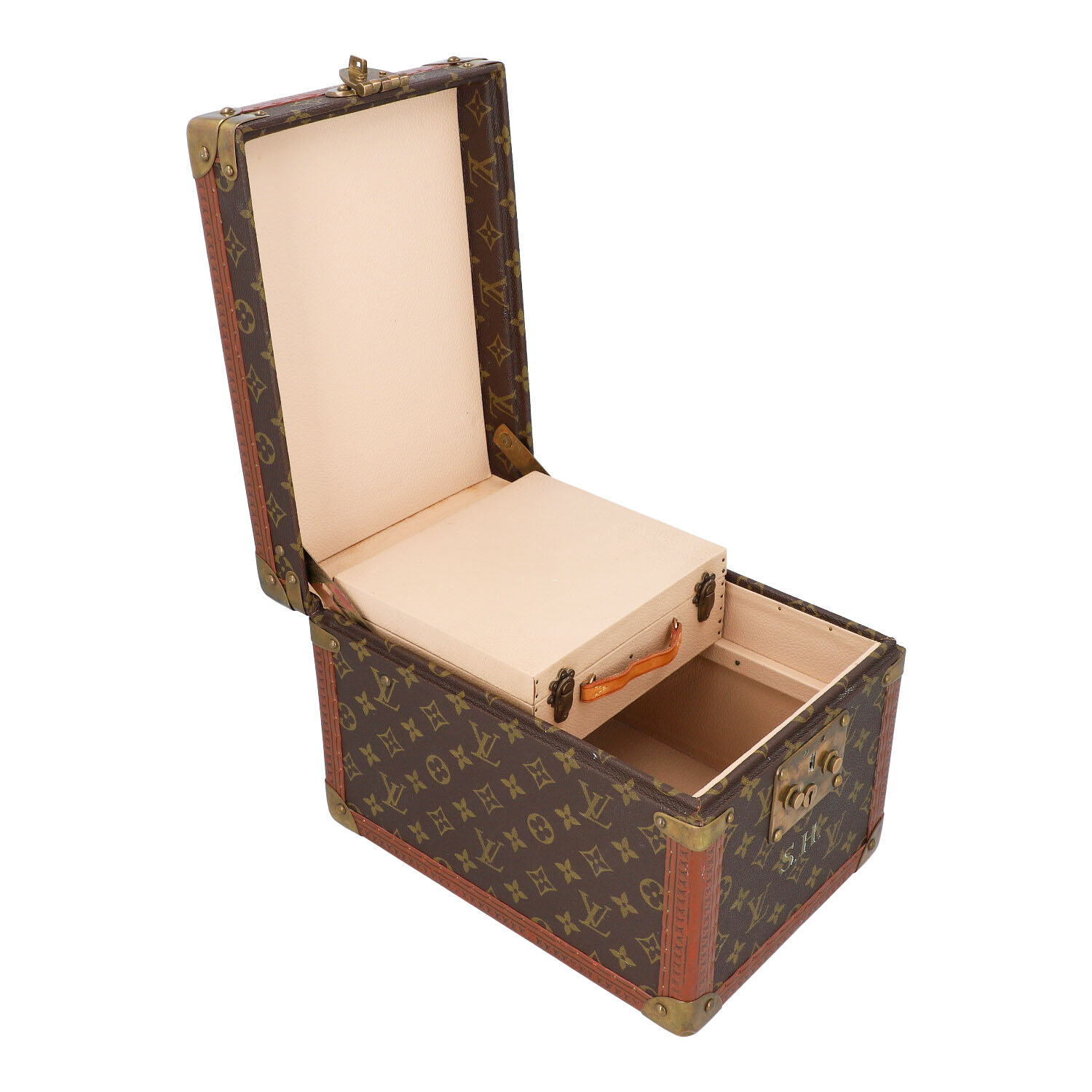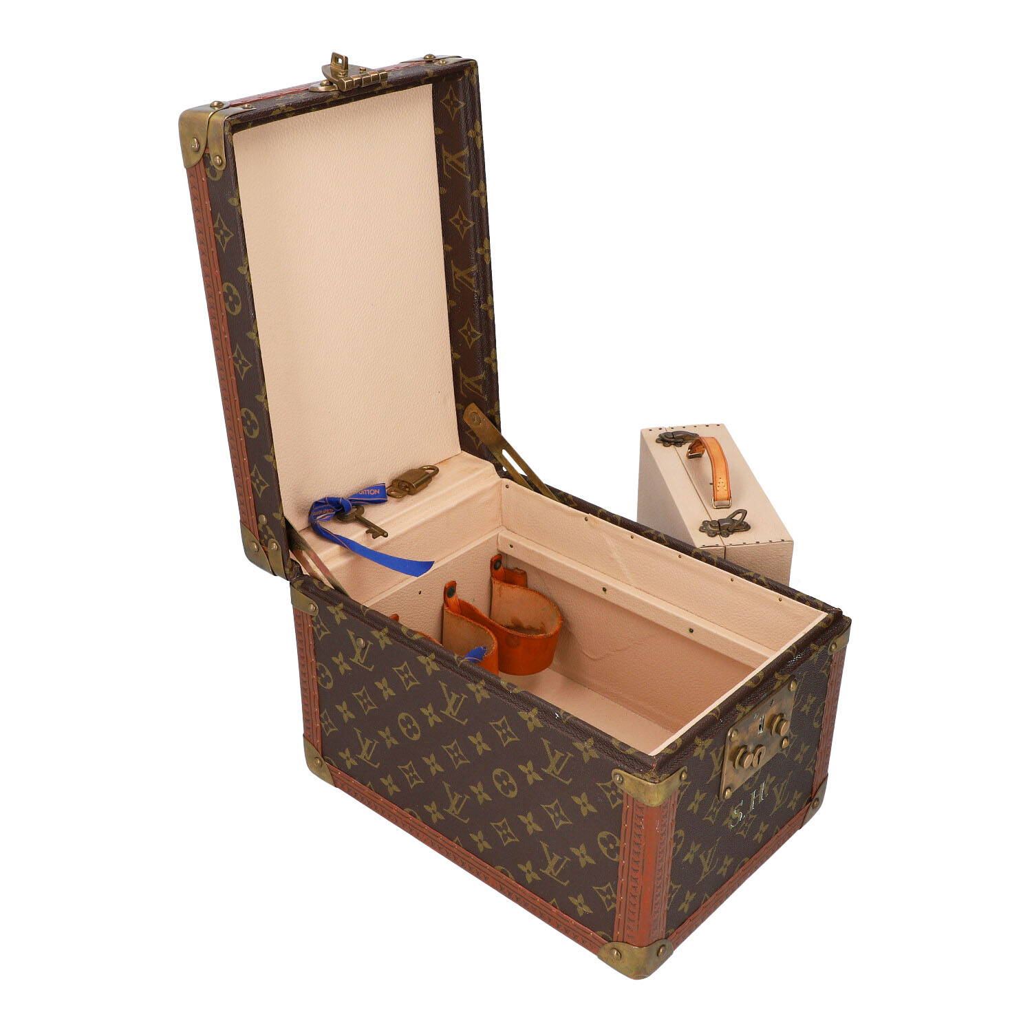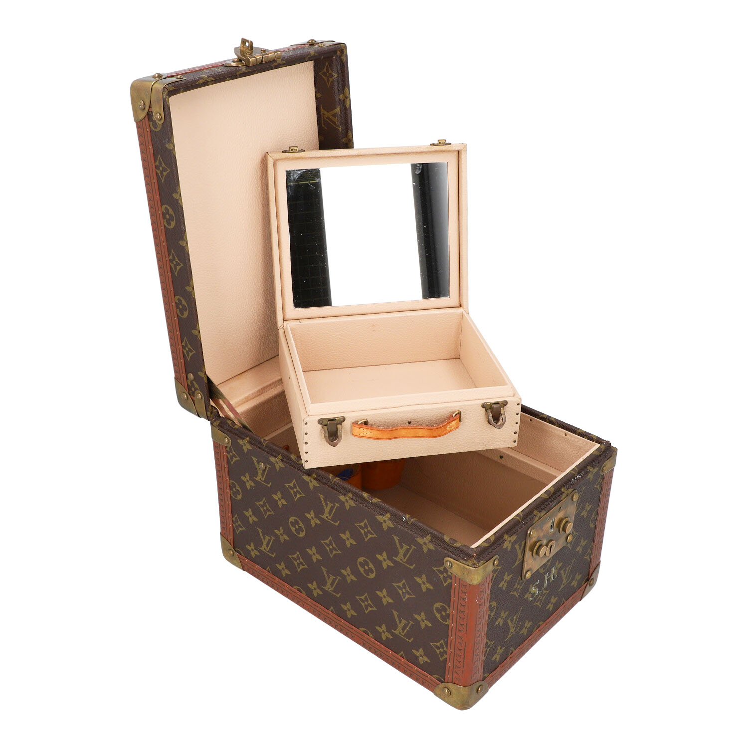 LOUIS VUITTON VINTAGE cosmetic case. Monogram Canvas series with cowhide leather details and gold-tone hardware, handle, solid clasp. Interior in nude with an additional small insert and with integrated mirror. Key enclosed. Heavy signs of use present.