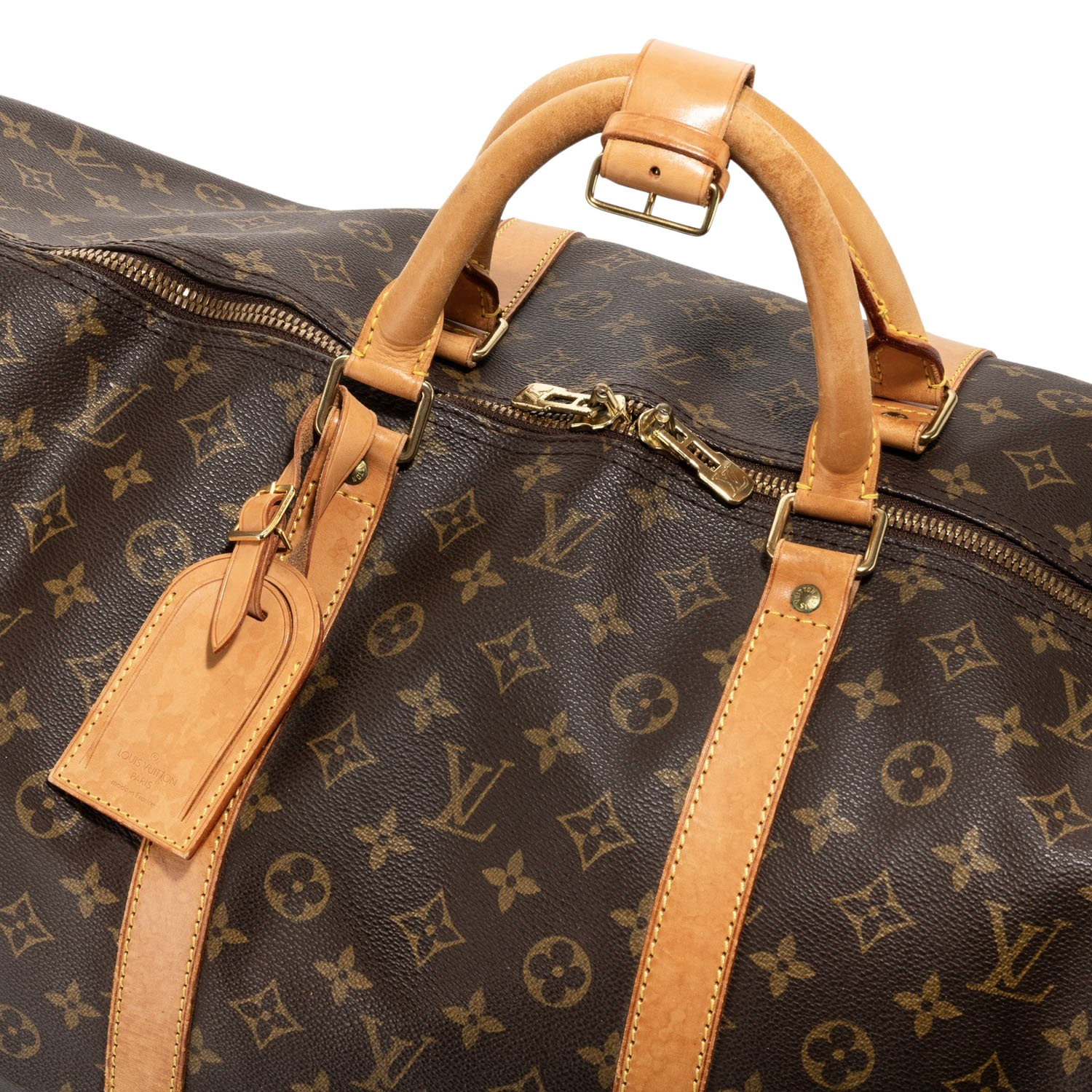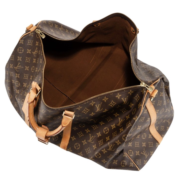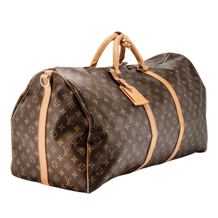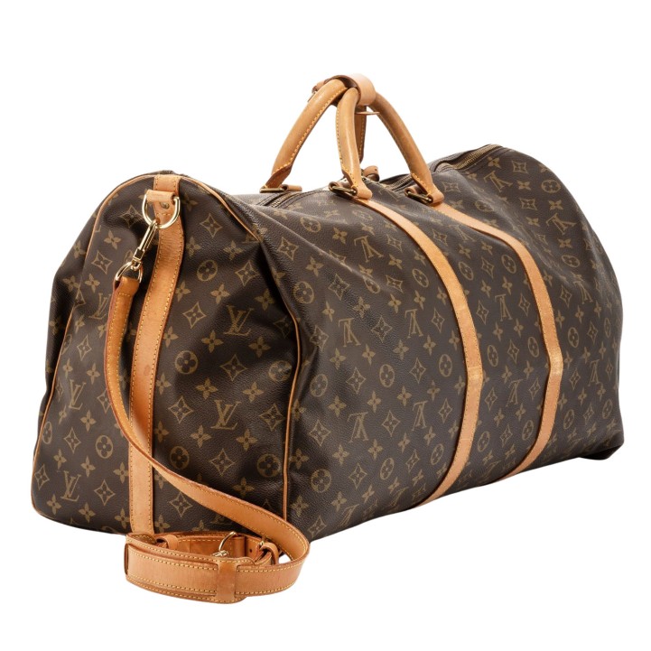 LOUIS VUITTON VINTAGE weekender 'KEEPALL BAND. 60'. Coll. 1995. Current retail price approx.: €2,300. Monogram canvas series with natural leather and gold-colored hardware. Classic model with shoulder strap. Significant patina and signs of age present.