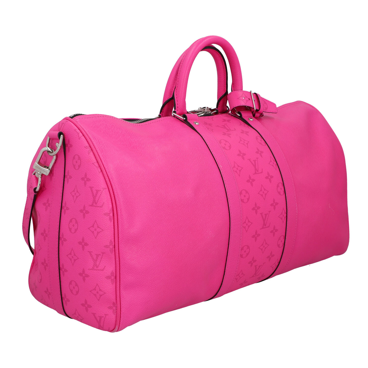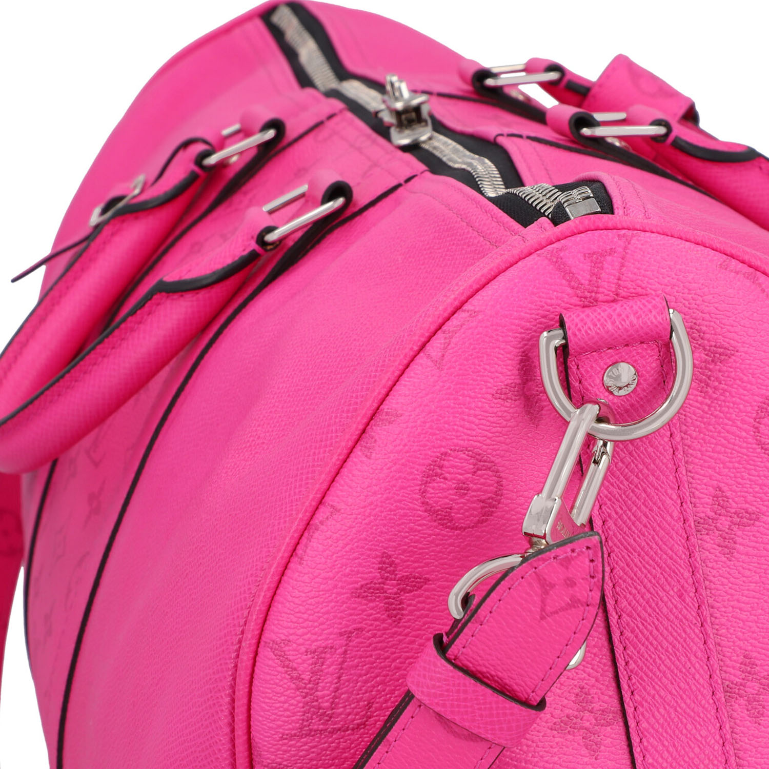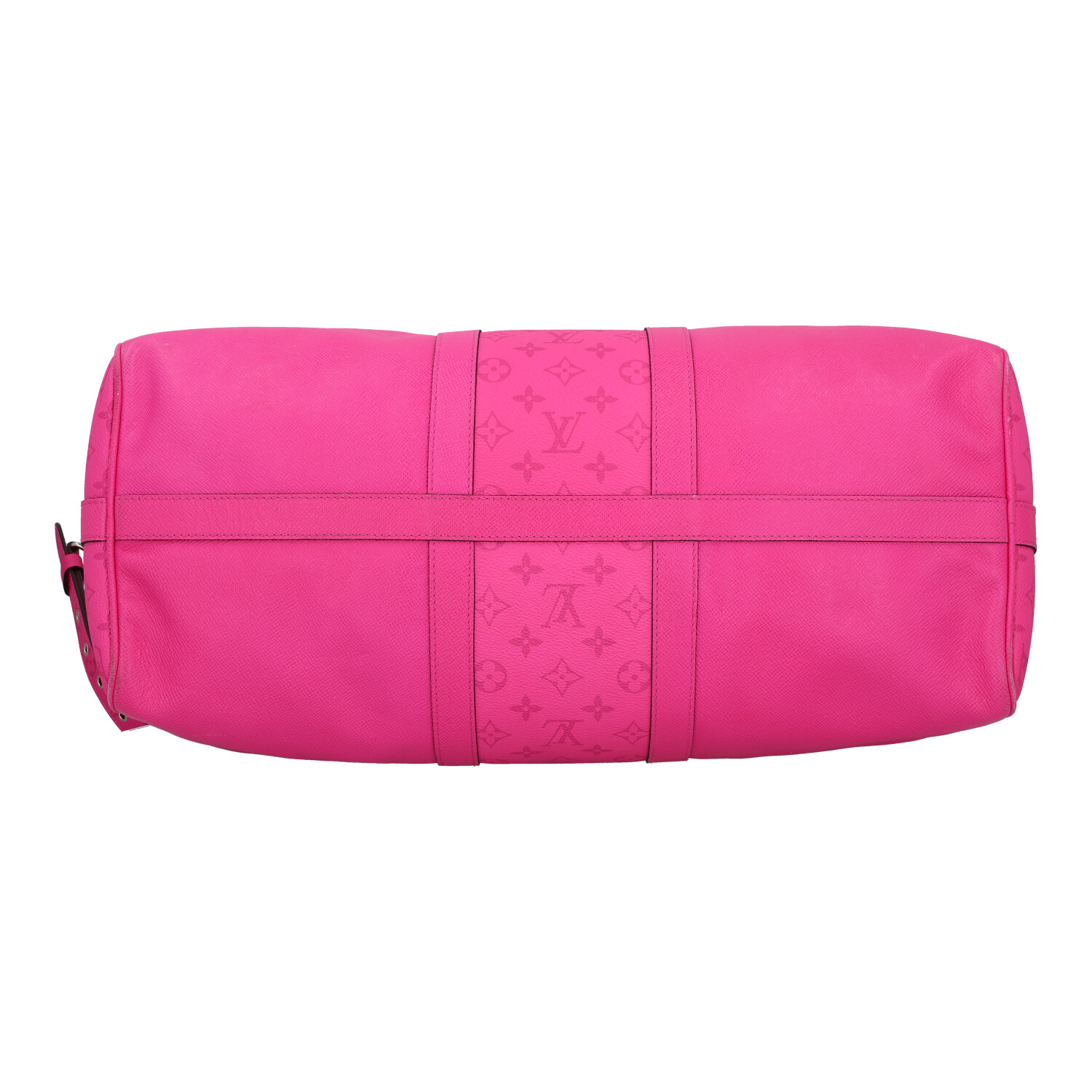 LOUIS VUITTON weekender 'KEEPALL 50'. Taigarama leather series in fuchsia with silver-colored hardware and textile lining in black. Shoulder strap, address tag, closure flap, lock and key enclosed. Heavy wear to the corners, otherwise slight signs of use.