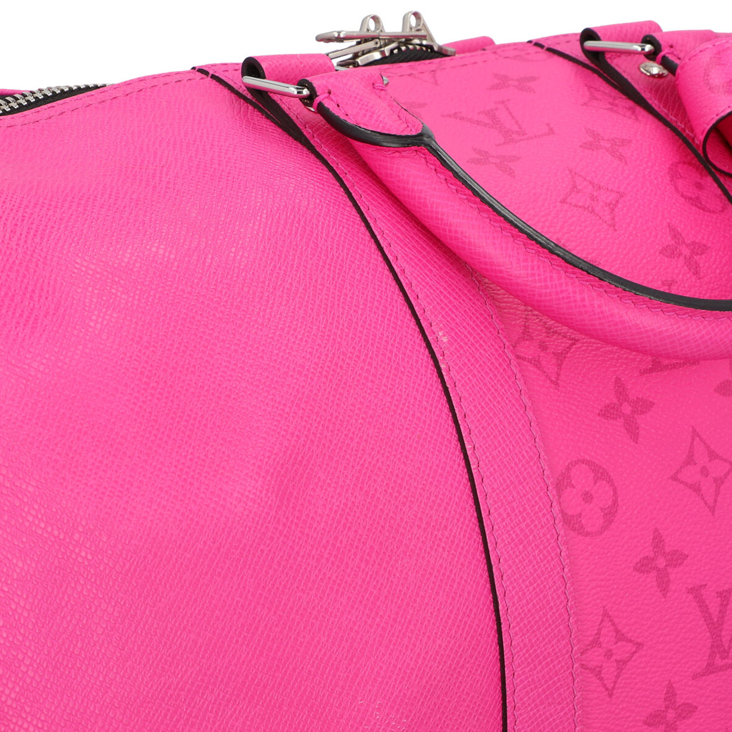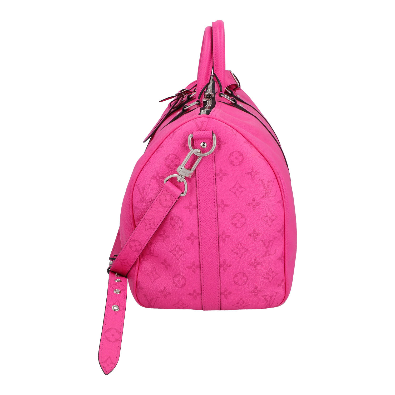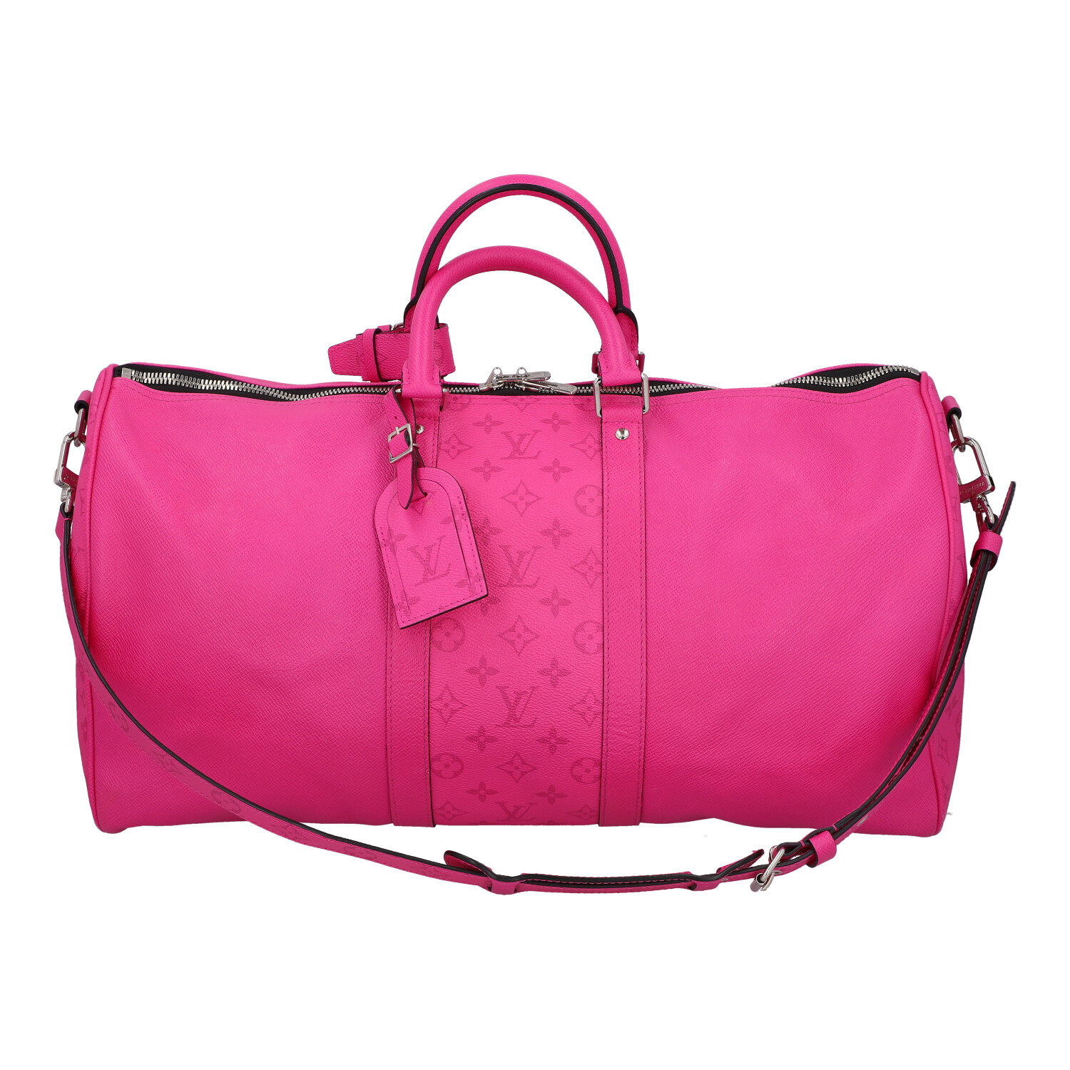LOUIS VUITTON weekender 'KEEPALL 50'. Taigarama leather series in fuchsia with silver-colored hardware and textile lining in black. Shoulder strap, address tag, closure flap, lock and key enclosed. Heavy wear to the corners, otherwise slight signs of use.