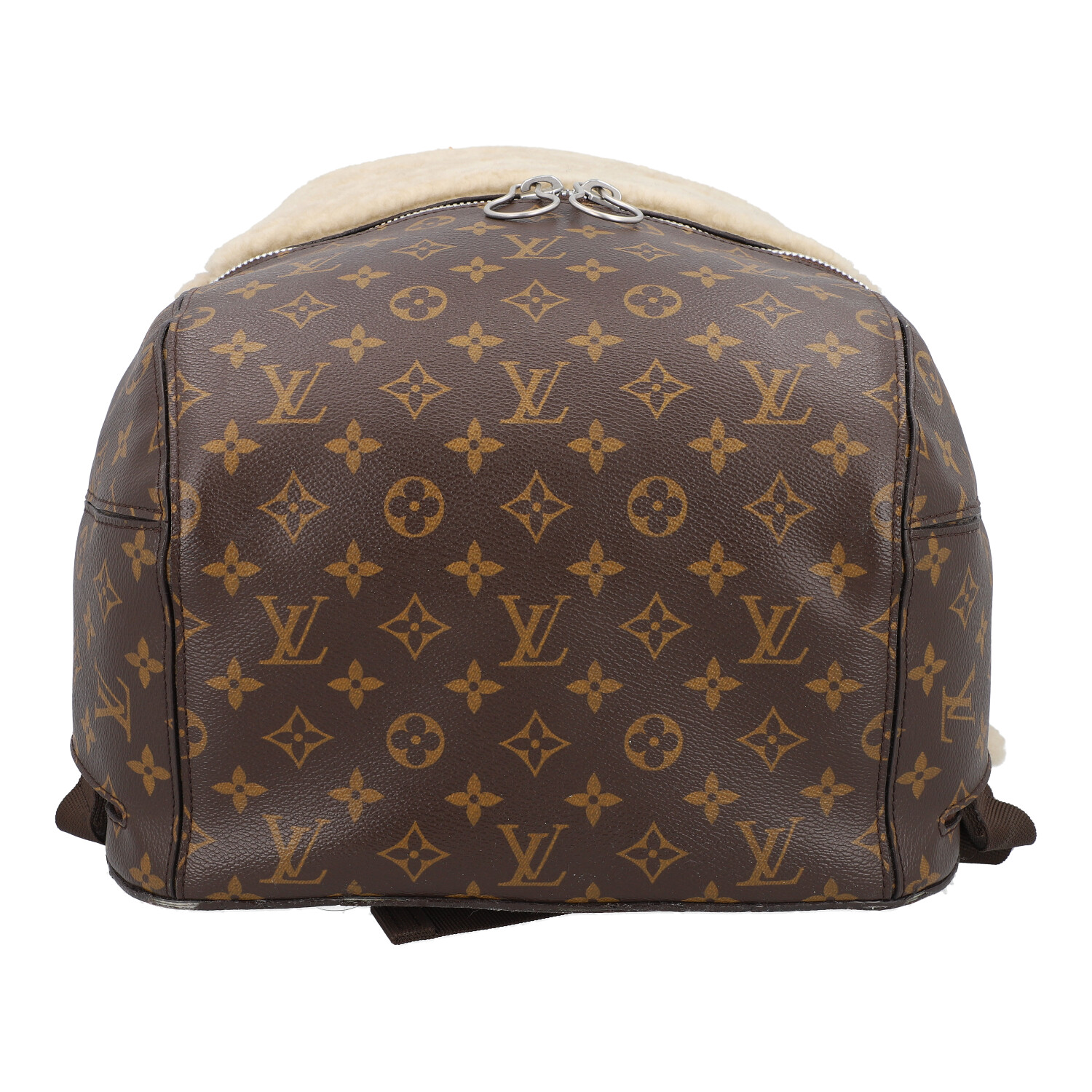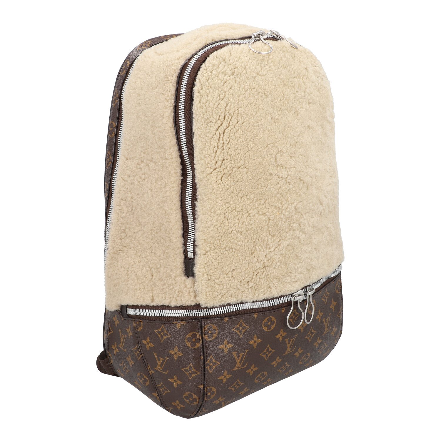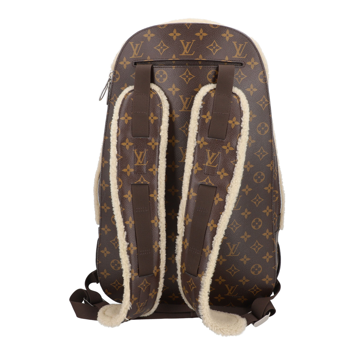 LOUIS VUITTON X MARC NEWSON backpack, coll.: 2014. To celebrate its 160th birthday, Louis Vuitton asked six artists to create their interpretation of the logo bag. Monogram canvas and shearling with silver-coloured hardware, zip fastening and adjustable shoulder strap. Interior with various compartments. Signs of wear present.