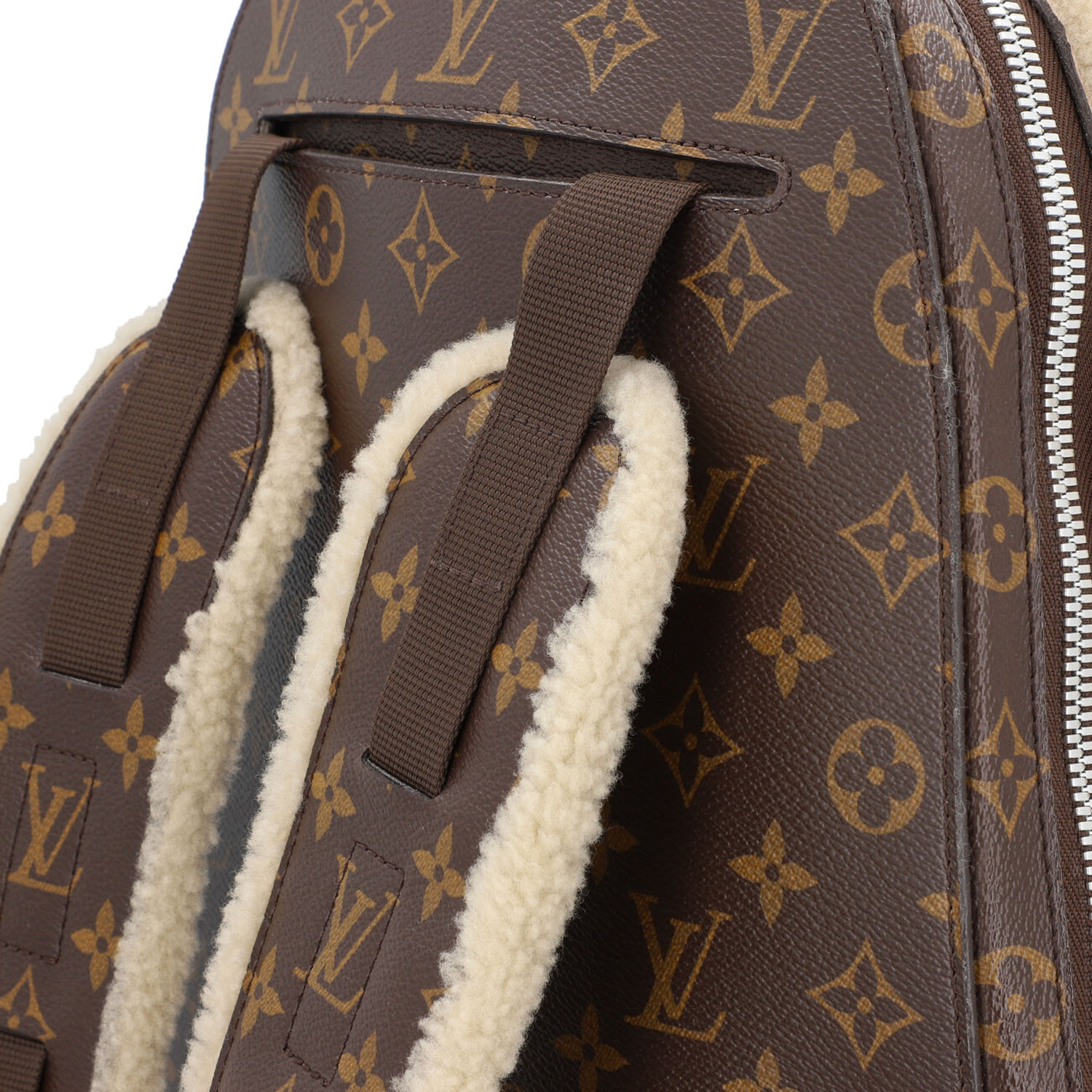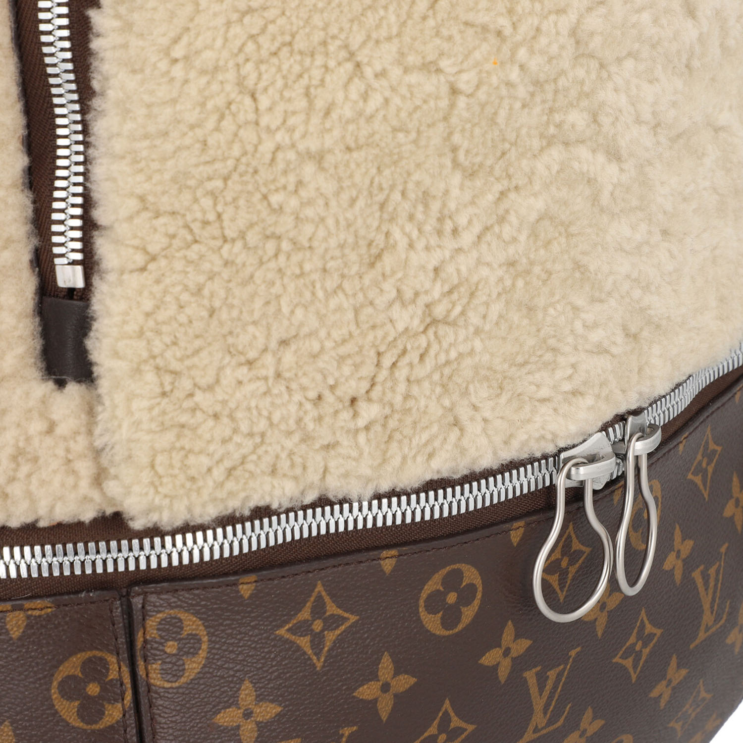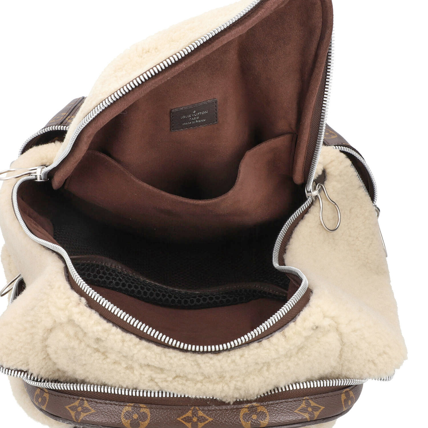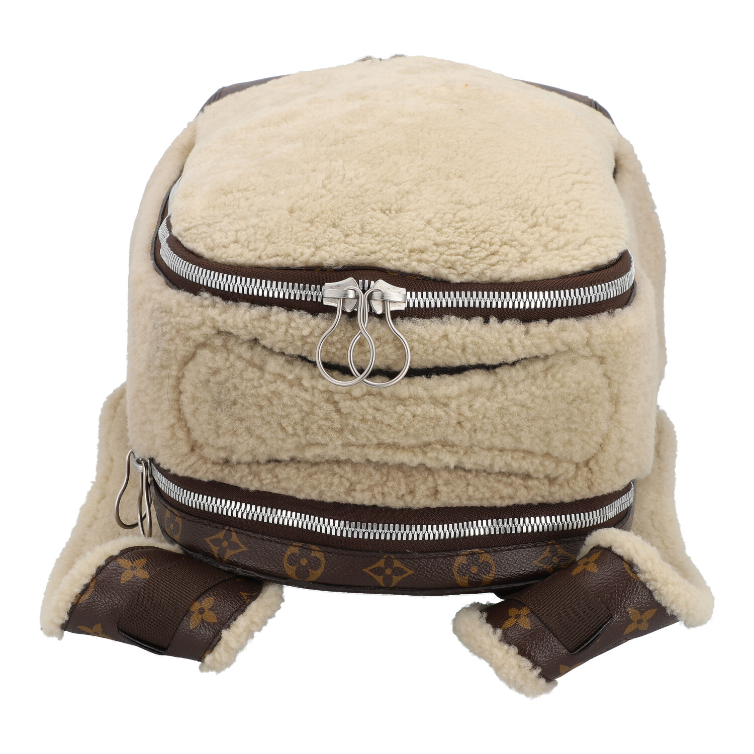 LOUIS VUITTON X MARC NEWSON backpack, coll.: 2014. To celebrate its 160th birthday, Louis Vuitton asked six artists to create their interpretation of the logo bag. Monogram canvas and shearling with silver-coloured hardware, zip fastening and adjustable shoulder strap. Interior with various compartments. Signs of wear present.
