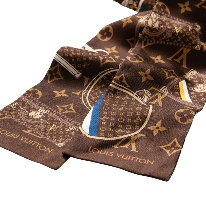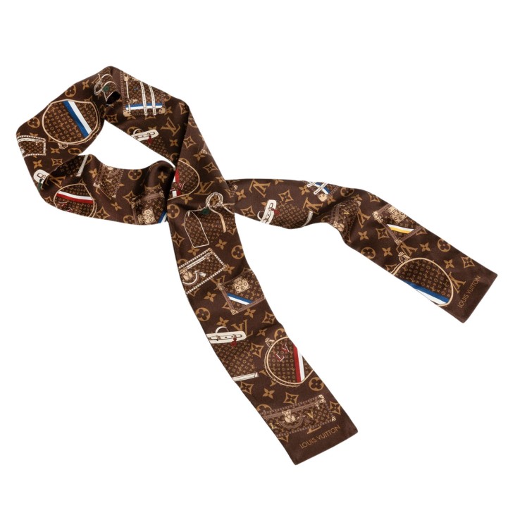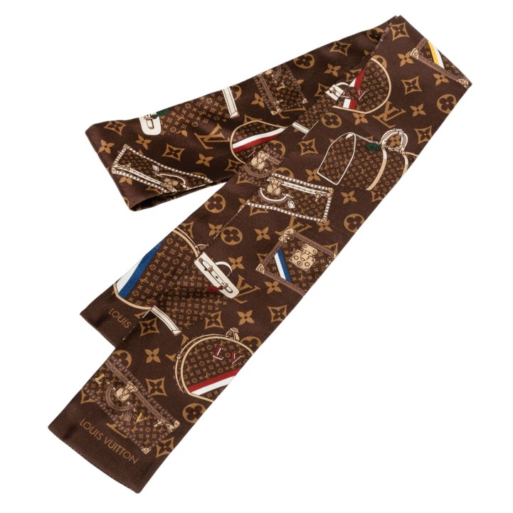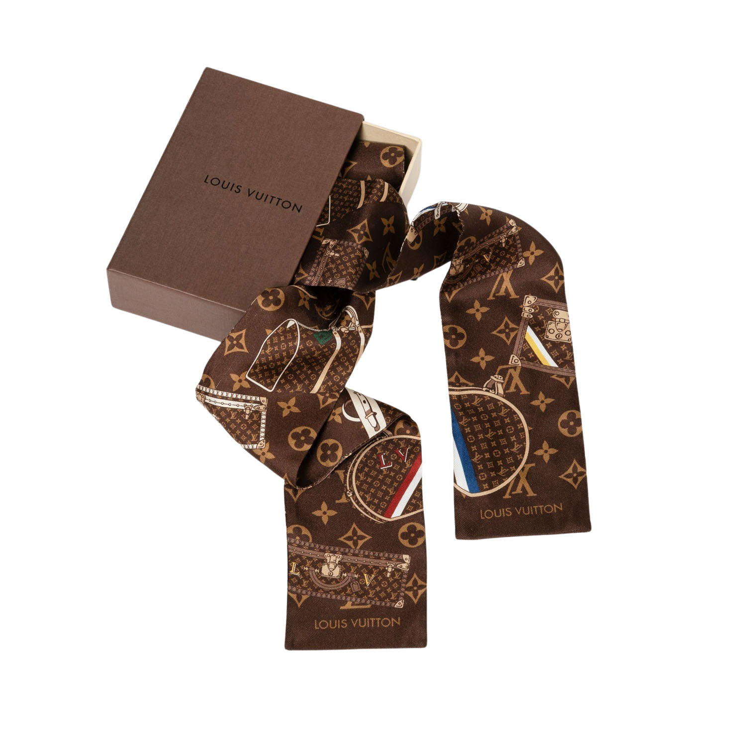PRE-LOVED ITEM BY @JENNIFERKATHE - LOUIS VUITTON Twilly “TRUNK”. 2014 collection. Twilly made of 100% silk in dark brown with classic monogram and trunk motifs. Several pulled threads present, otherwise in good condition. With box. 125x7cm.