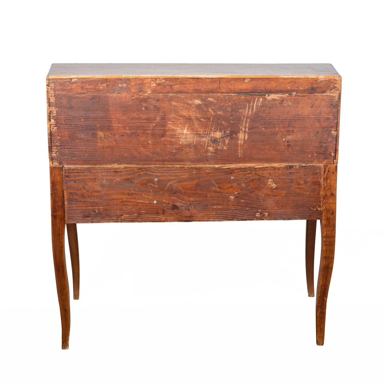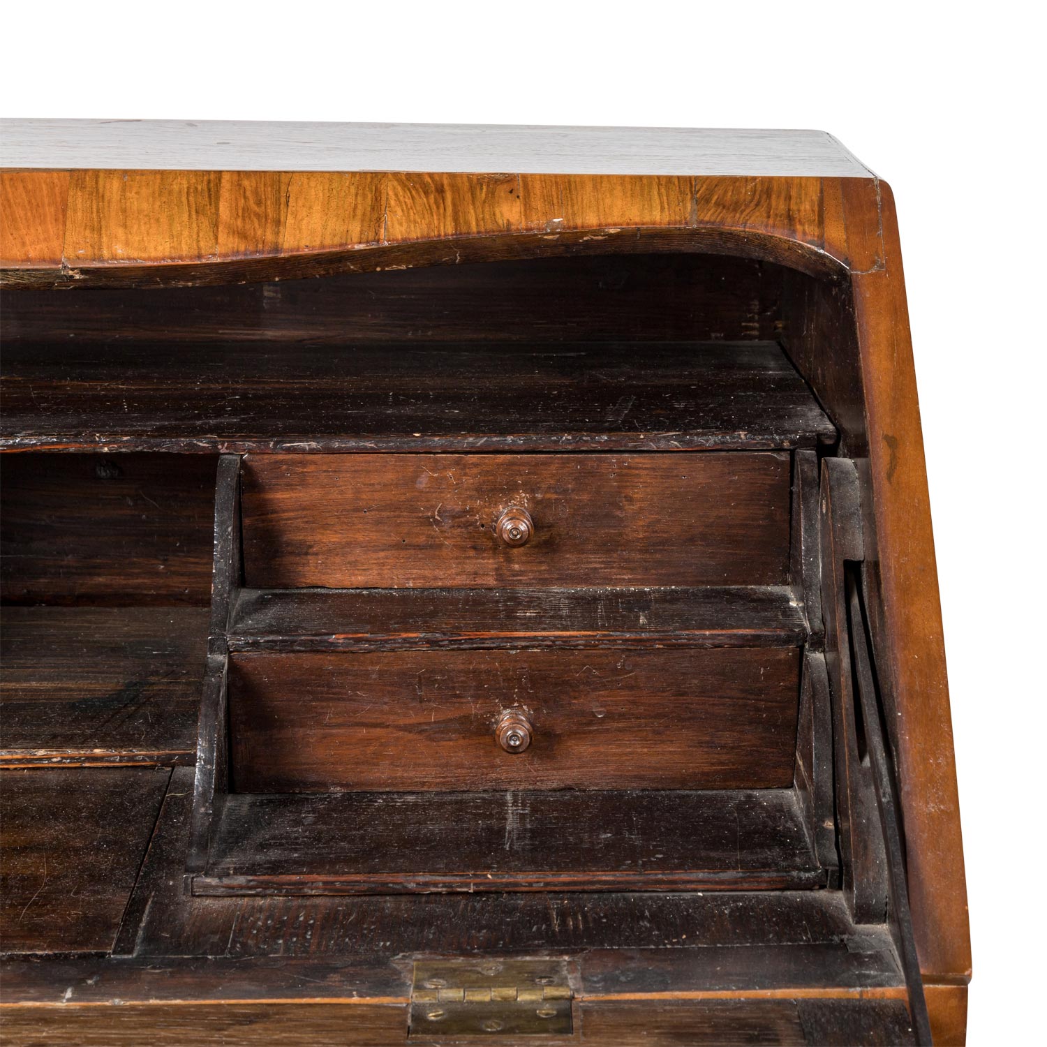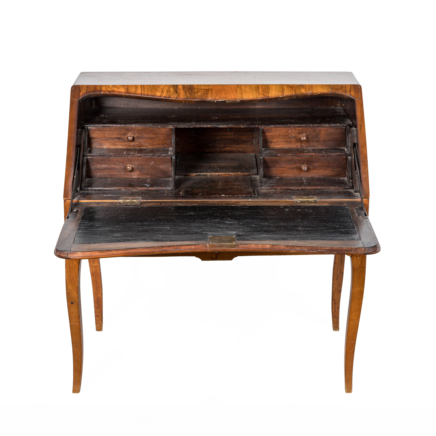 LOUIS XV SECRETARY, France, middle of the 18th century, a curved, two-panelled frame on high, curved legs, a sloping, hinged work surface, behind it staggered compartments, HxWxD: 92/90/52 cm. Rest.