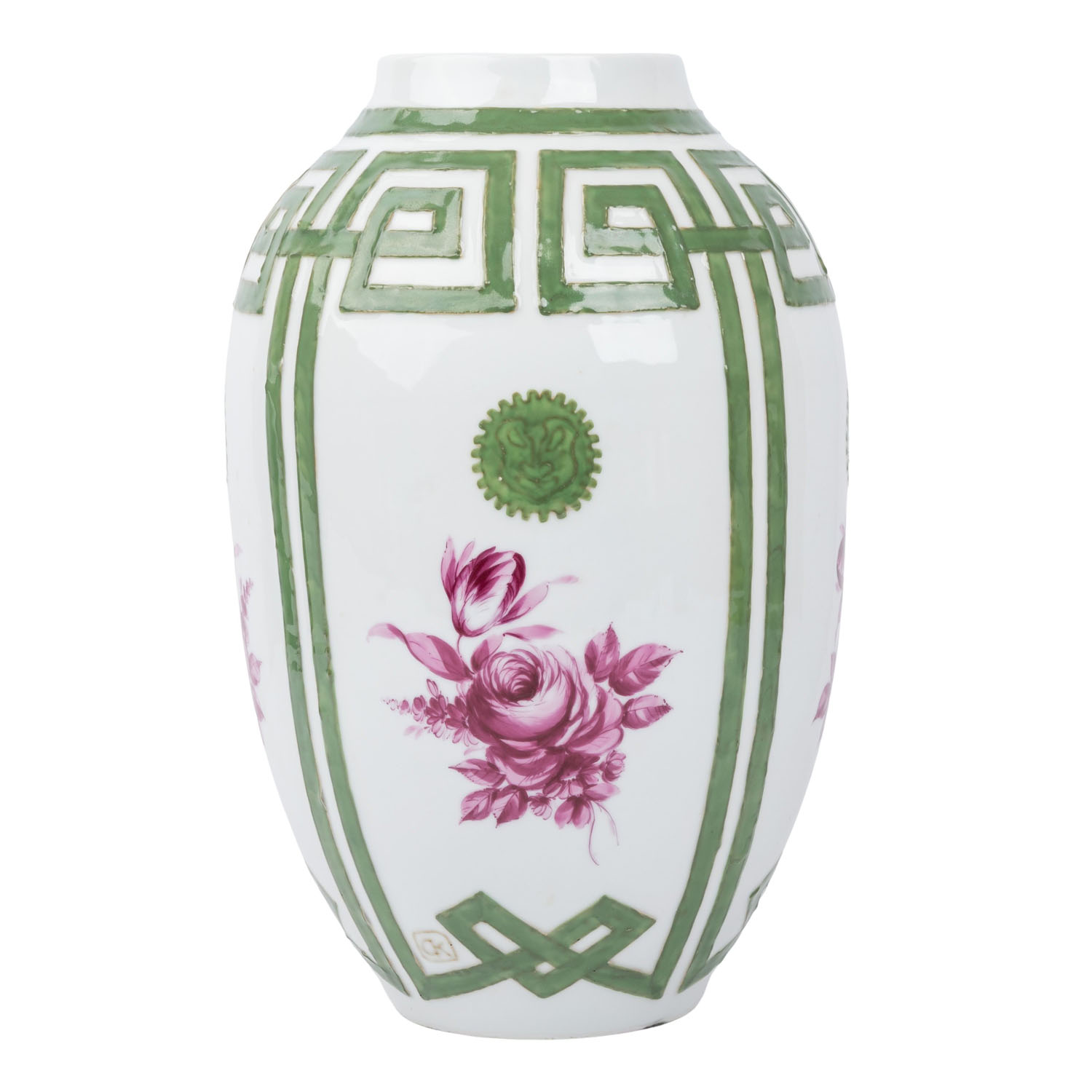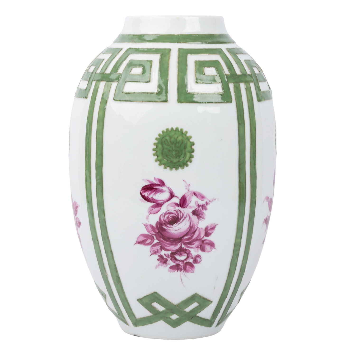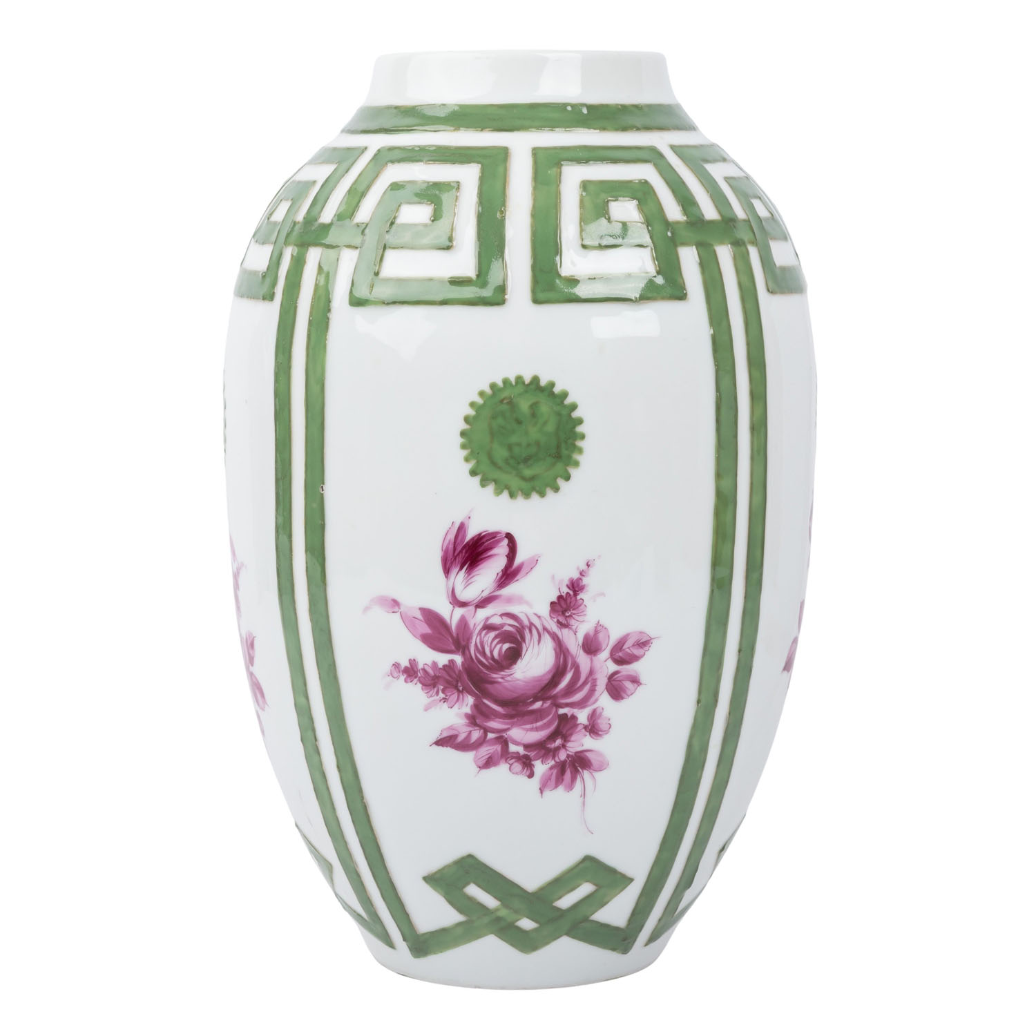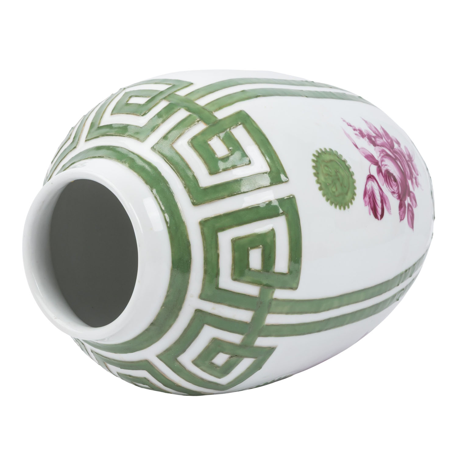 LUDWIGSBURG large vase, 1920-23, egg-shaped, white porcelain with green meander ornamentation and 4 surrounding purple rose bouquets, underside with the blue 'shield mark L', which was mainly used between 1920 and 1923. Height 42 cm, minimal firing hole on the body, glaze flaws, signs of age.