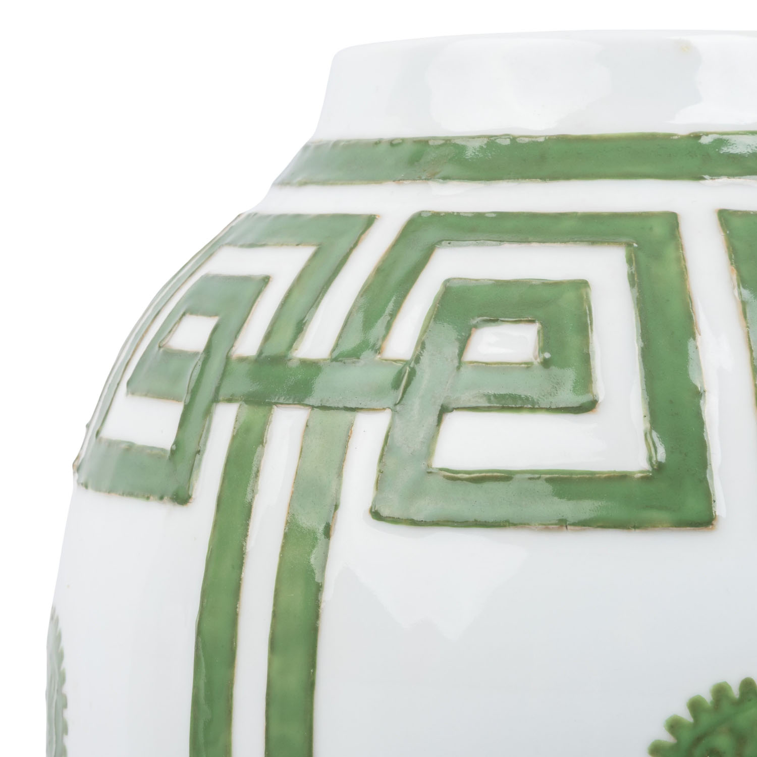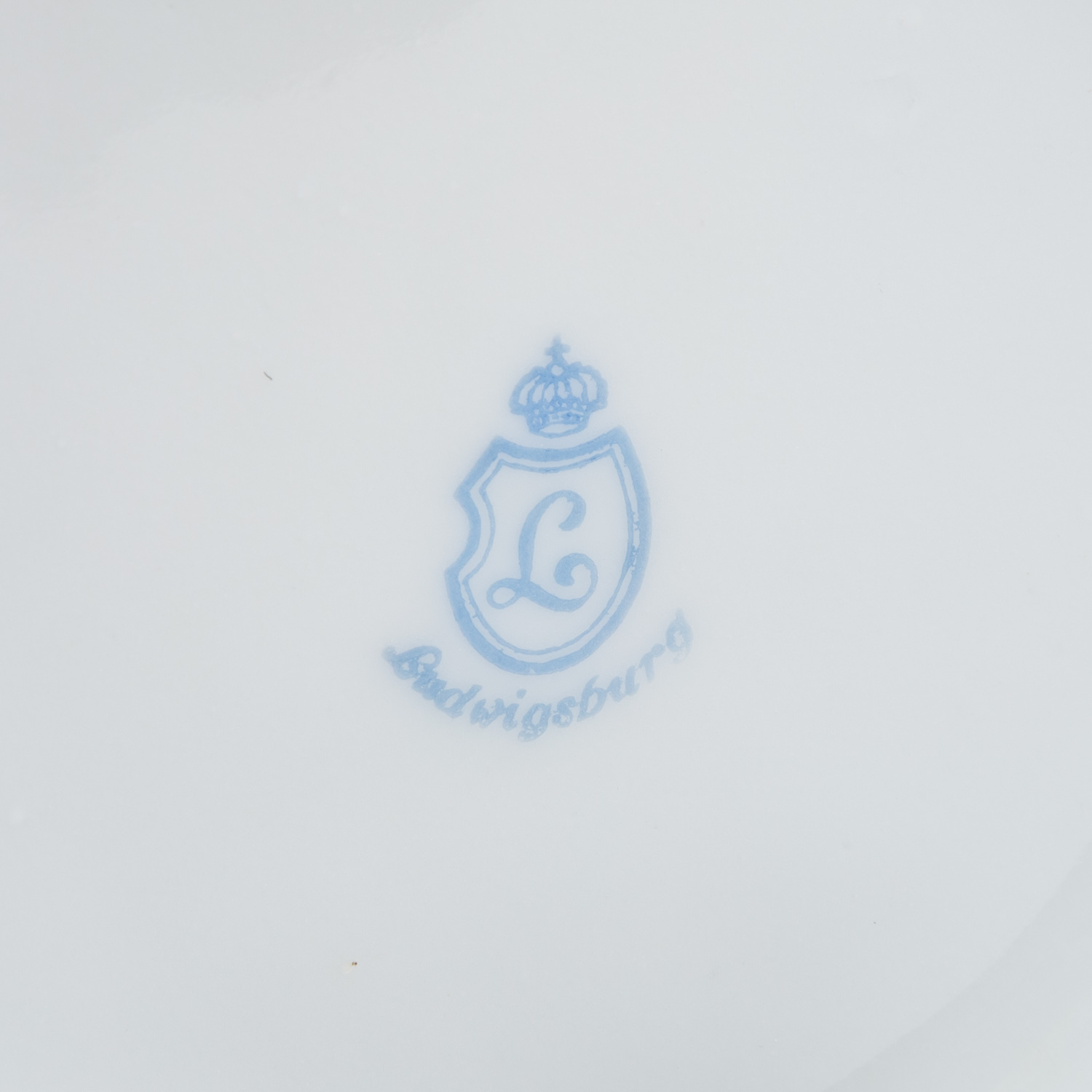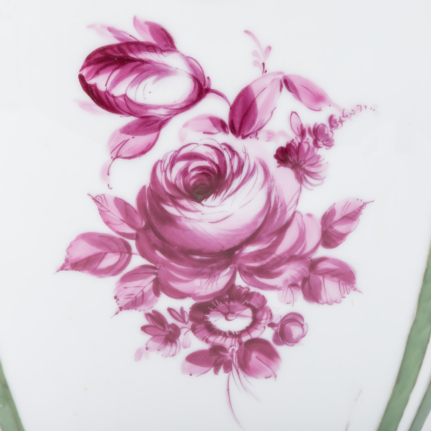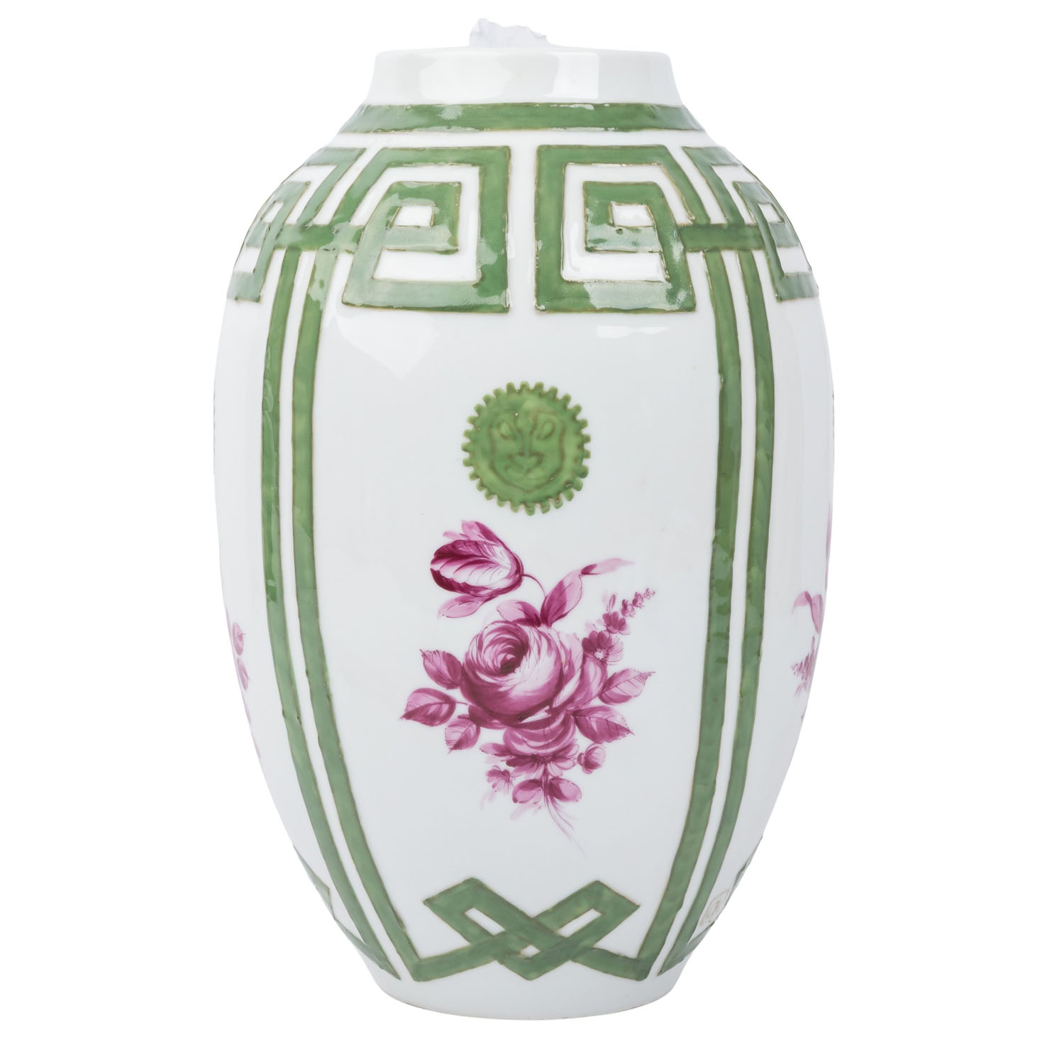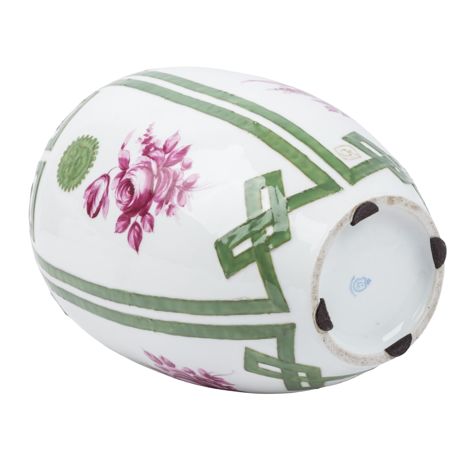 LUDWIGSBURG large vase, 1920-23, egg-shaped, white porcelain with green meander ornamentation and 4 surrounding purple rose bouquets, underside with the blue 'shield mark L', which was mainly used between 1920 and 1923. Height 42 cm, minimal firing hole on the body, glaze flaws, signs of age.