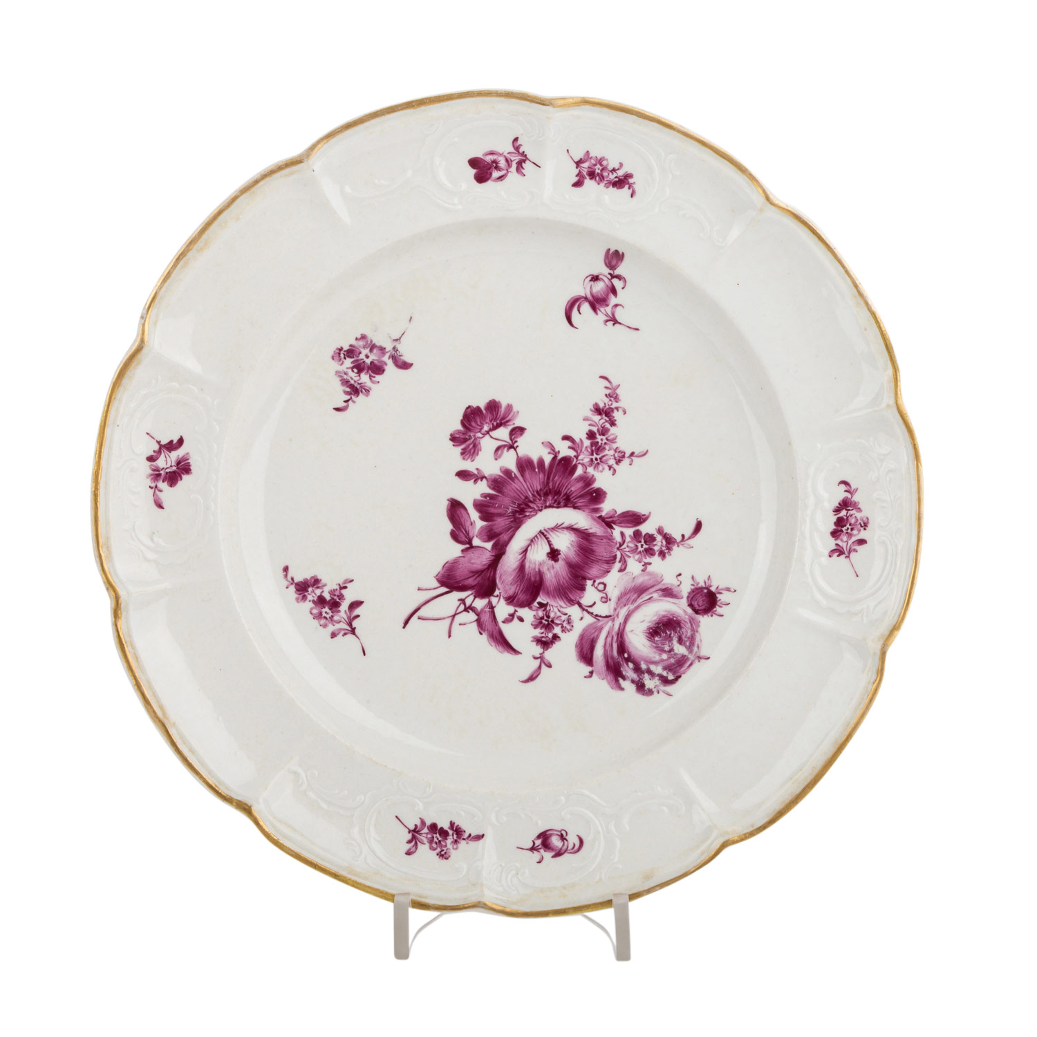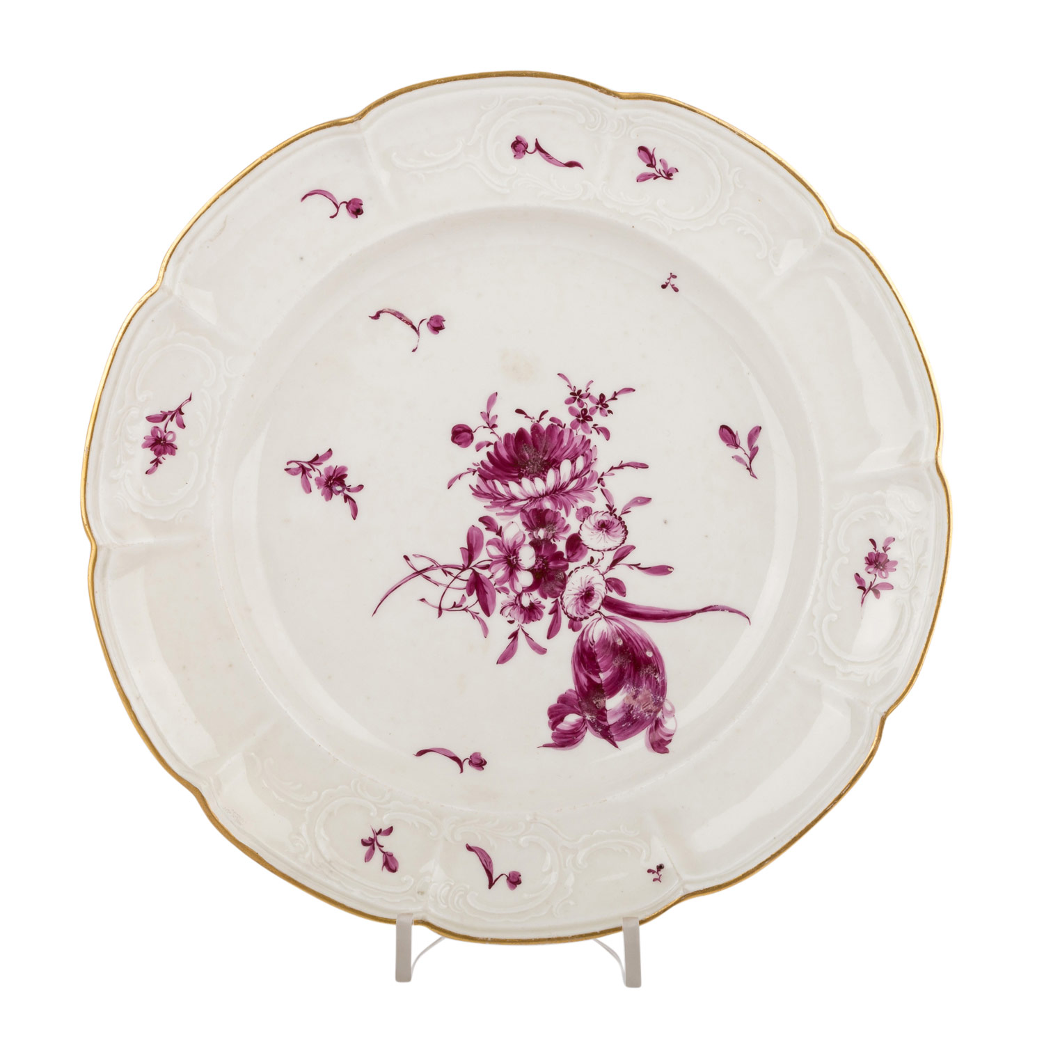 Purple painting of flowers, brands of the 18th century, 1 plate damaged on the reverse side, production mistakes, typical at that time, part. loss of gilding.