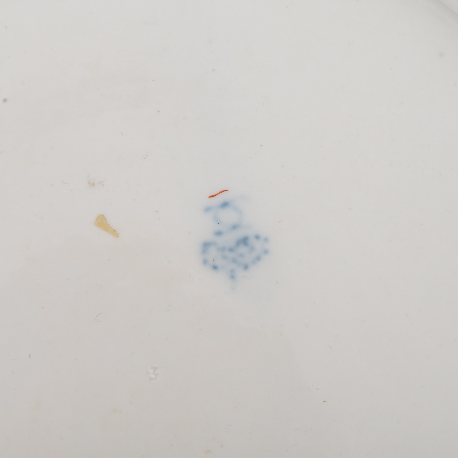 LUDWIGSBURG Round bowl with 2 plates, 1760-1790. purple camaieu flower painting and flag with scattered flowers in relief cartouches, consisting of round bowl, d 30.5 cm and 2 plates, d 24.5 cm each, each with crowned 18th century CC mark and various pressed numbers and letters. pressed numbers and letters, 1x plate with rim and us. Damaged rim, production-related glaze defects and firing marks, part. rubbed.