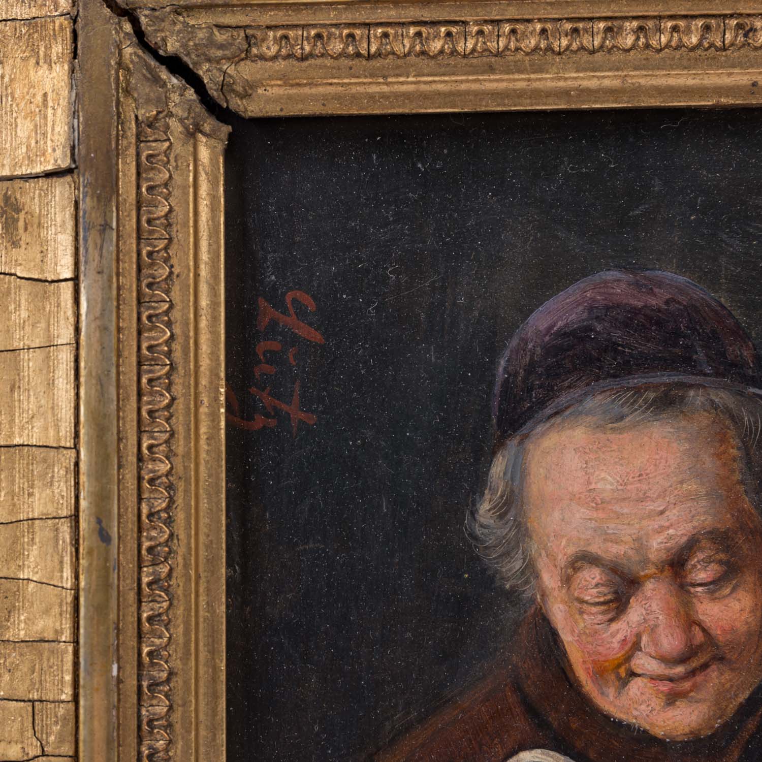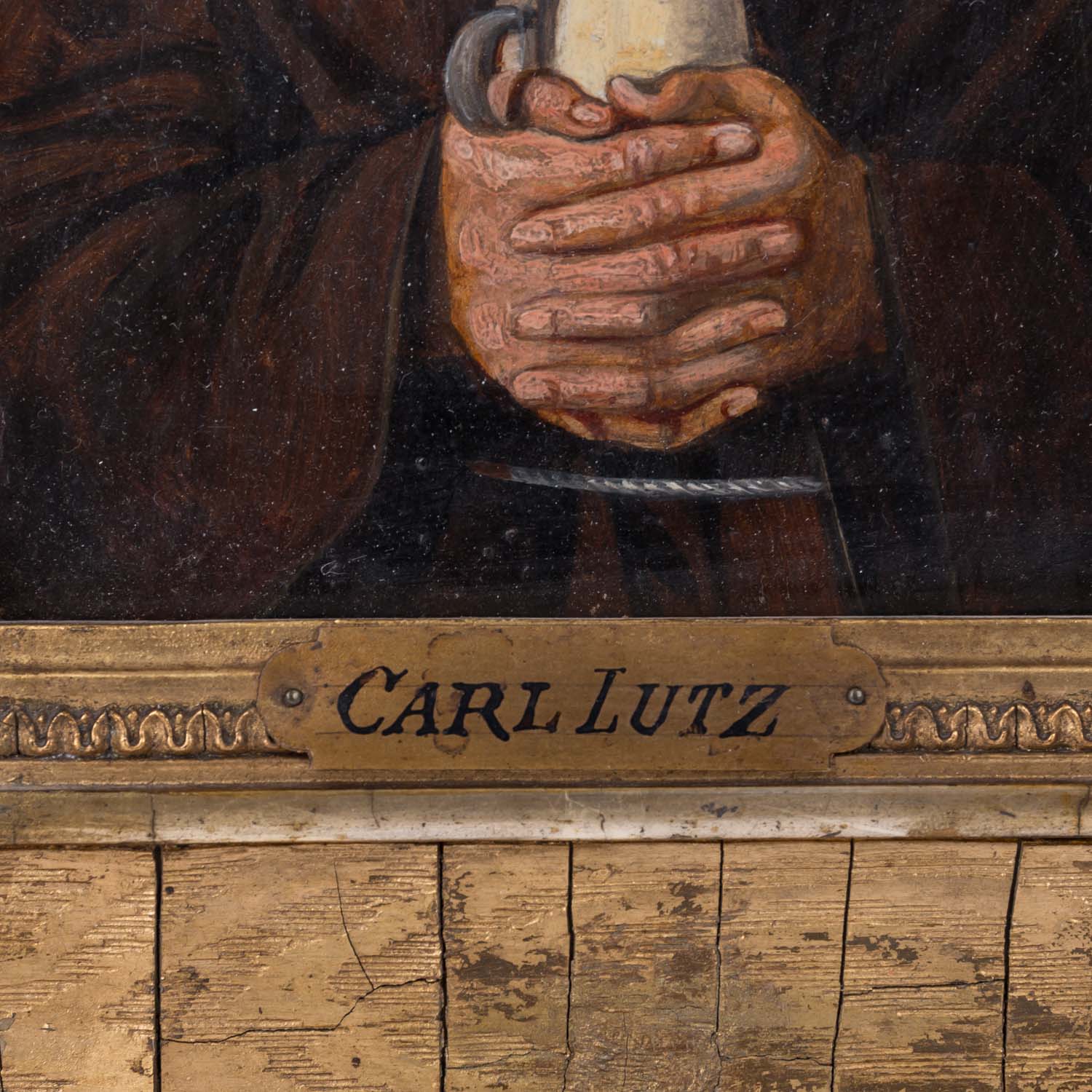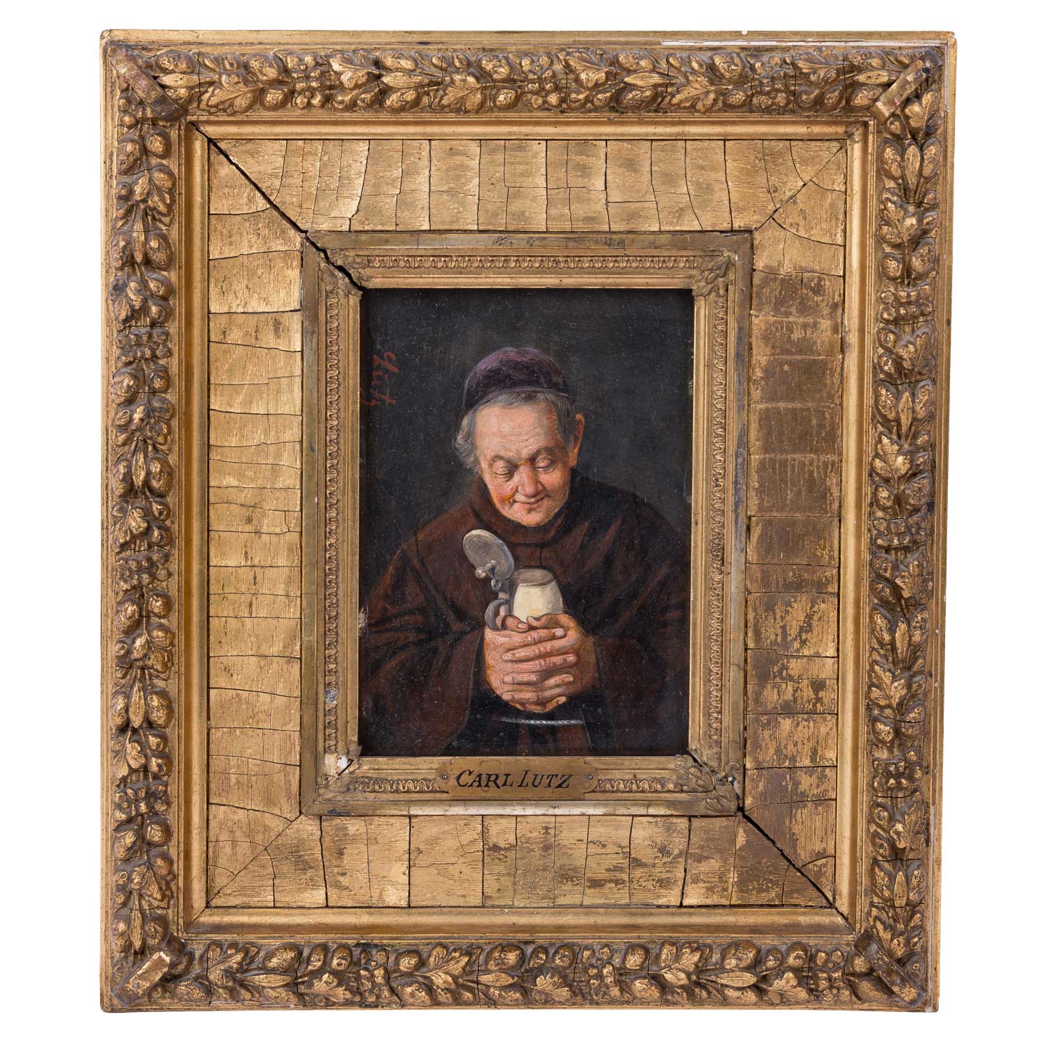 LUTZ, CARL, 'Drinking Monk', Oil on wood, signed in the upper left , HxW: 21/16 (40/34 cm with frame). Traces of age, some retouched losses of colour in the margins.