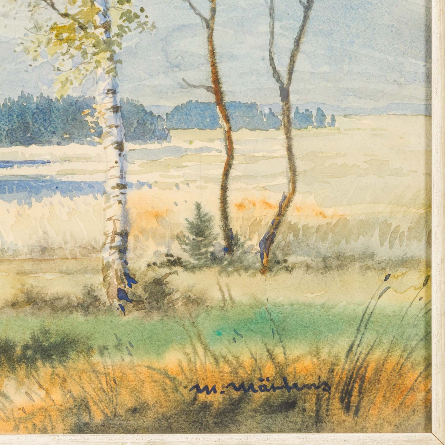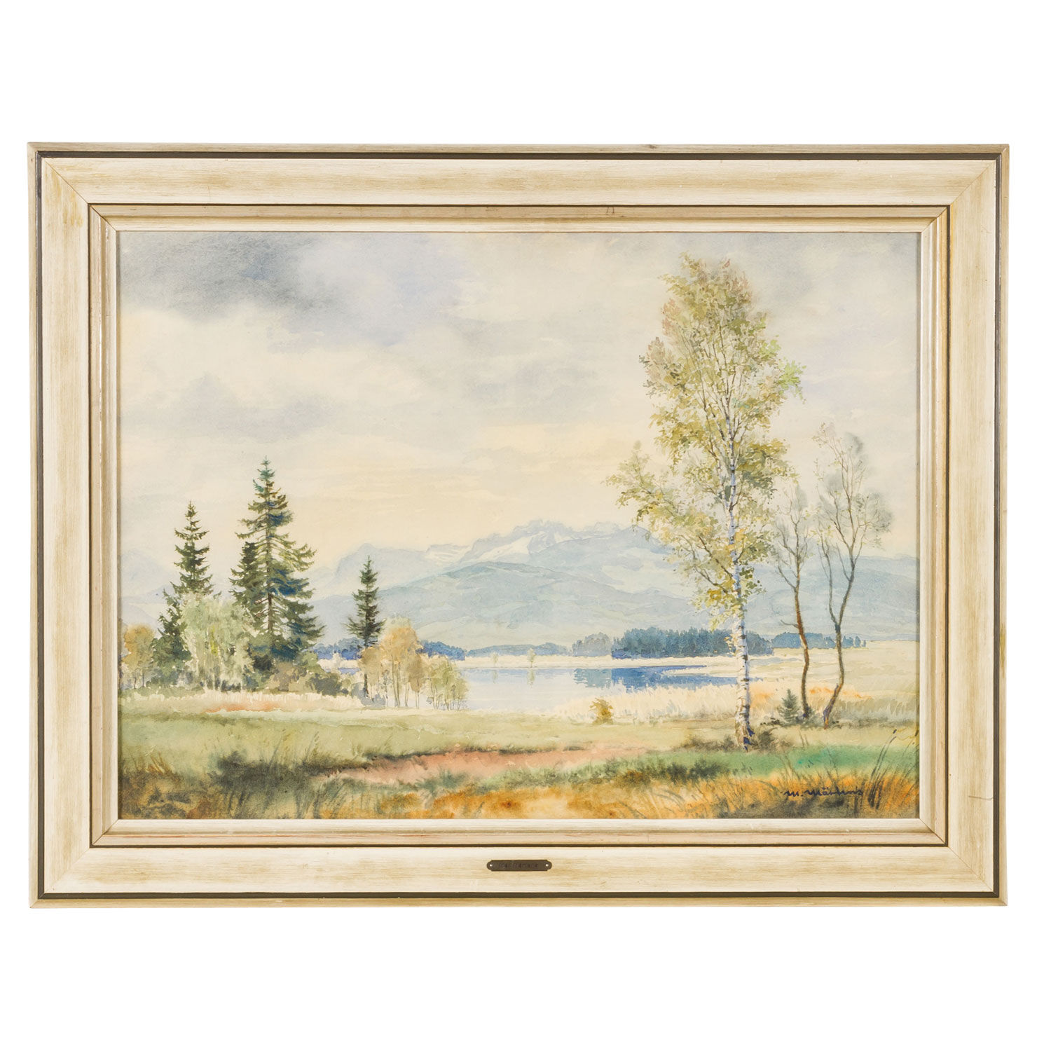 MÄRTENS, MAX (1887-1970), 'Oberbayrische Moorlandschaft mit Blick auf die Kampenwand', signed lower right, watercolour/paper, HxW: approx. 54x74 cm (70x90 cm with frame). Traces of age, browned. With glazed frame. Frame with plaque with artist's name. VERSO label Kunstsalon Abels, Cologne and inscription.