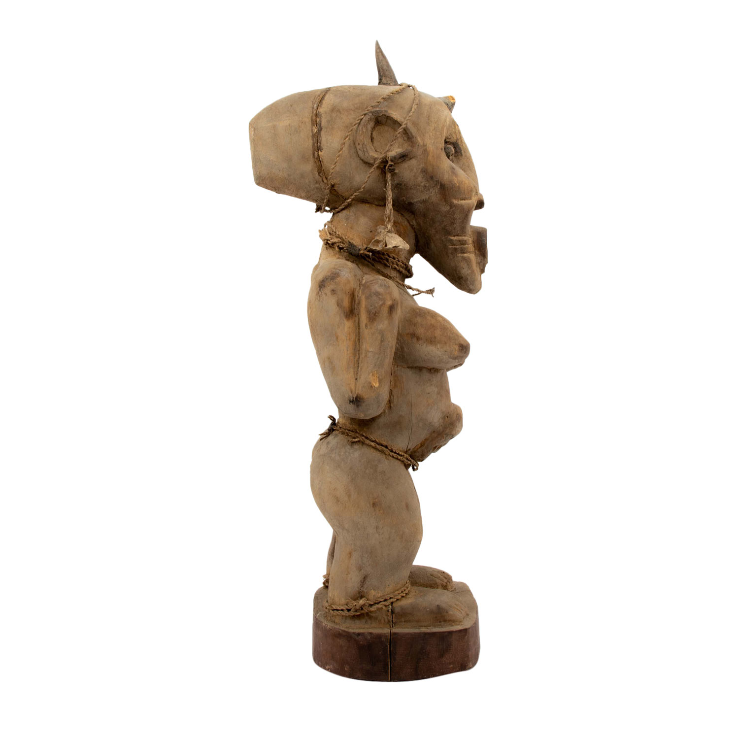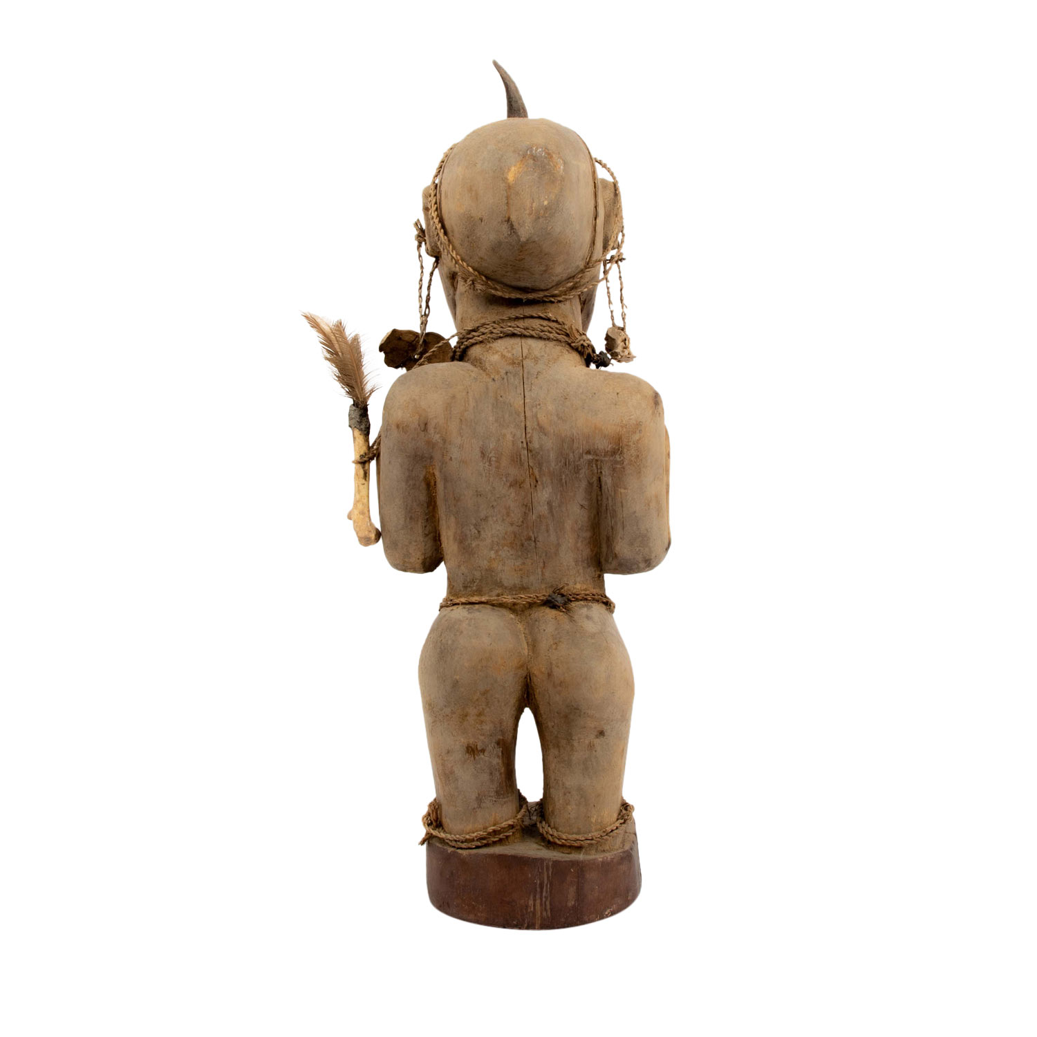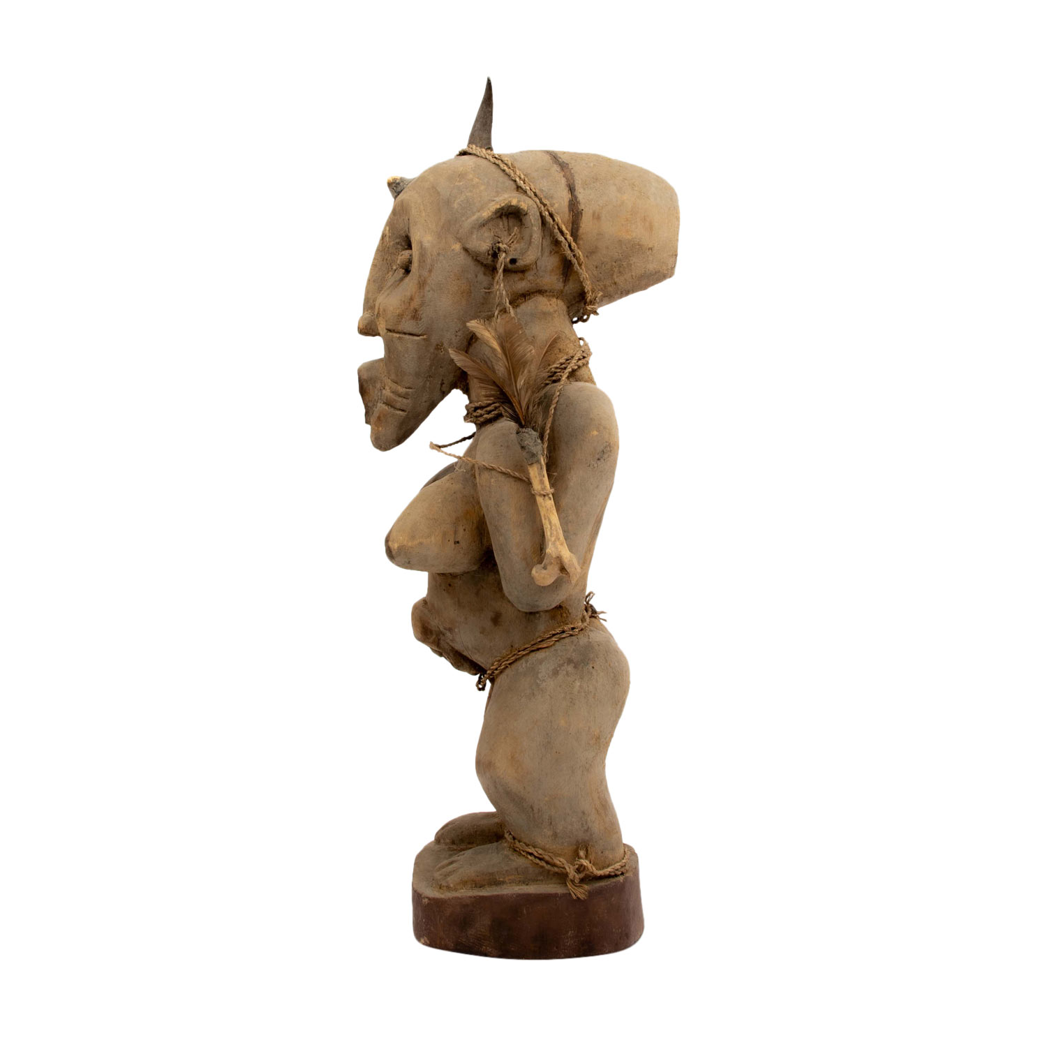 Magic figure ('village fetish') SONGYE/KONGO. The female figure stands on a round base, the arms are bent. On the head there is an animal horn and a tooth. Large round eyes with pupils protruding, the large round mouth is open. There is a face on the belly. The figure is wrapped with cords to which are attached a bone, feathers, a piece of animal jaw and the part of a dried mushroom. Patina, signs of age.
