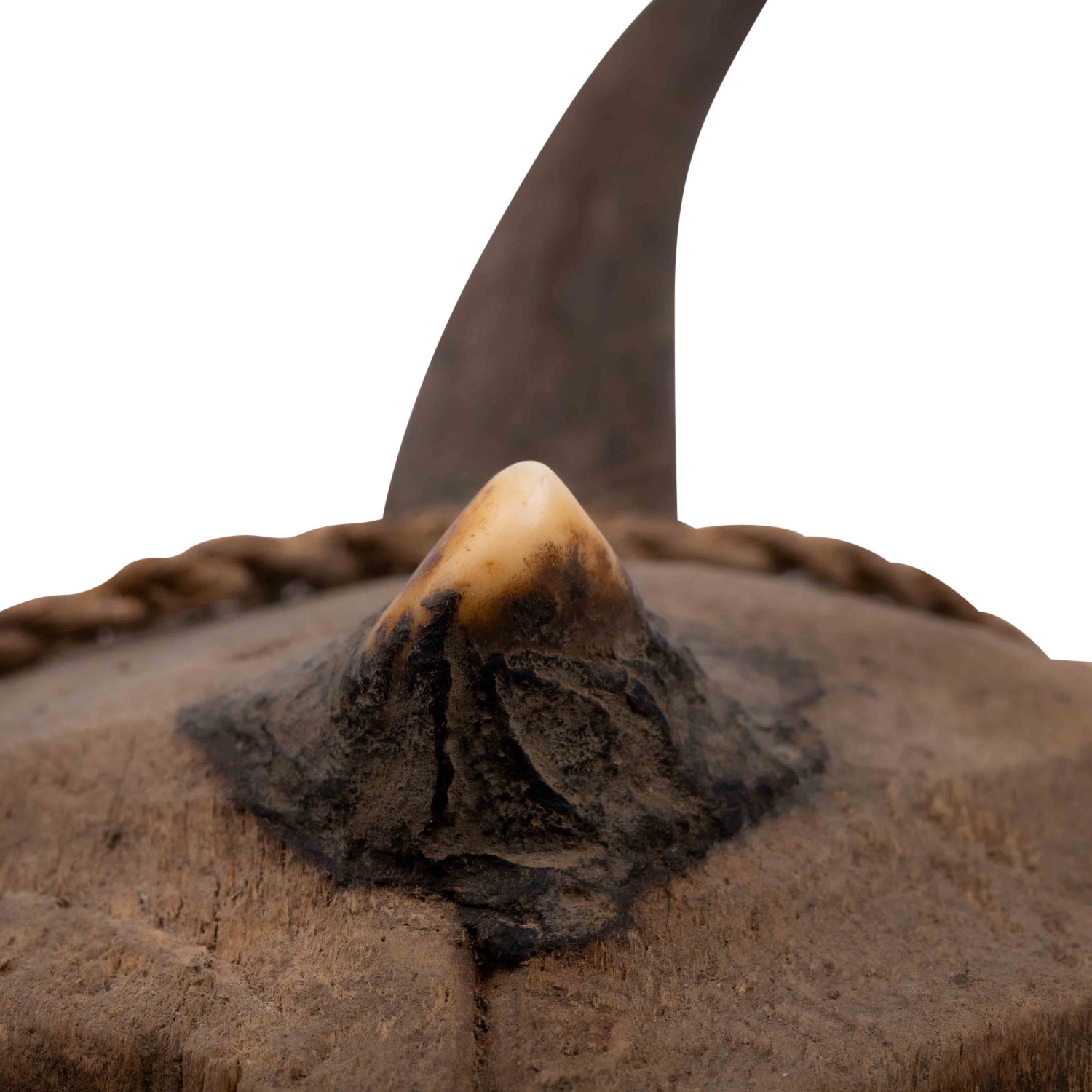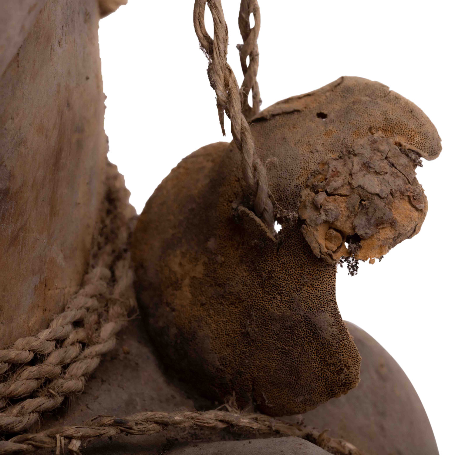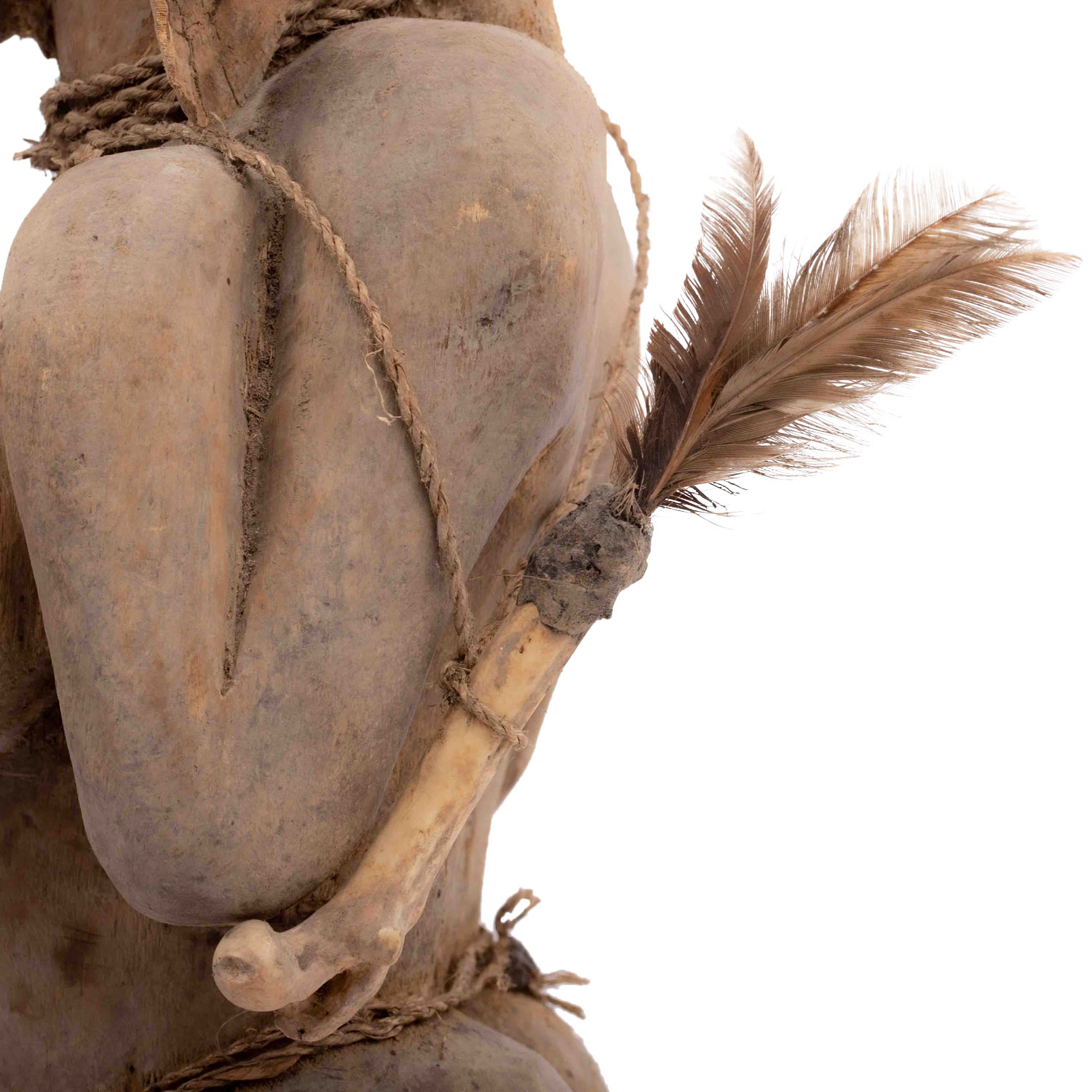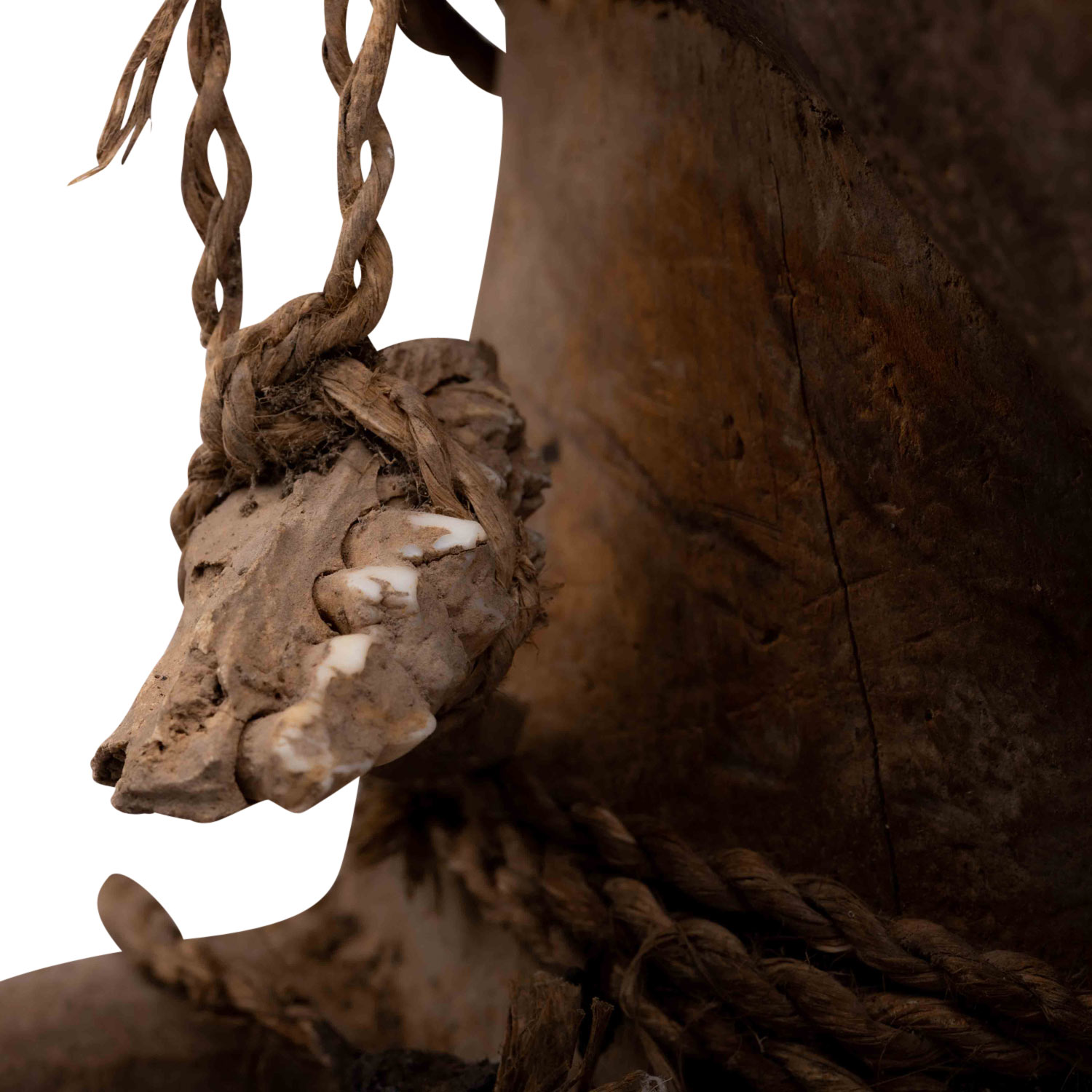 Magic figure ('village fetish') SONGYE/KONGO. The female figure stands on a round base, the arms are bent. On the head there is an animal horn and a tooth. Large round eyes with pupils protruding, the large round mouth is open. There is a face on the belly. The figure is wrapped with cords to which are attached a bone, feathers, a piece of animal jaw and the part of a dried mushroom. Patina, signs of age.