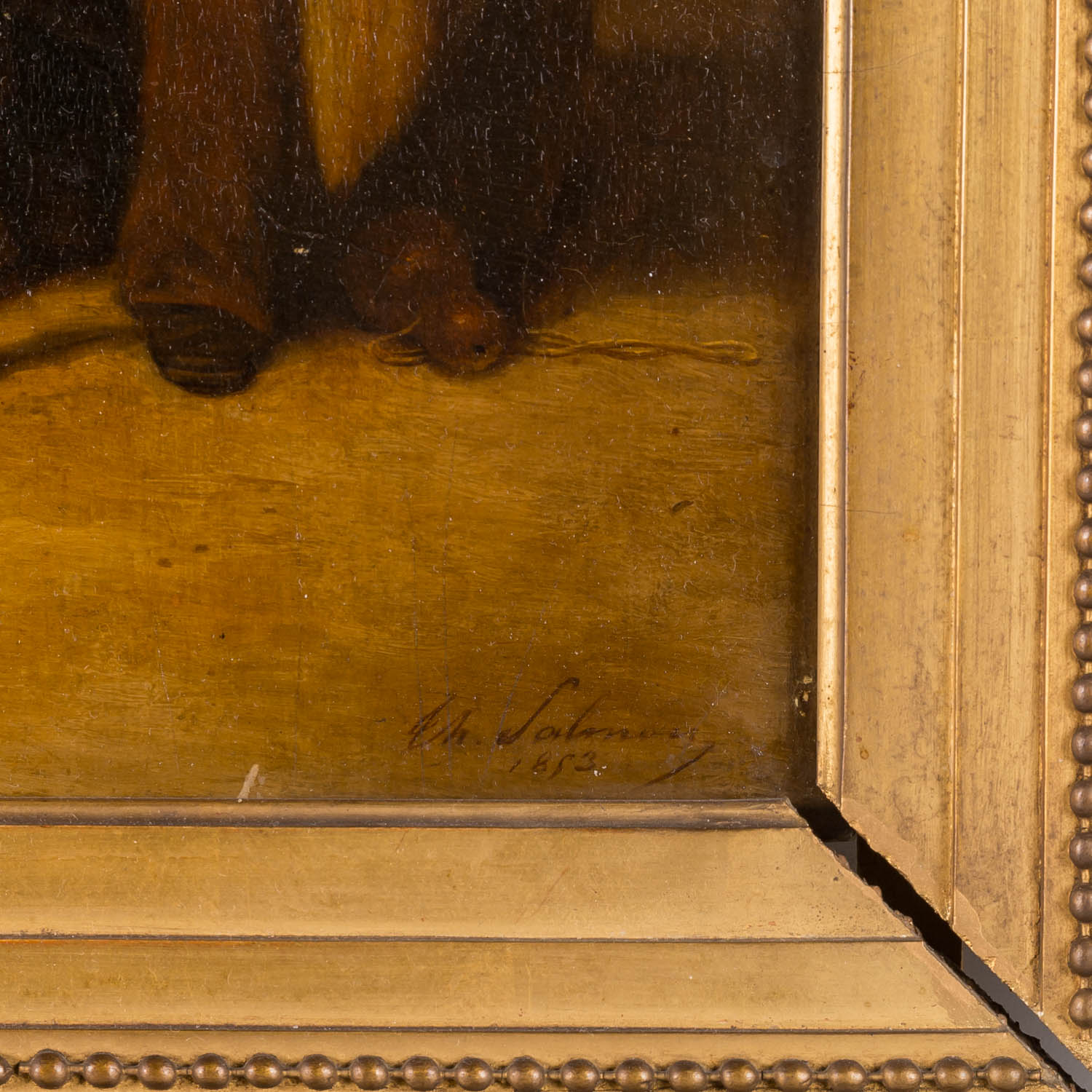 Painter of the 19th century, 'In the tavern', 1853, illegibly signed lower right: ‘Ch. Salomon [?]’ and dated: 1853. Oil on panel, hxw: approx. 40 x 32 cm (hxw frame: approx. 66 x 58 cm). Traces of age and rubbing, craquelure, partial colour defects. With frame (slight damage).