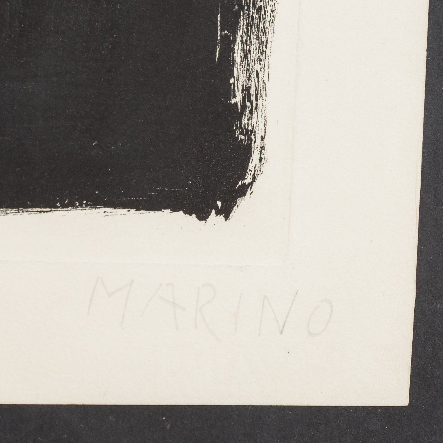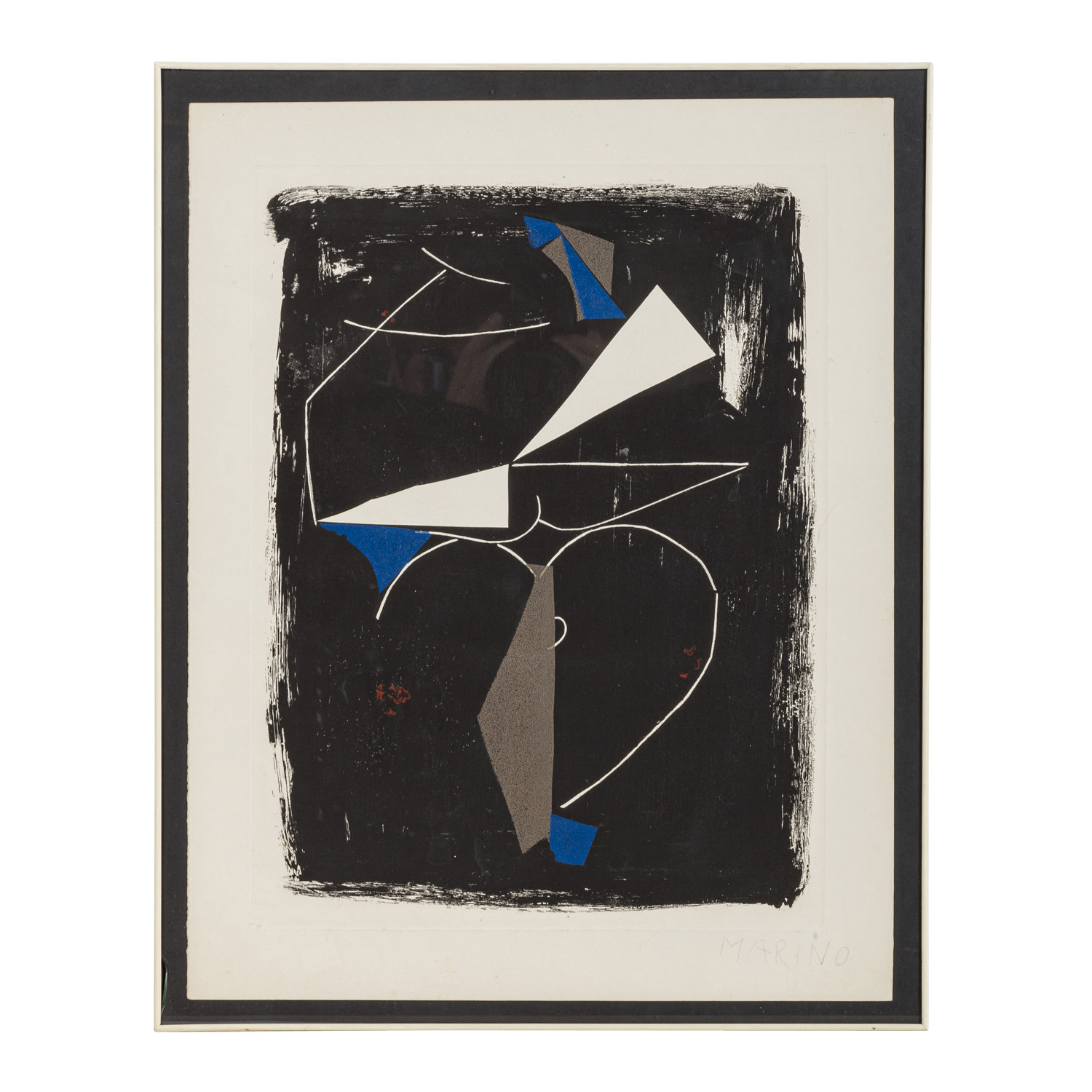 MARINI, MARINO, attributed (Pistoia 1901-1980 Viareggio), ""untitled"", abstract composition in front of black ground, color lithograph/paper, inscribed 'MARINO"" in pencil lower right, HxW: plate ca. 40x30 cm, sheet ca. 47x37 cm, outer frame dimensions ca. 50x40 cm. Slightly browned and stained. With glazed frame (crack at the edge). Traces of age.