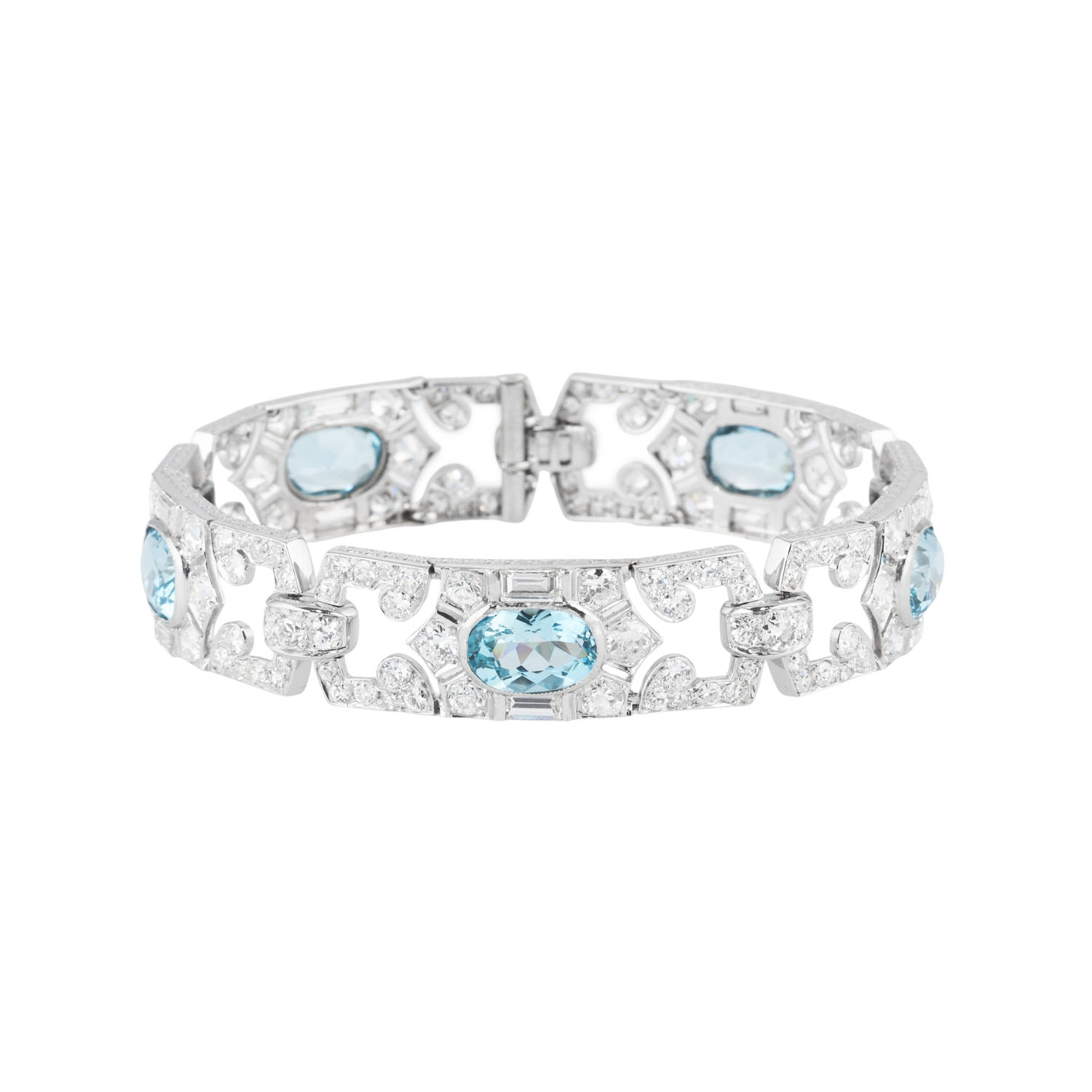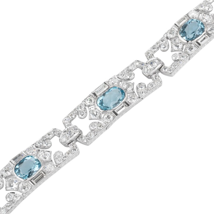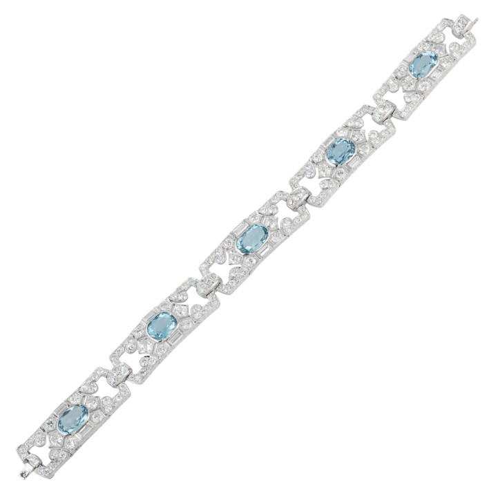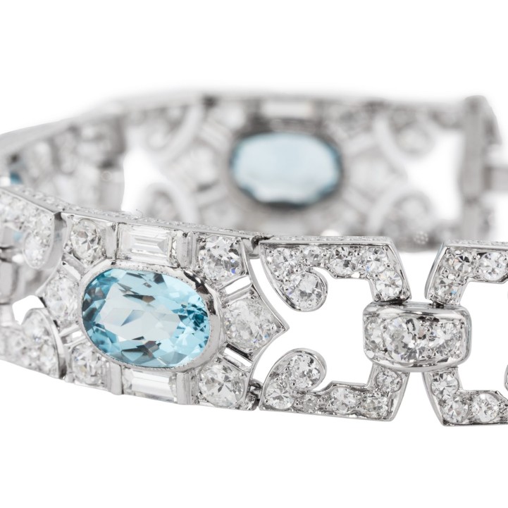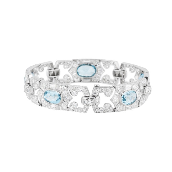 MAUBOUSSIN Art Deco bracelet with 5 aquamarines and 175 diamonds in various cuts, total ca. 12 ct, RW-WHITE (G-H)/VS-SI, platinum, 28.9 g, L: 18.5 cm, signed ‘MAUBOUSSIN FRANCE’.