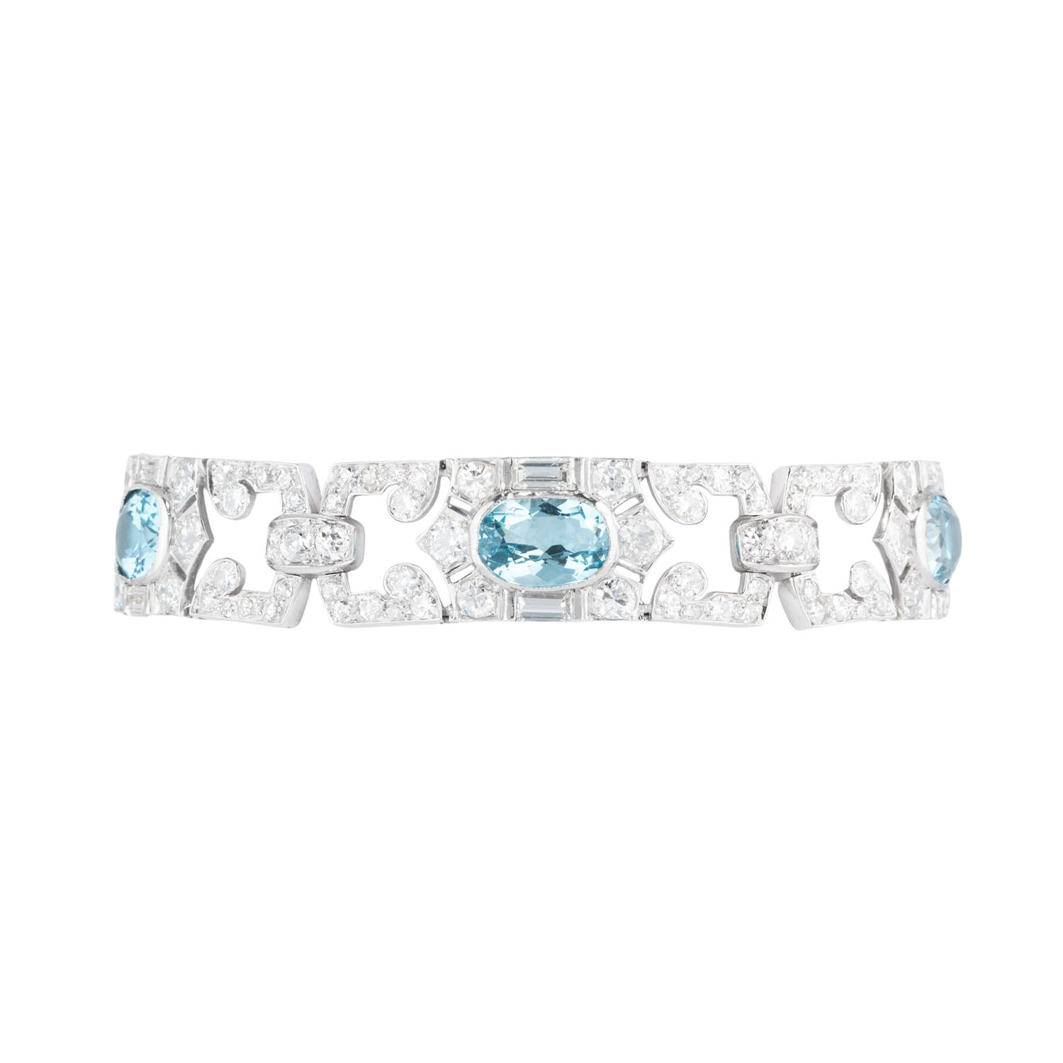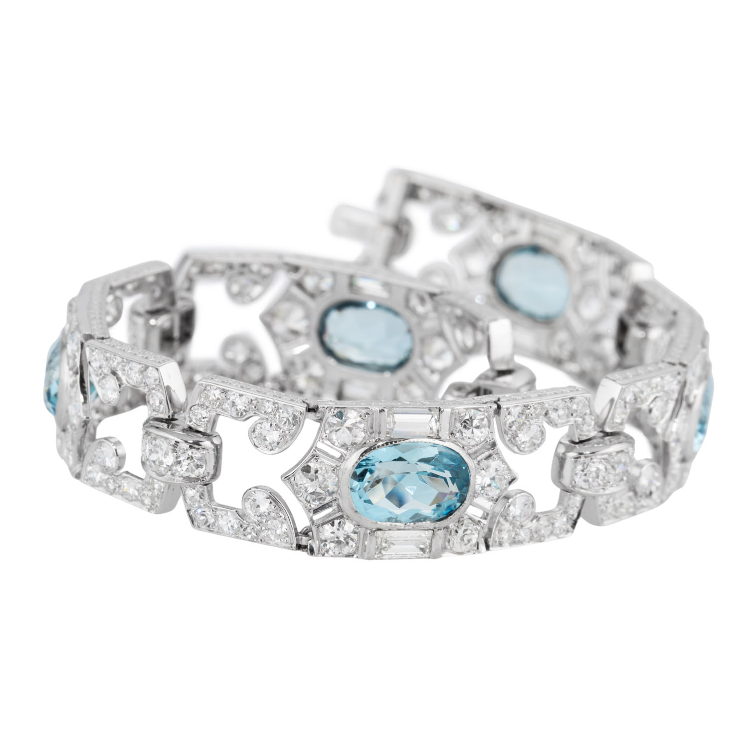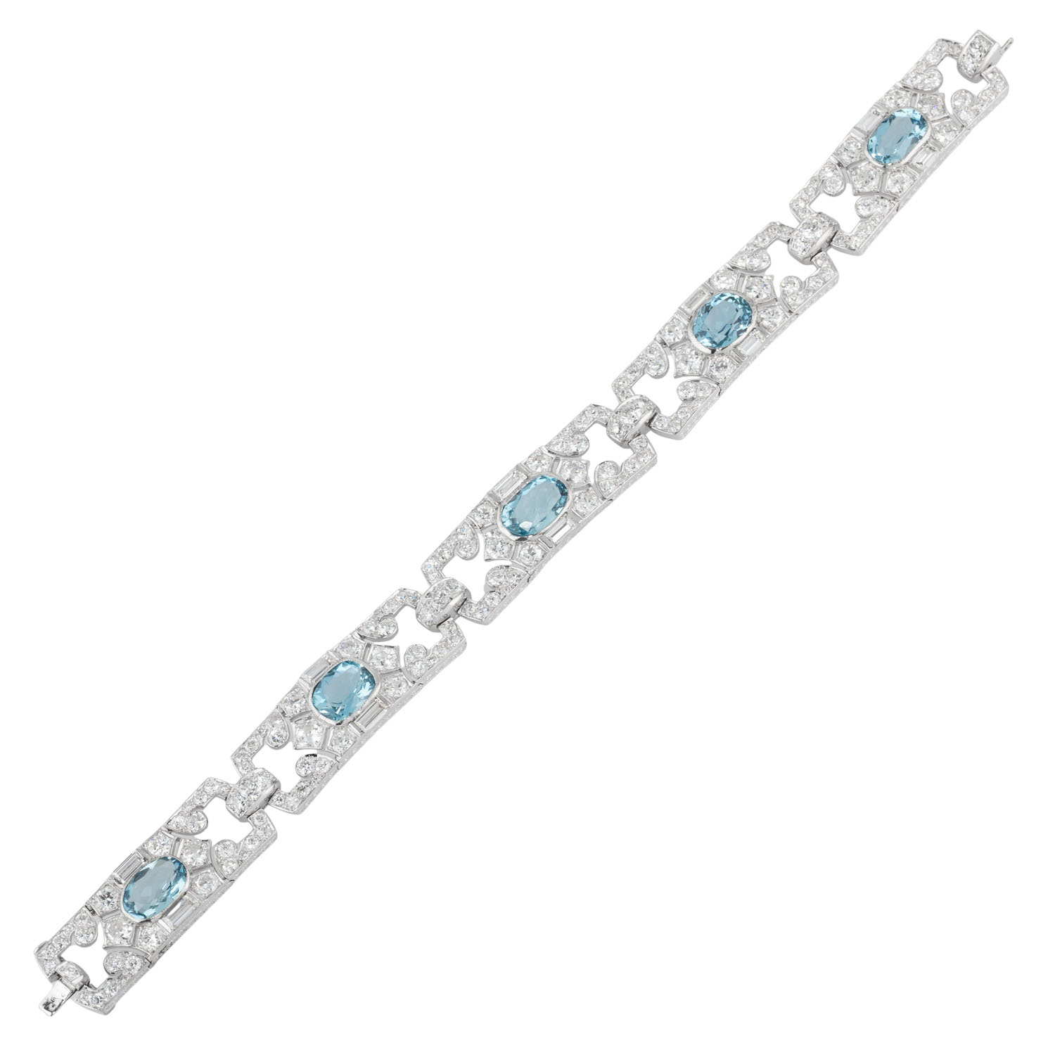 MAUBOUSSIN Art Deco bracelet with 5 aquamarines and 175 diamonds in various cuts, total ca. 12 ct, RW-WHITE (G-H)/VS-SI, platinum, 28.9 g, L: 18.5 cm, signed ‘MAUBOUSSIN FRANCE’.