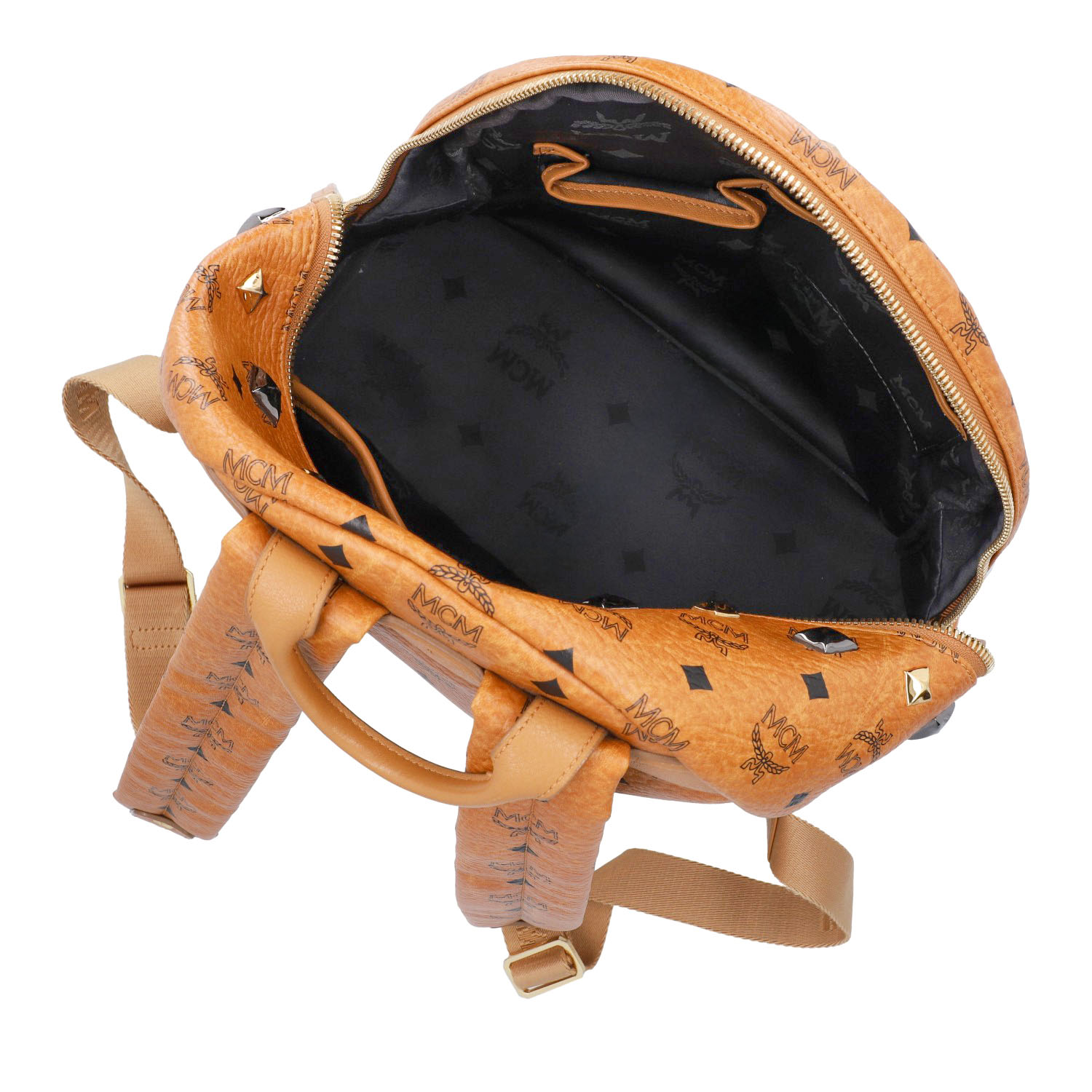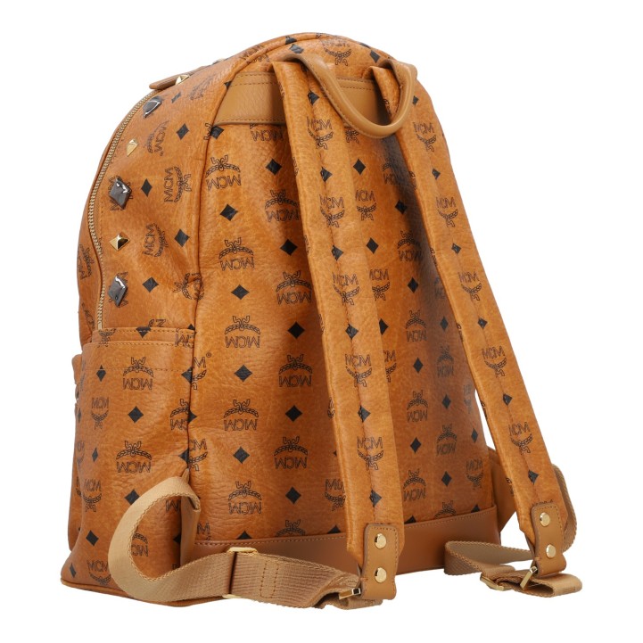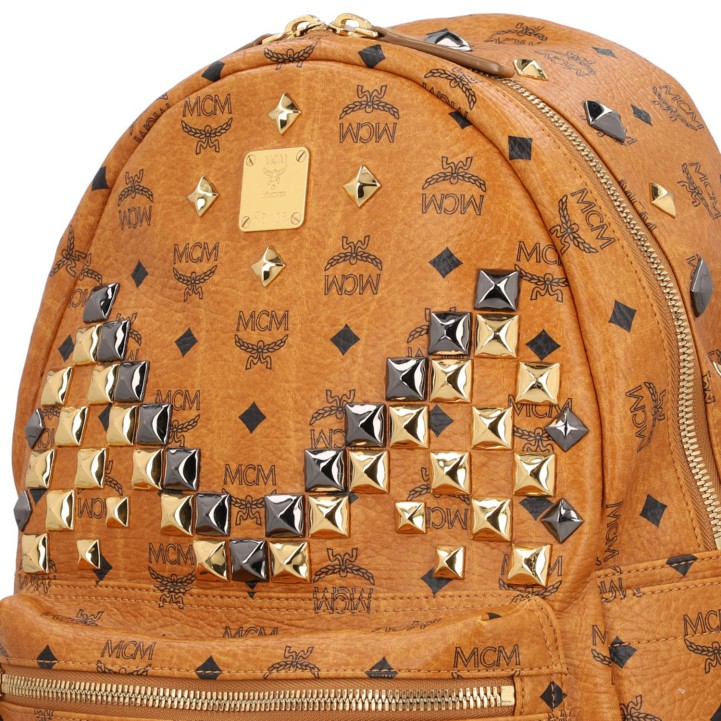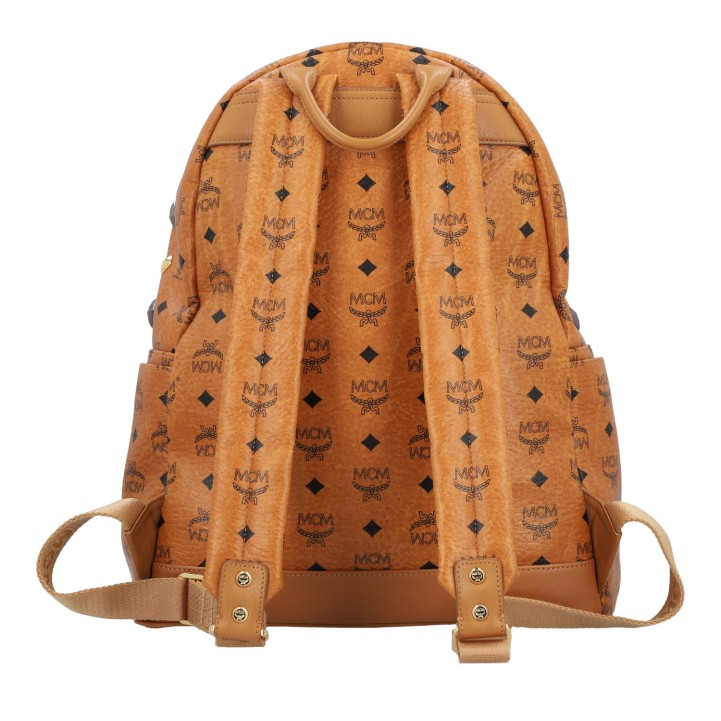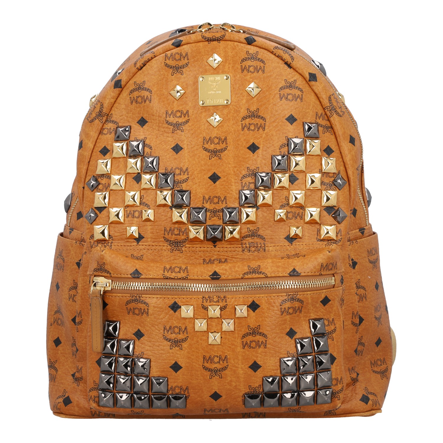 MCM “STARK” backpack. Visetos series in cognac colors with leather details, gold-colored hardware, and two-tone studded trim. Classic model with textile lining. Slight abrasion and slight signs of wear. 33x20x40cm.