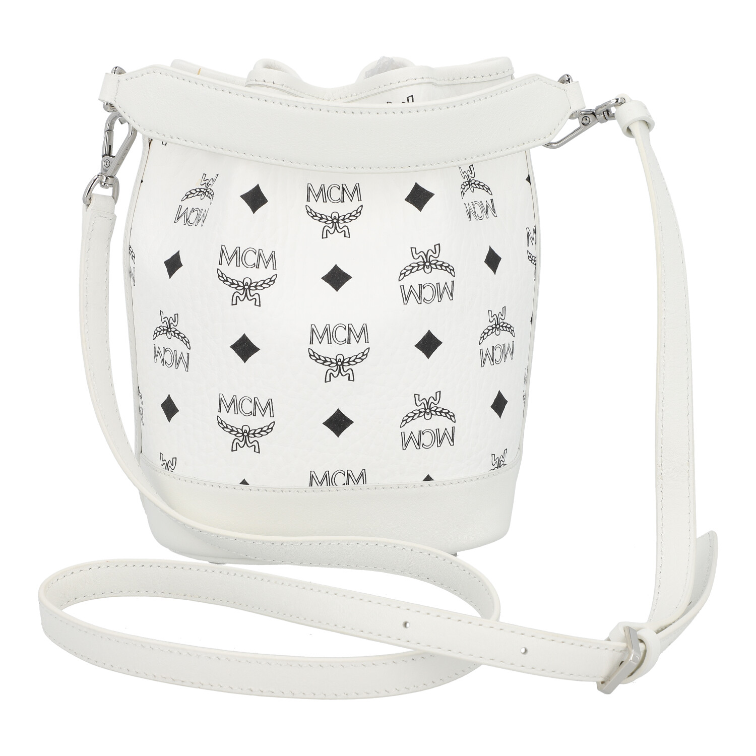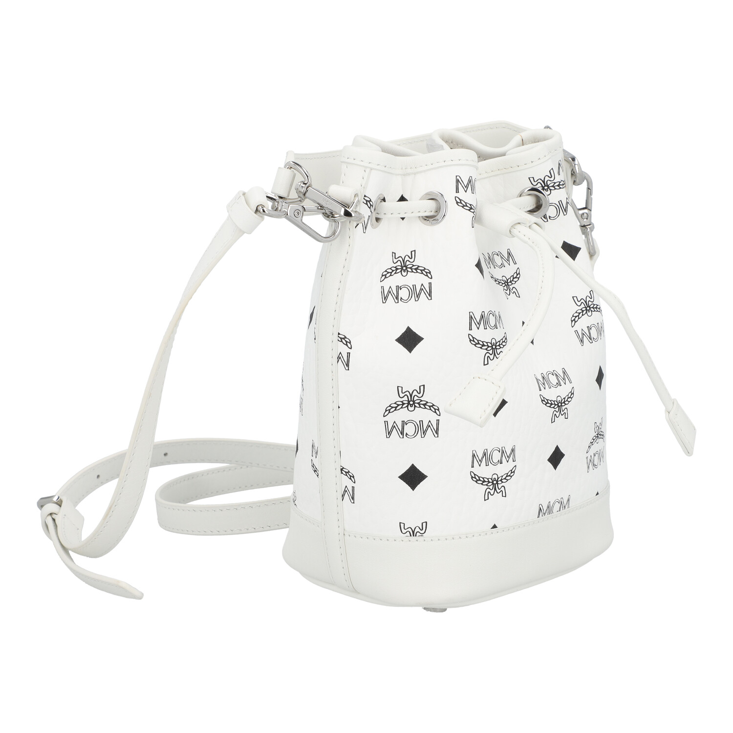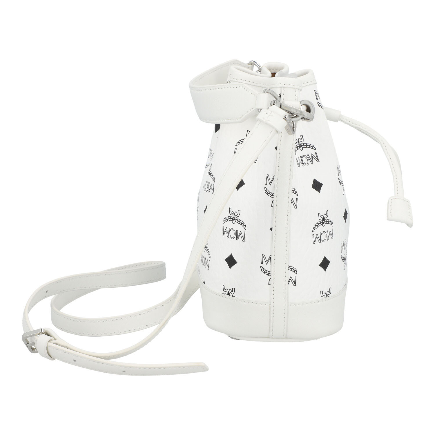 MCM shoulder bag ‘DESSAU MINI’, retail price: €830. Visetos monogram canvas in white with silver-coloured hardware, leather drawstring fastening, two detachable shoulder straps of different lengths. Very good condition. 10 x 14 x 20 cm.