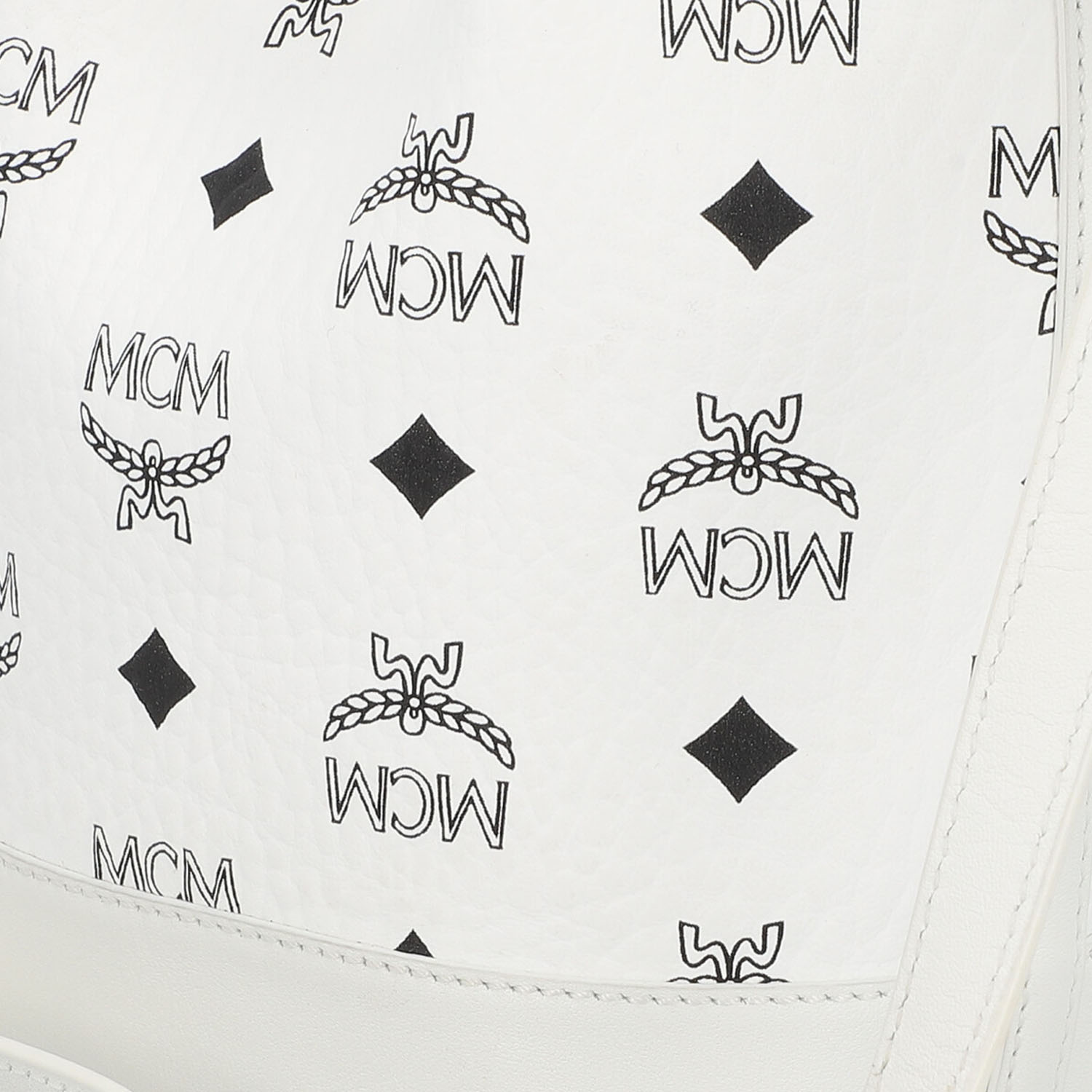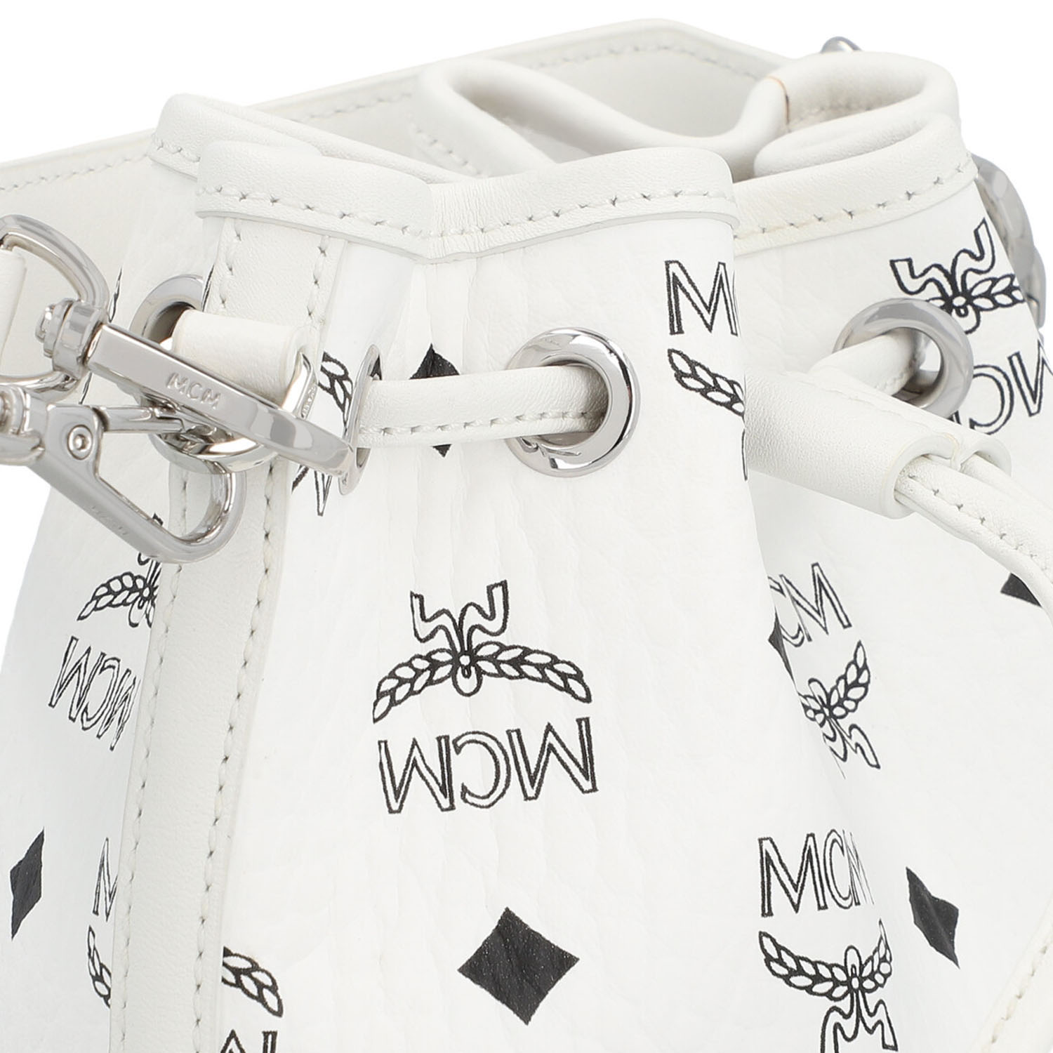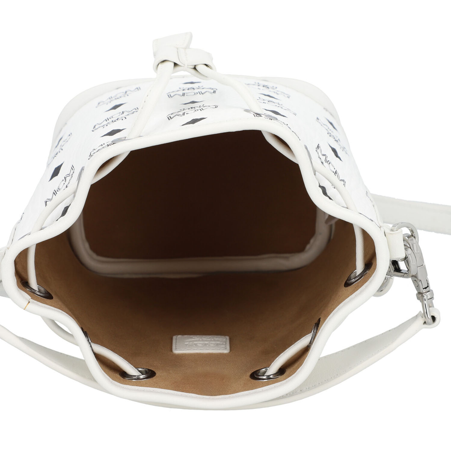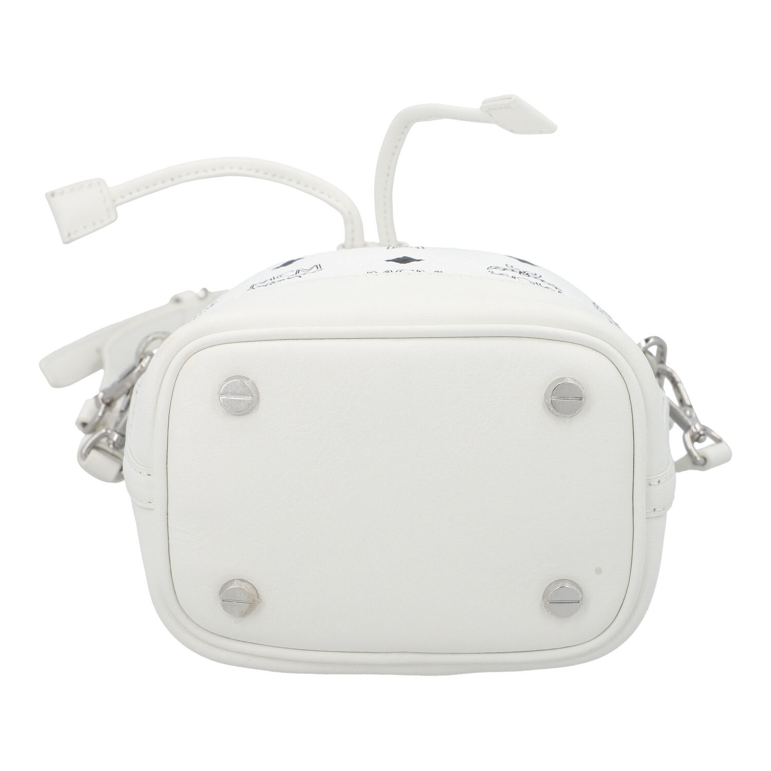 MCM shoulder bag ‘DESSAU MINI’, retail price: €830. Visetos monogram canvas in white with silver-coloured hardware, leather drawstring fastening, two detachable shoulder straps of different lengths. Very good condition. 10 x 14 x 20 cm.