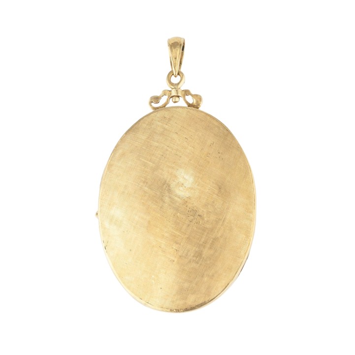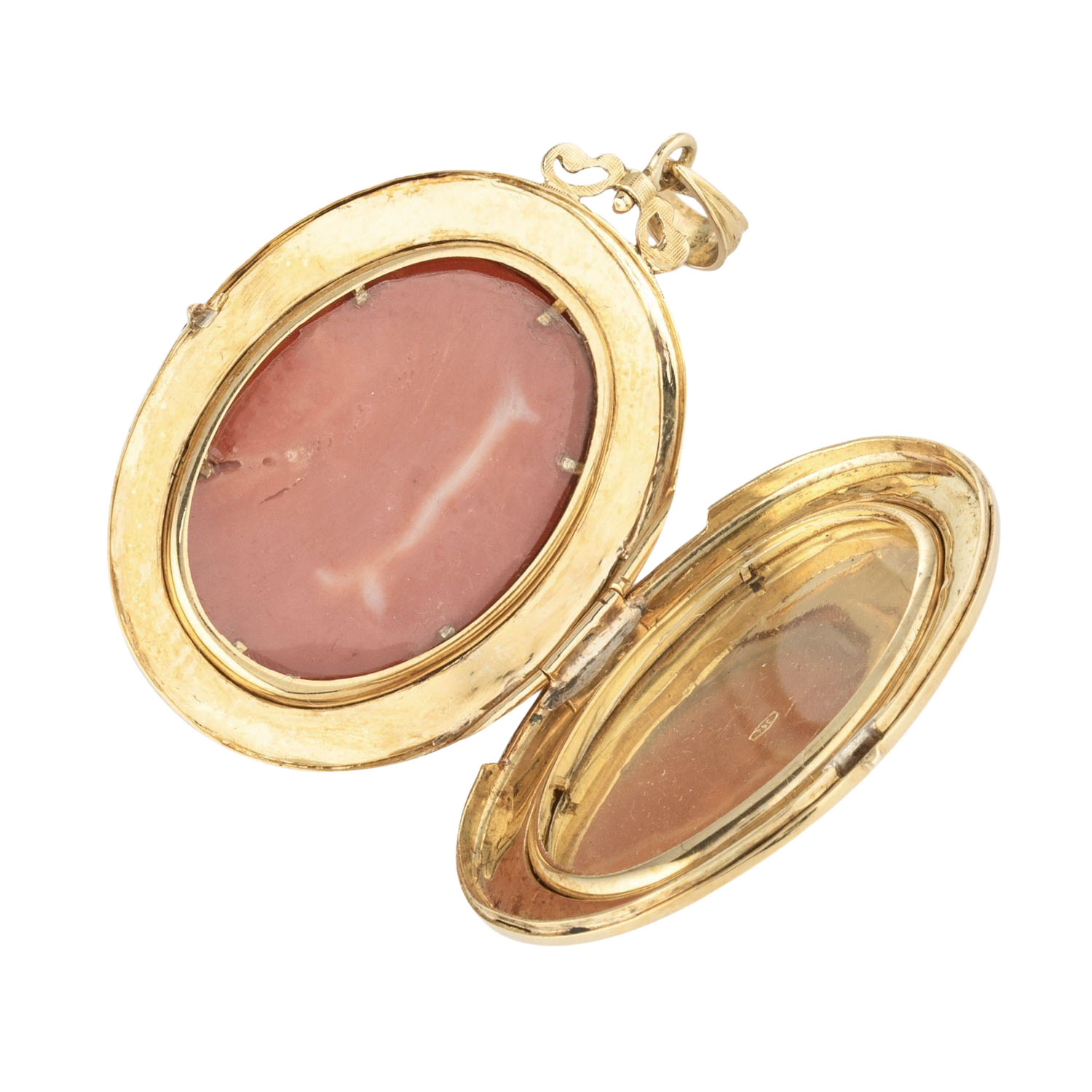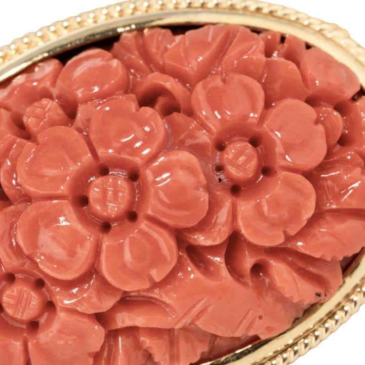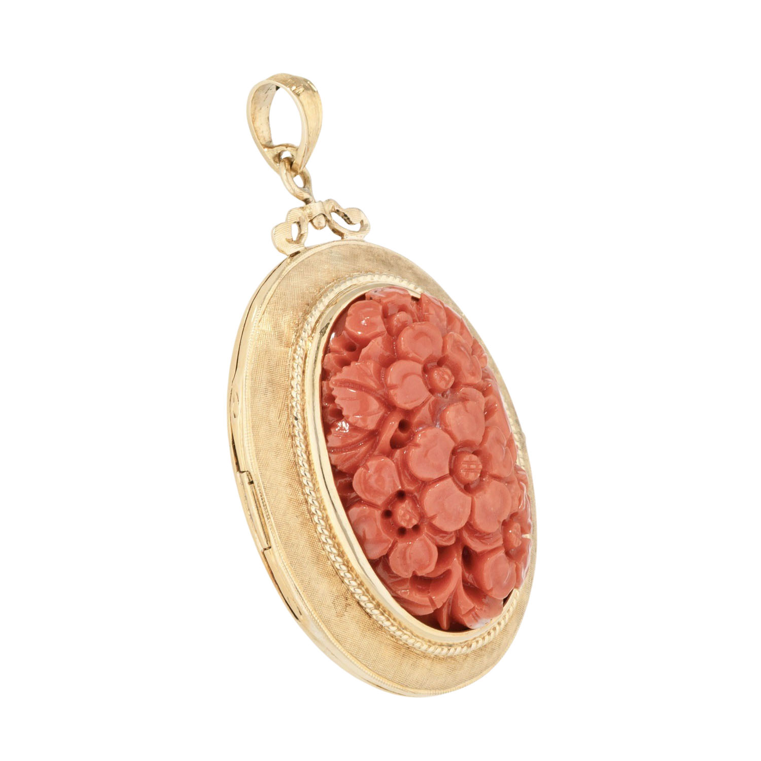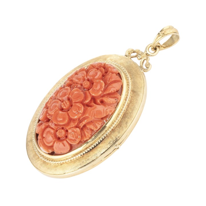 Medaillon pendant with floral carved coral, 18K yellow gold, 25.9 g, 5.5x3.2 cm, folds open with 2 photo frames, 20th century, minor signs of wear, beautiful craftsmanship with hand-engraved satinized surface and fine coral carving. NO SHIPPING OUTSIDE THE EU!