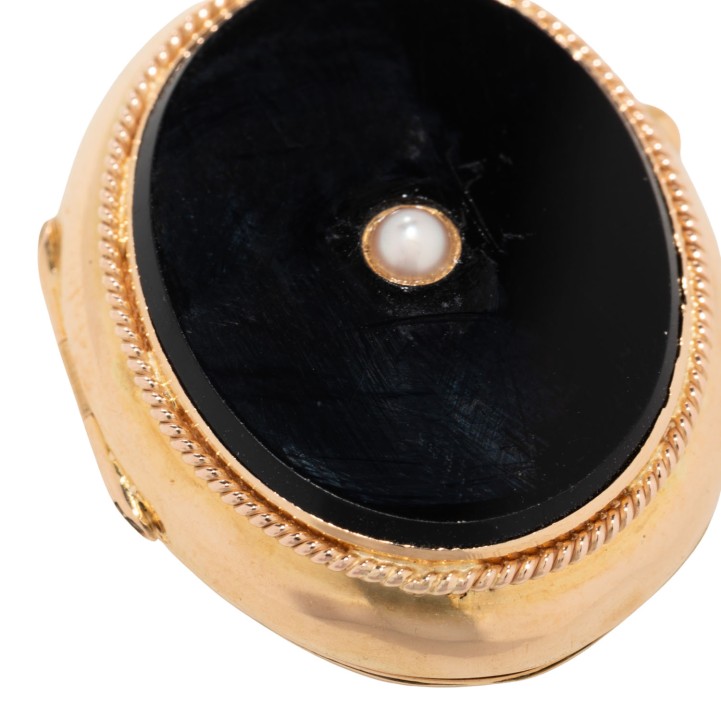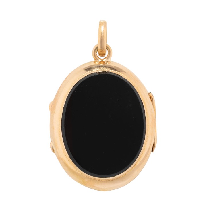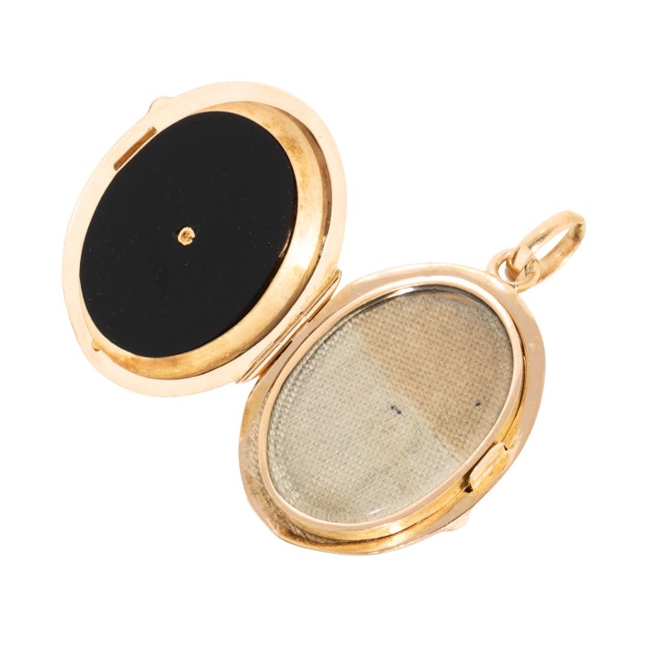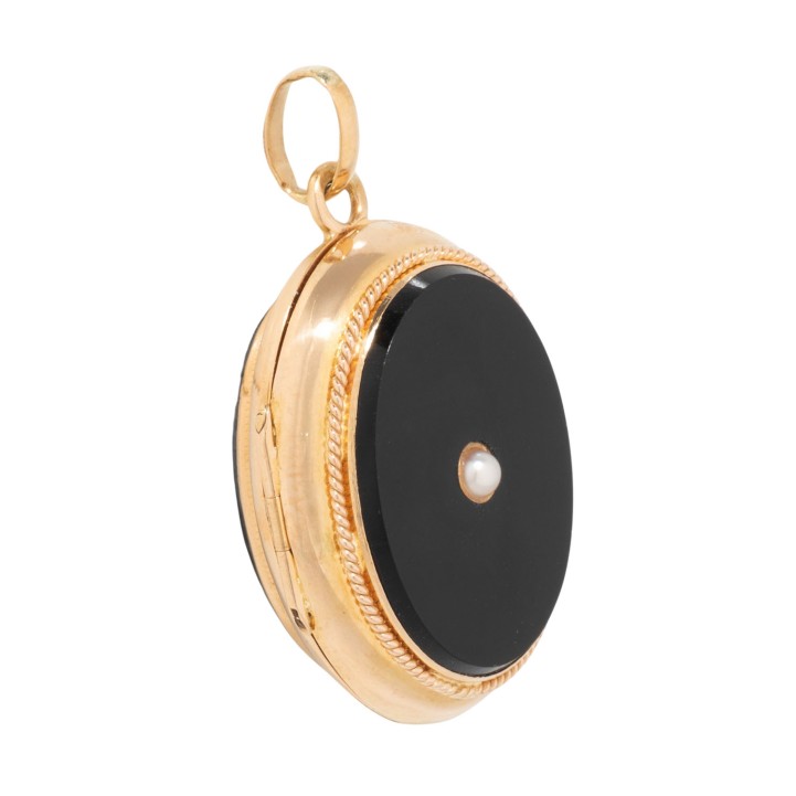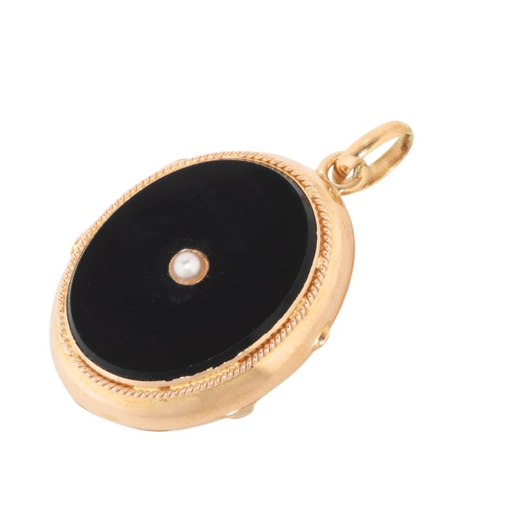 Medaillon pendant with onyx and small half pearl, 15K yellow gold, gilded, 10 g, 3.5x2.3 cm, with 2 glass frames, prob. England 19th/20th century, signs of wear, slightly dent.