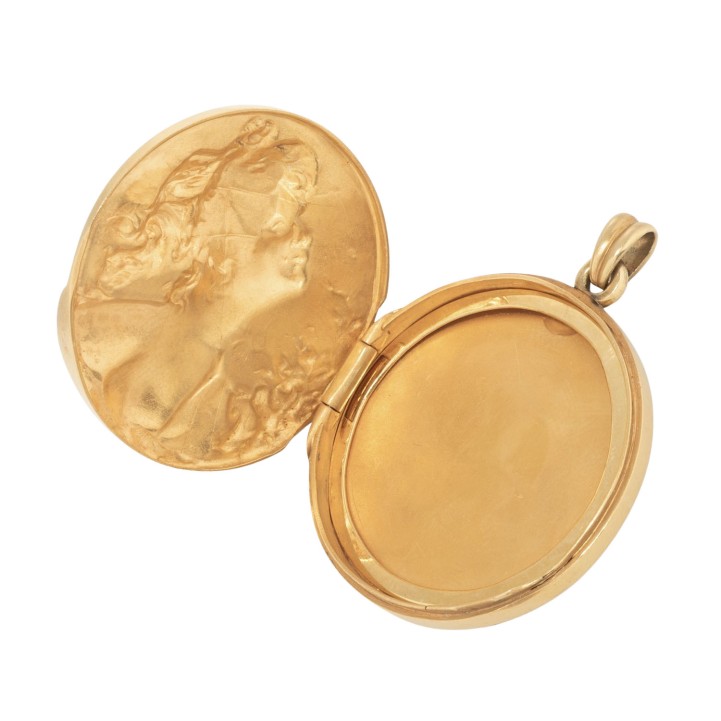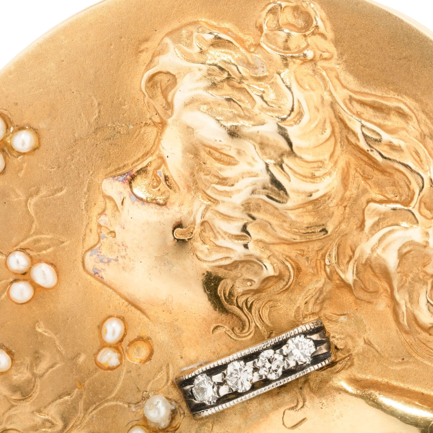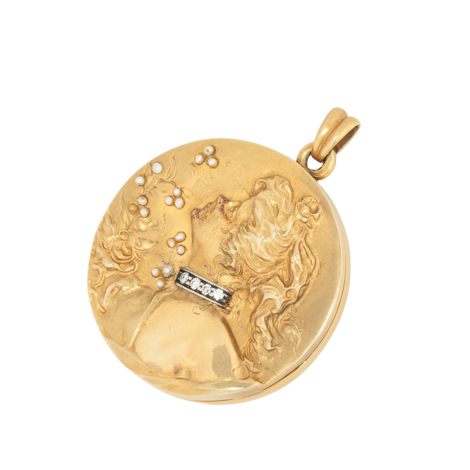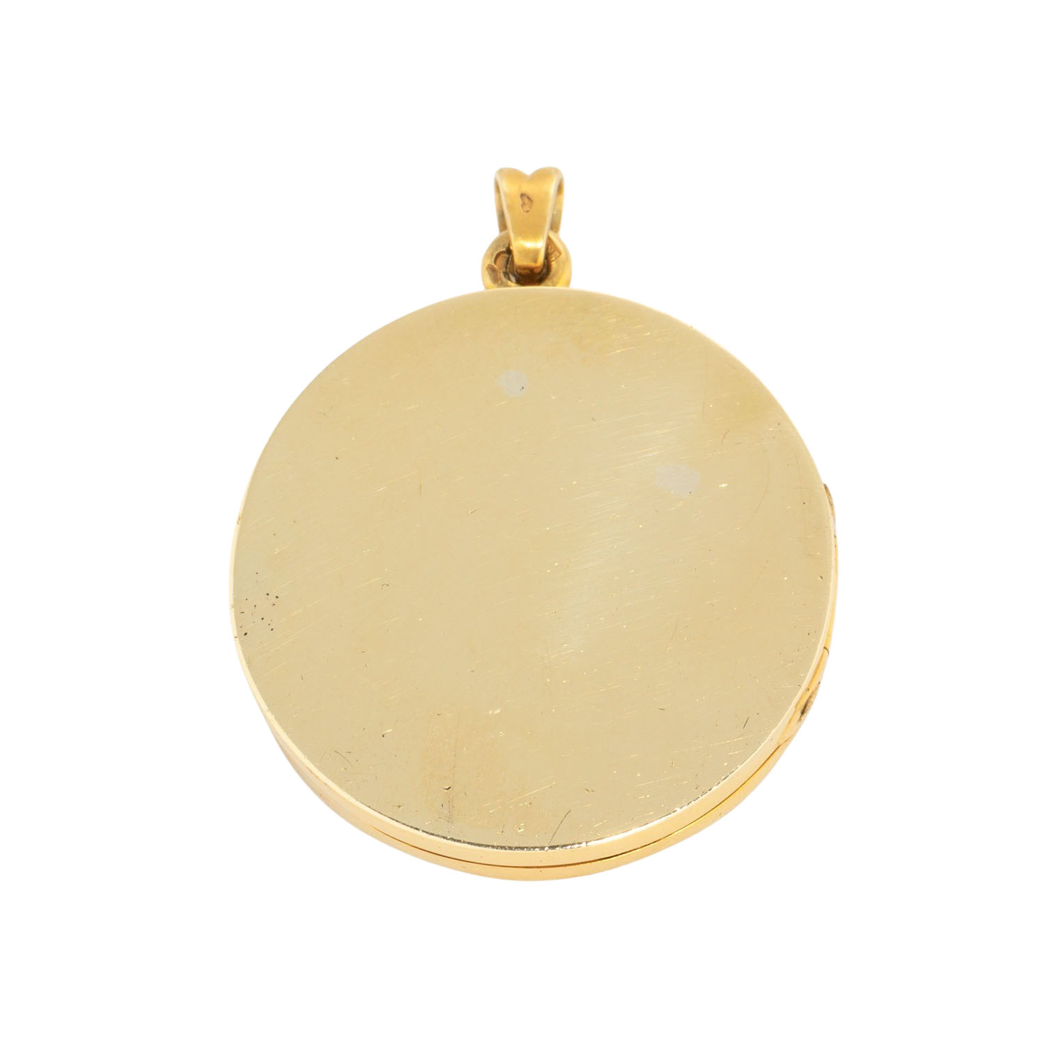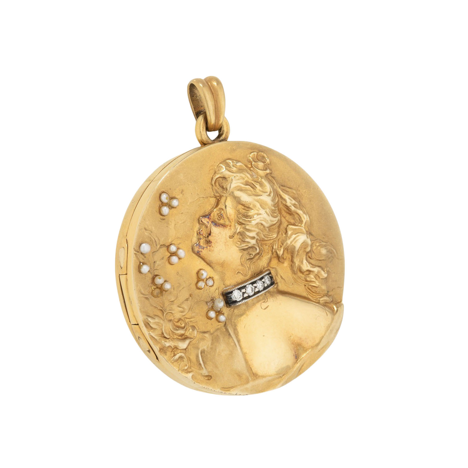 Medallion with small diamonds and pearls, 14K YG, 34.4 g, D: ca. 3.8 cm, 1st half 20th century, good condition consistent with age, Austian hallmark.