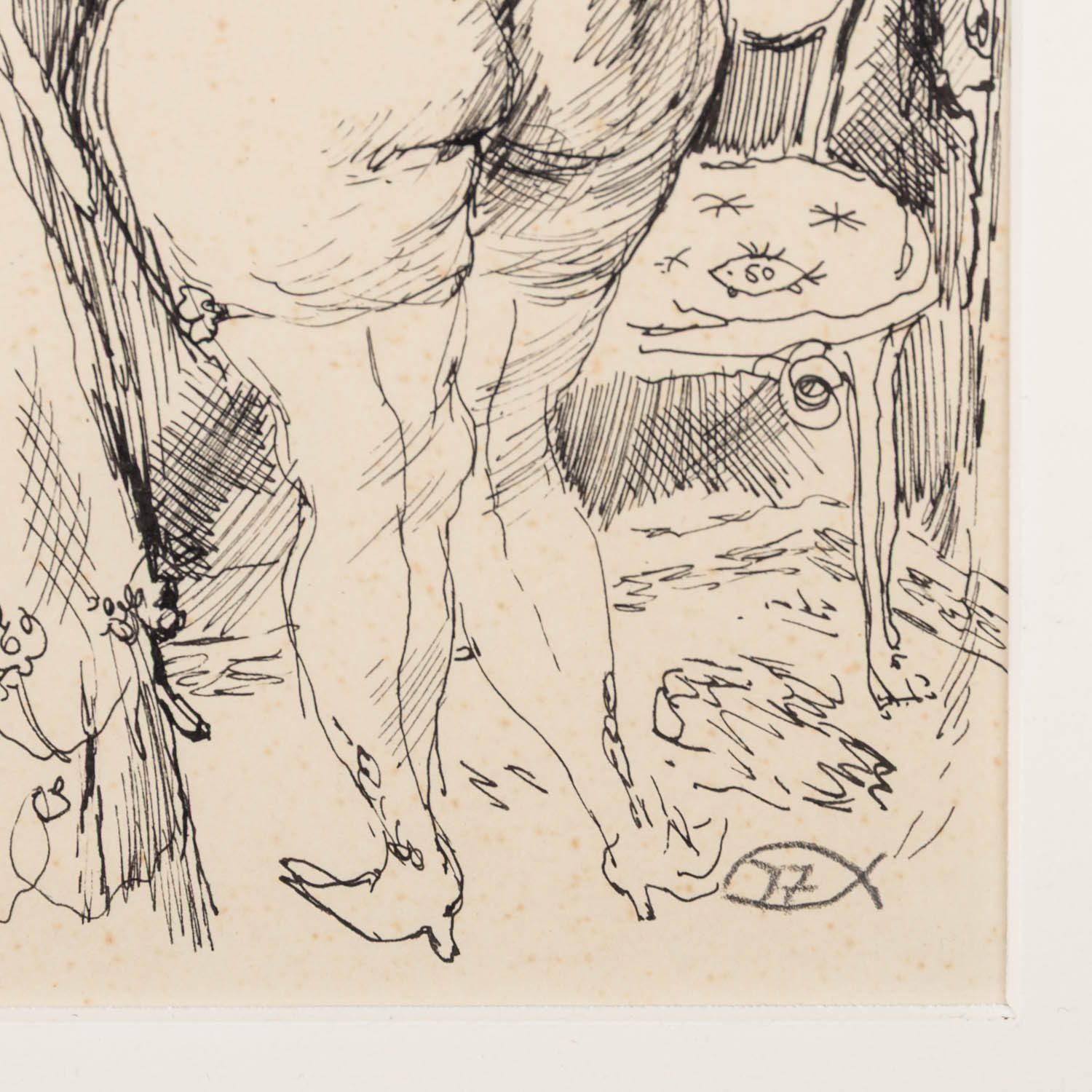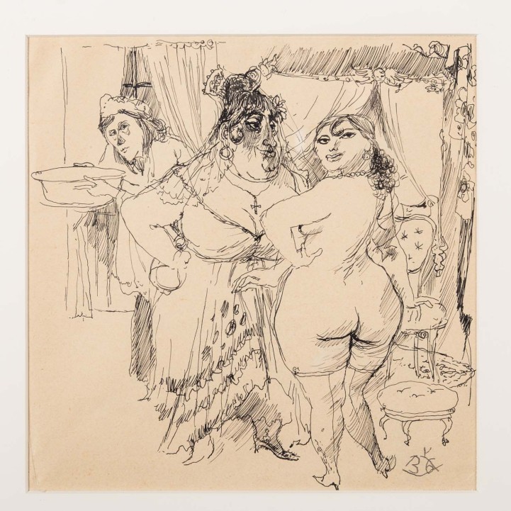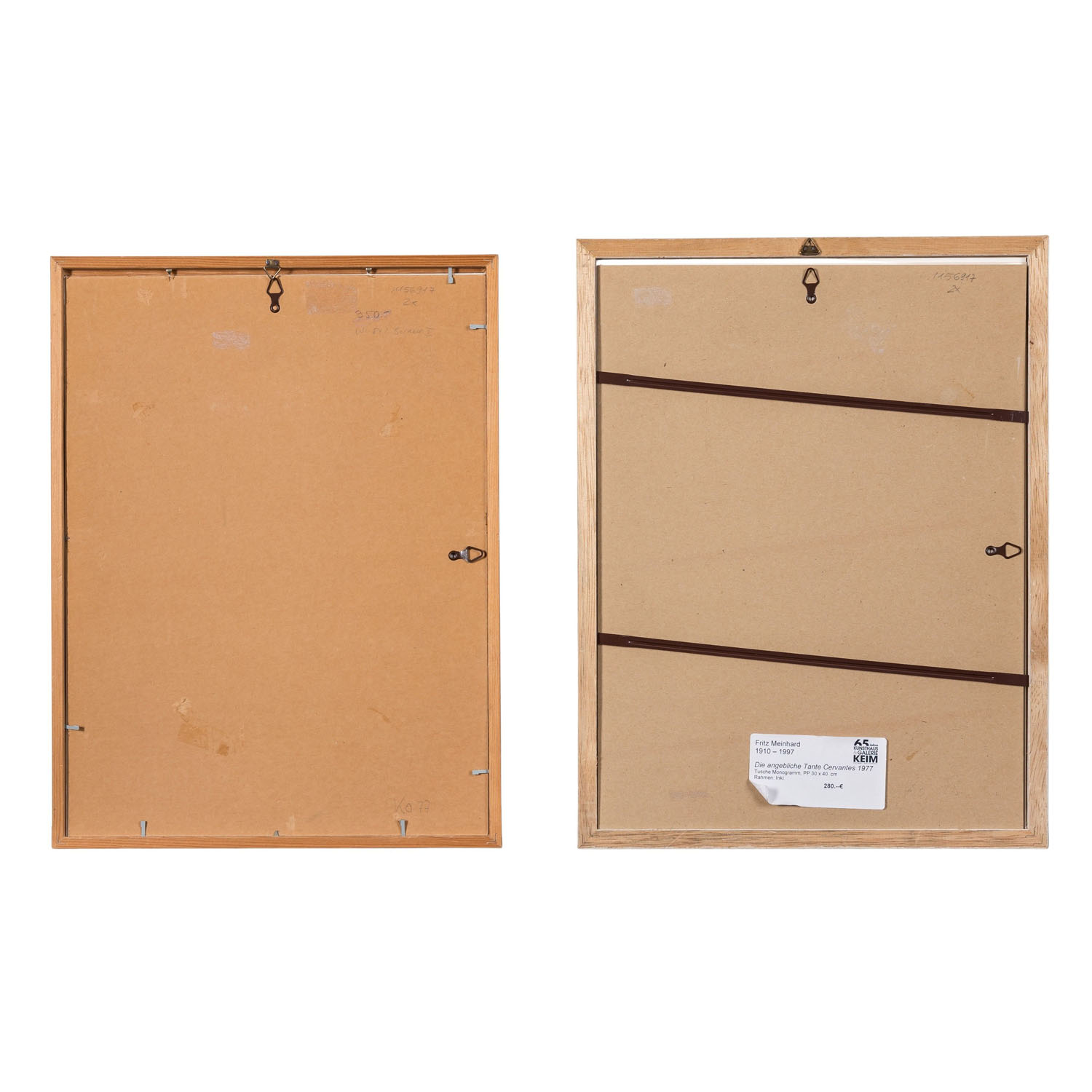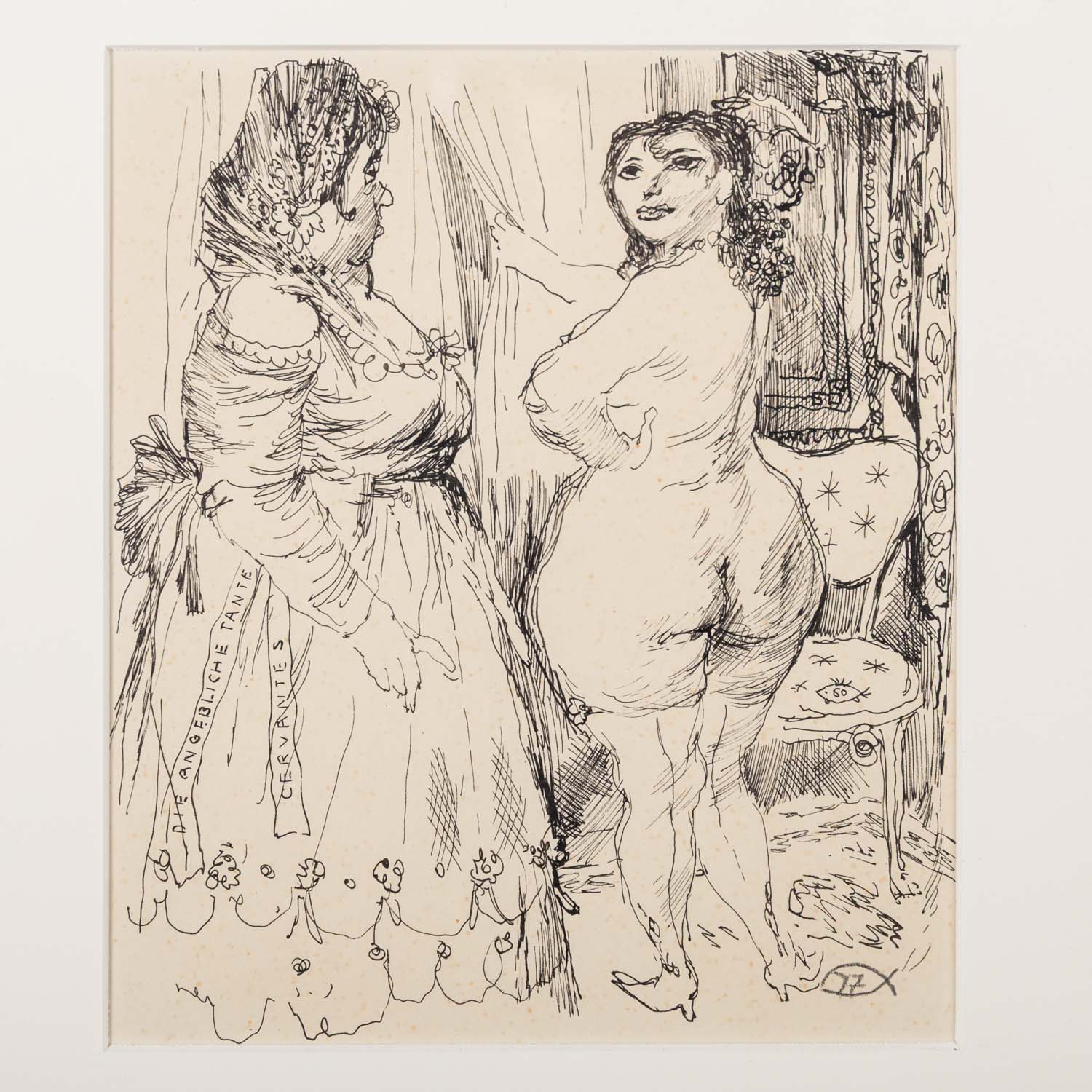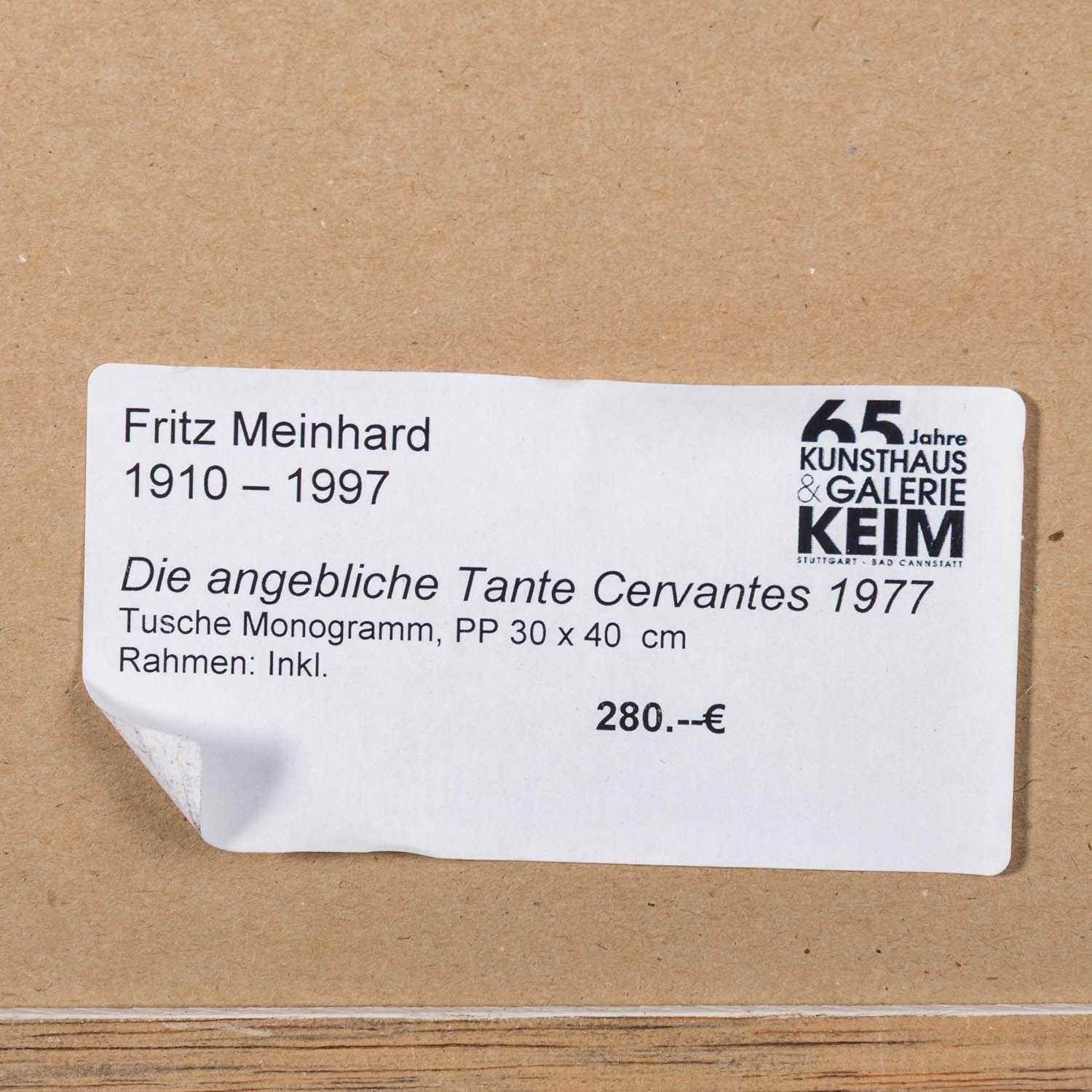 MEINHARD, FRITZ (1910-1997), pair of drawings ‘Die angebliche Tante Cervantes’ (The Alleged Aunt Cervantes), each signed ‘Fisch’ with date, each pen and ink drawing/paper, HxW: Passe-partout cut-out approx. 18.5x18 cm and 18x15 cm (42x32 cm and 43x33 cm with frame). Slight signs of age and creases, slightly browned. Each framed in passe-partout behind glass. 1x VERSO label Kunsthaus & Galerie Keim, Stuttgart-Bad Cannstatt with designation.