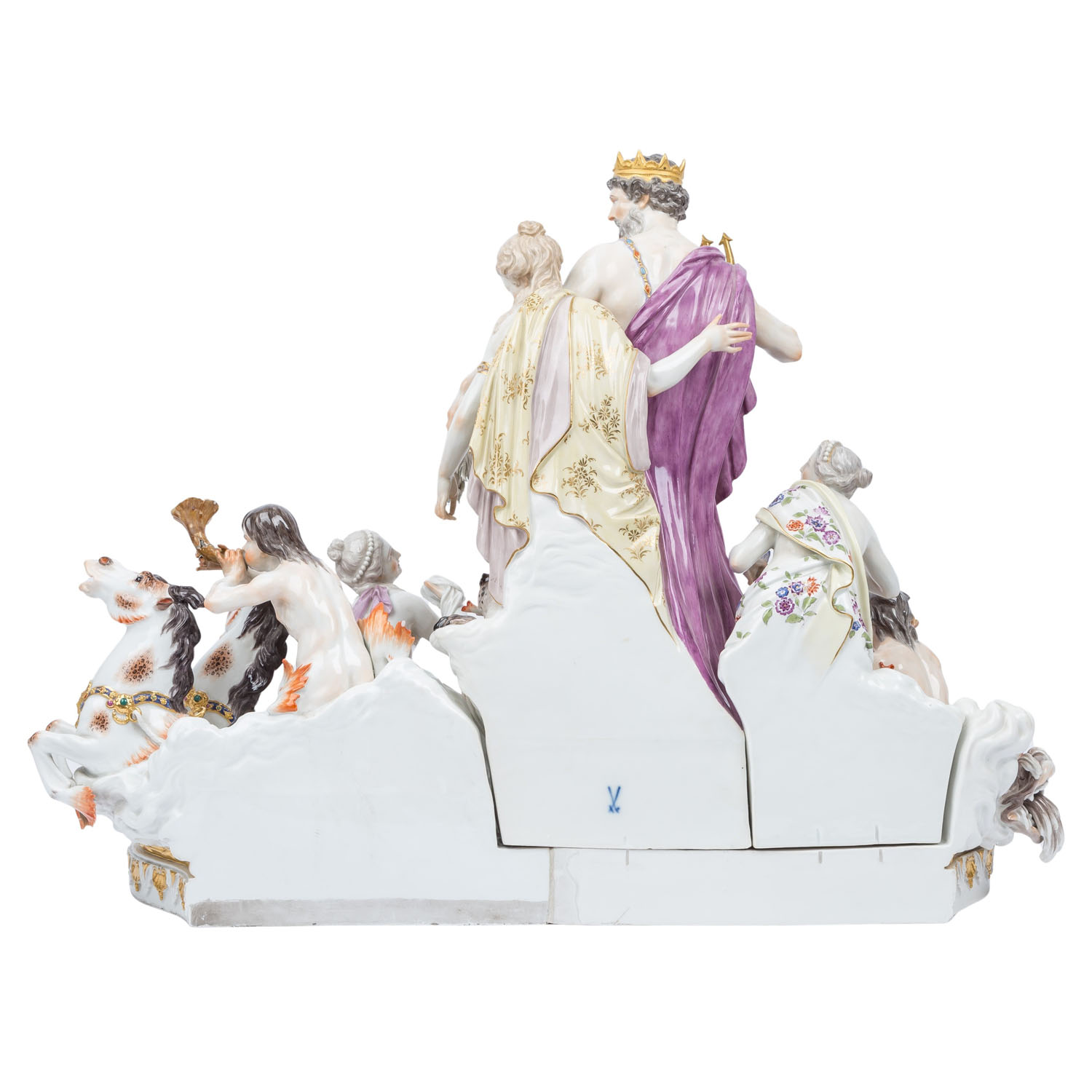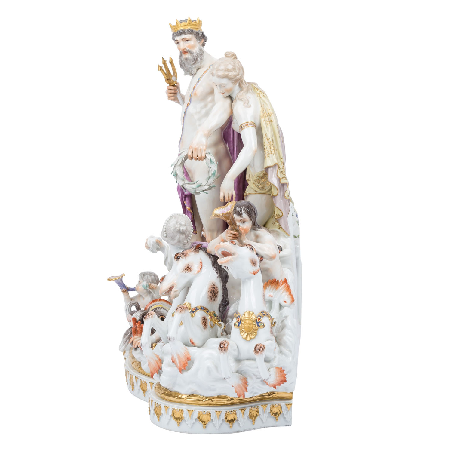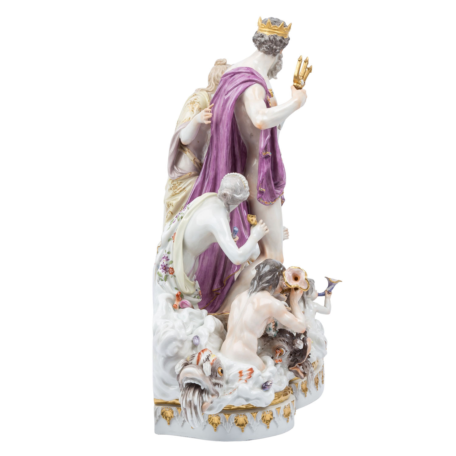 MEISSEN impressive figure group 'Neptune and Thetis', 1860-1924 and later. From a series of 40 figure groups for Empress Catherine II, designed in 1773 by Johann Joachim Kaendler. The figure is divided into three, or actually 4 parts. The base plate consists of two parts that have been joined together with porcelain mass. The curved side on the display side is decorated with alternating gold-plated and white rocailles. On the left side, 2 hippocampi emerge from the foamy waves, a Triton riding on them and another on the right side, a Nereid and a smaller Triton and 3 water-spouting dolphins are evenly distributed on the plinth. A free area has the pressed inscription 'Neptune No 1' and is used to display the Neptune/Thetis group. Left side with knob sword mark and press stamp 'No. 1', right side with later sword mark. Damage: All three cornucopias are damaged and/or glued, missing part on the fish tail of the left Triton, small damage. Fingers of the Nereid and a crack through the hand of the right Triton. Second group of figures: Neptune, with a cape, trident and crown, stands in a mussel shell with an anchor behind him, Thetis with a dog at her feet. Sword mark on the back, H 42 cm. Damage: Trident glued in several places and only half preserved, 3 leaf tips on the wreath and 1 large toe missing, 1 arm of the anchor glued, underside with a fine hairline crack, this part of the figure lies loose on the plate (plug-in device missing). 3rd figure: Nereid emerging from the waves, with plug-in device (this means the sword mark is not visible), small finger damaged. H 24 cm. Signs of age, damage (see long description). Group is NOT SUITABLE FOR SHIPPING! COLLECTION BY YOURSELF OR SHIPPING BY FREIGHT COMPANY!