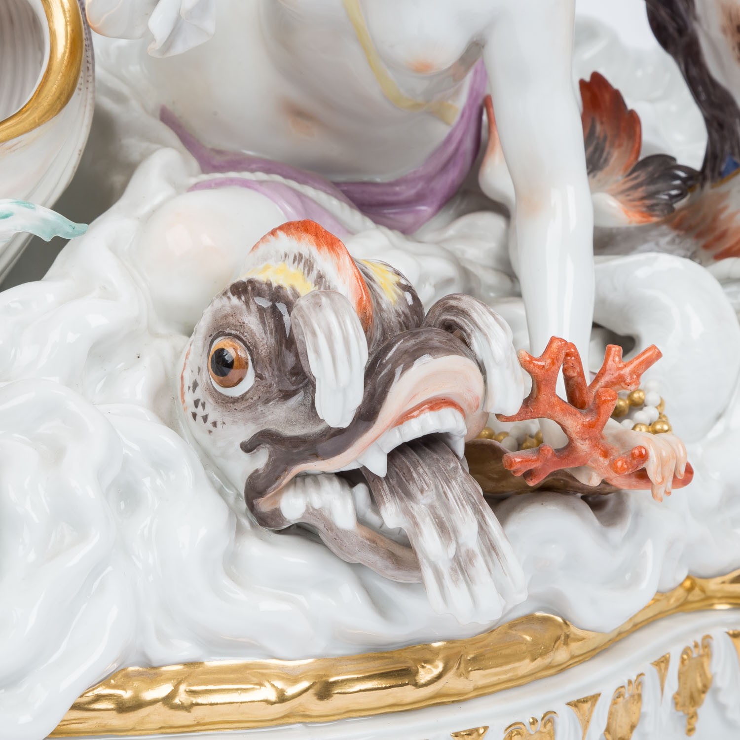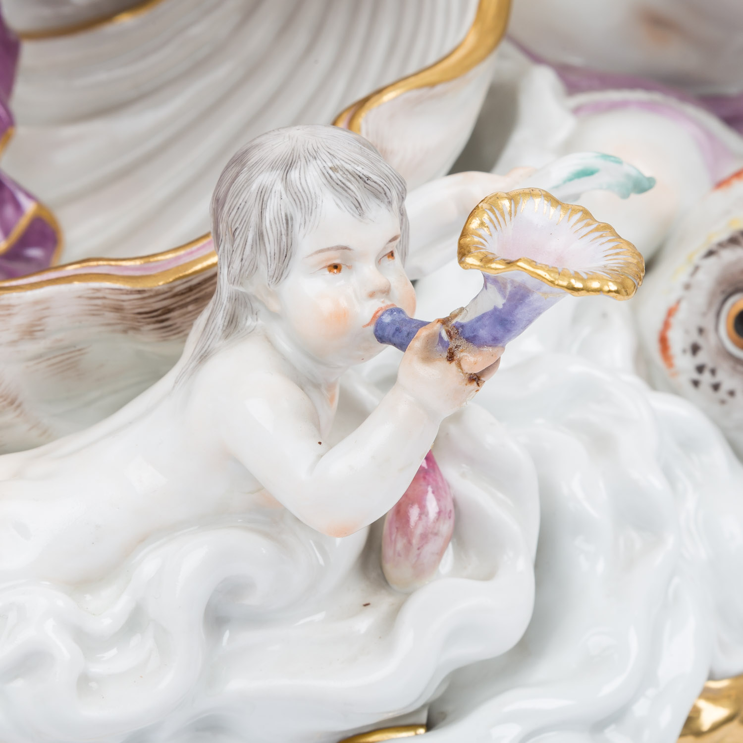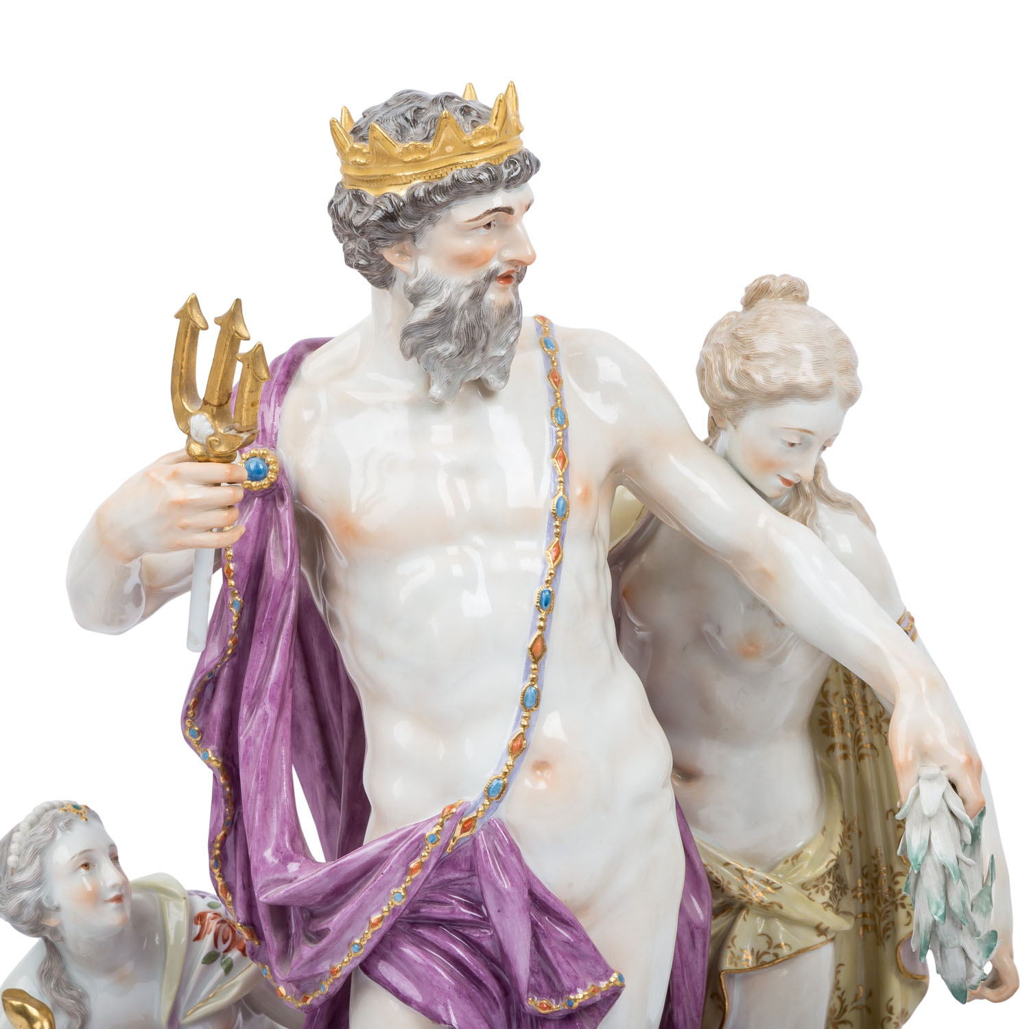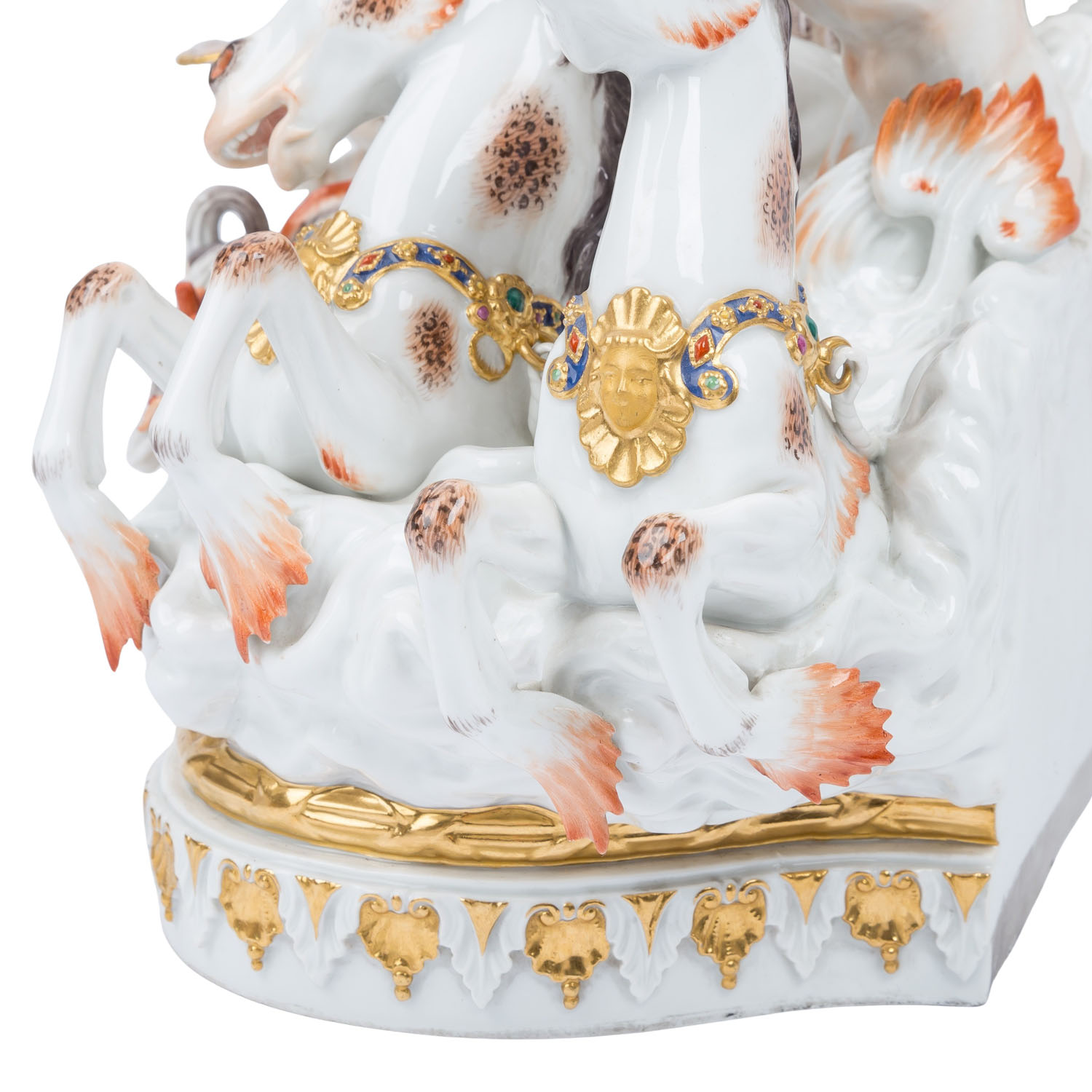 MEISSEN impressive figure group 'Neptune and Thetis', 1860-1924 and later. From a series of 40 figure groups for Empress Catherine II, designed in 1773 by Johann Joachim Kaendler. The figure is divided into three, or actually 4 parts. The base plate consists of two parts that have been joined together with porcelain mass. The curved side on the display side is decorated with alternating gold-plated and white rocailles. On the left side, 2 hippocampi emerge from the foamy waves, a Triton riding on them and another on the right side, a Nereid and a smaller Triton and 3 water-spouting dolphins are evenly distributed on the plinth. A free area has the pressed inscription 'Neptune No 1' and is used to display the Neptune/Thetis group. Left side with knob sword mark and press stamp 'No. 1', right side with later sword mark. Damage: All three cornucopias are damaged and/or glued, missing part on the fish tail of the left Triton, small damage. Fingers of the Nereid and a crack through the hand of the right Triton. Second group of figures: Neptune, with a cape, trident and crown, stands in a mussel shell with an anchor behind him, Thetis with a dog at her feet. Sword mark on the back, H 42 cm. Damage: Trident glued in several places and only half preserved, 3 leaf tips on the wreath and 1 large toe missing, 1 arm of the anchor glued, underside with a fine hairline crack, this part of the figure lies loose on the plate (plug-in device missing). 3rd figure: Nereid emerging from the waves, with plug-in device (this means the sword mark is not visible), small finger damaged. H 24 cm. Signs of age, damage (see long description). Group is NOT SUITABLE FOR SHIPPING! COLLECTION BY YOURSELF OR SHIPPING BY FREIGHT COMPANY!