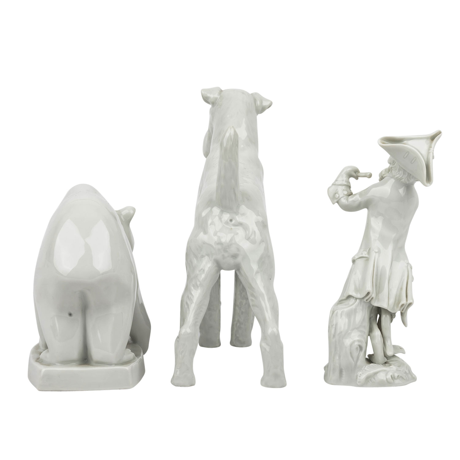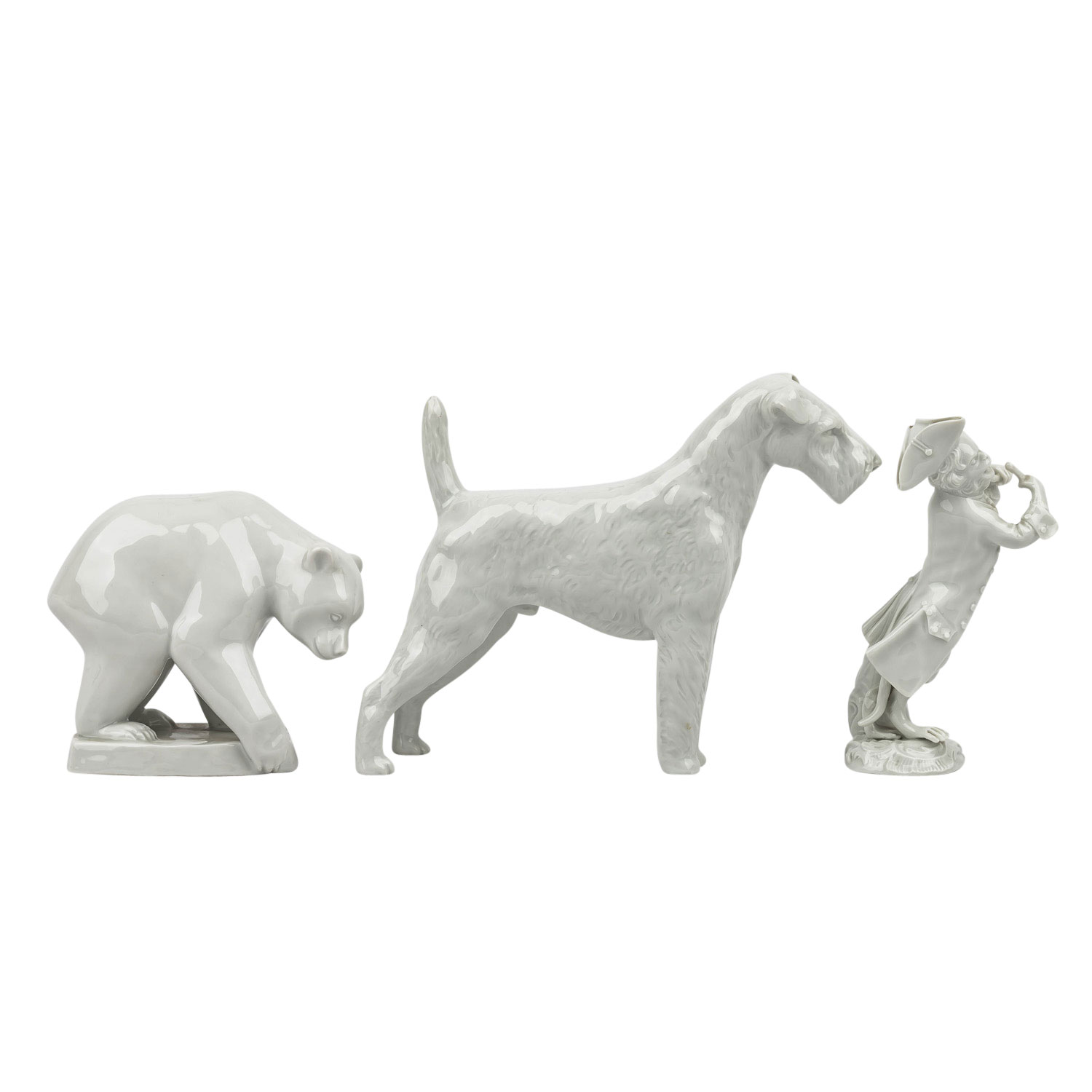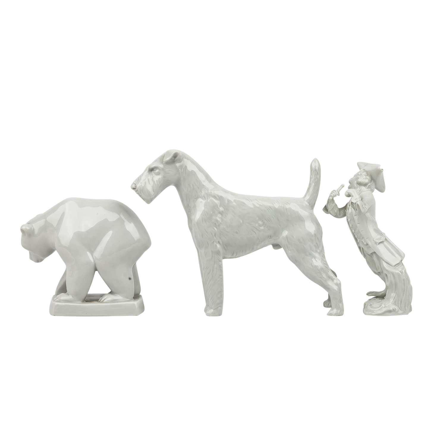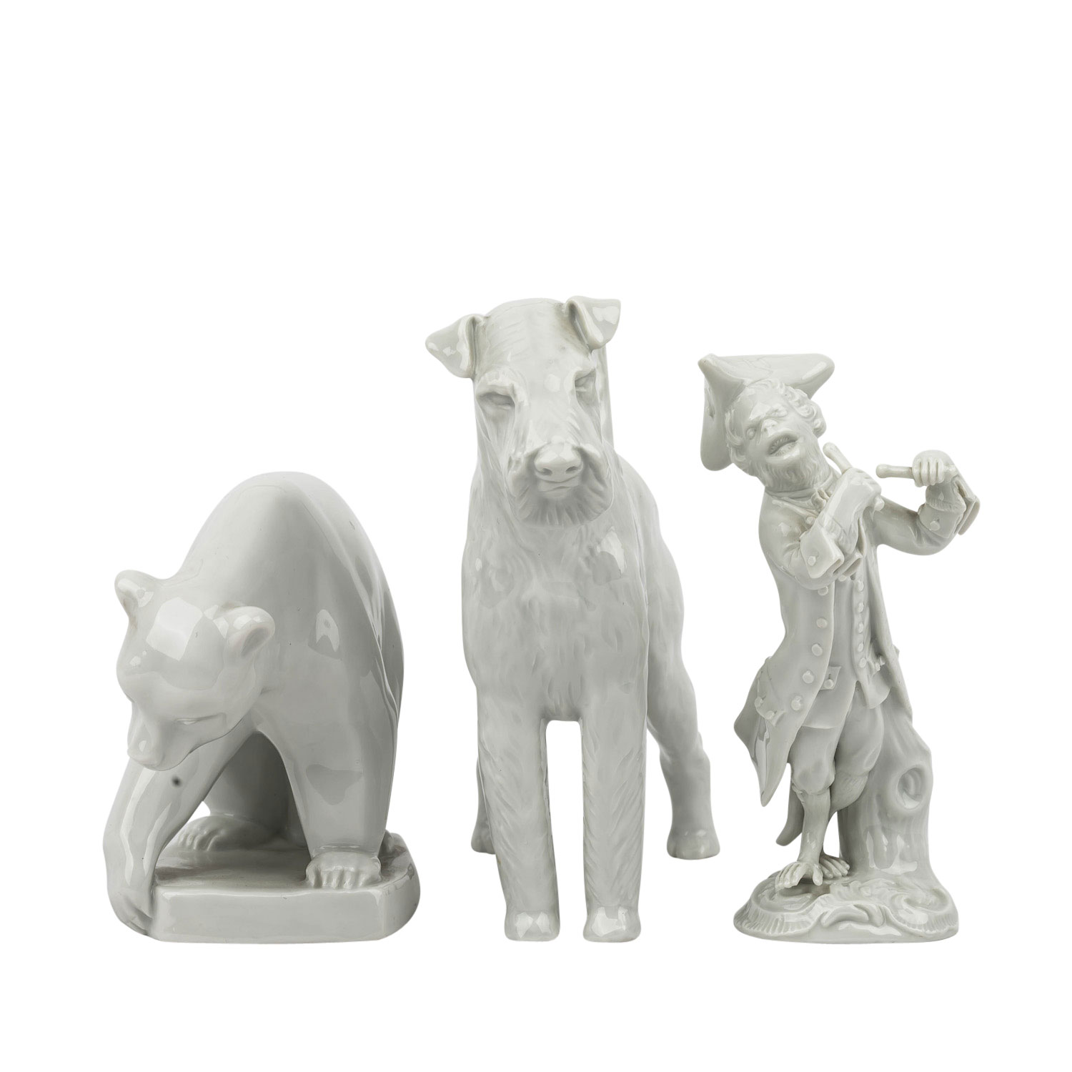MEISSEN 3-piece collection of figures, 20th century. Each white porcelain, including 1 timpani stick from the monkey band, designed by J.J. Kaendler and P. Reinicke, model no. 60012 (left sleeve min. dam.), H 13 cm; standing fox terrier, designed by Erich Oehme in 1937, model no. 78755, 1st choice, H 14.5 cm and 1 young bear, designed by Elfriede Reichel-Drechsler in 1959, model no. H 239, H 10.5 cm. Sword mark of bear and monkey musician with 2 grinding lines (2nd choice), each with signs of age.