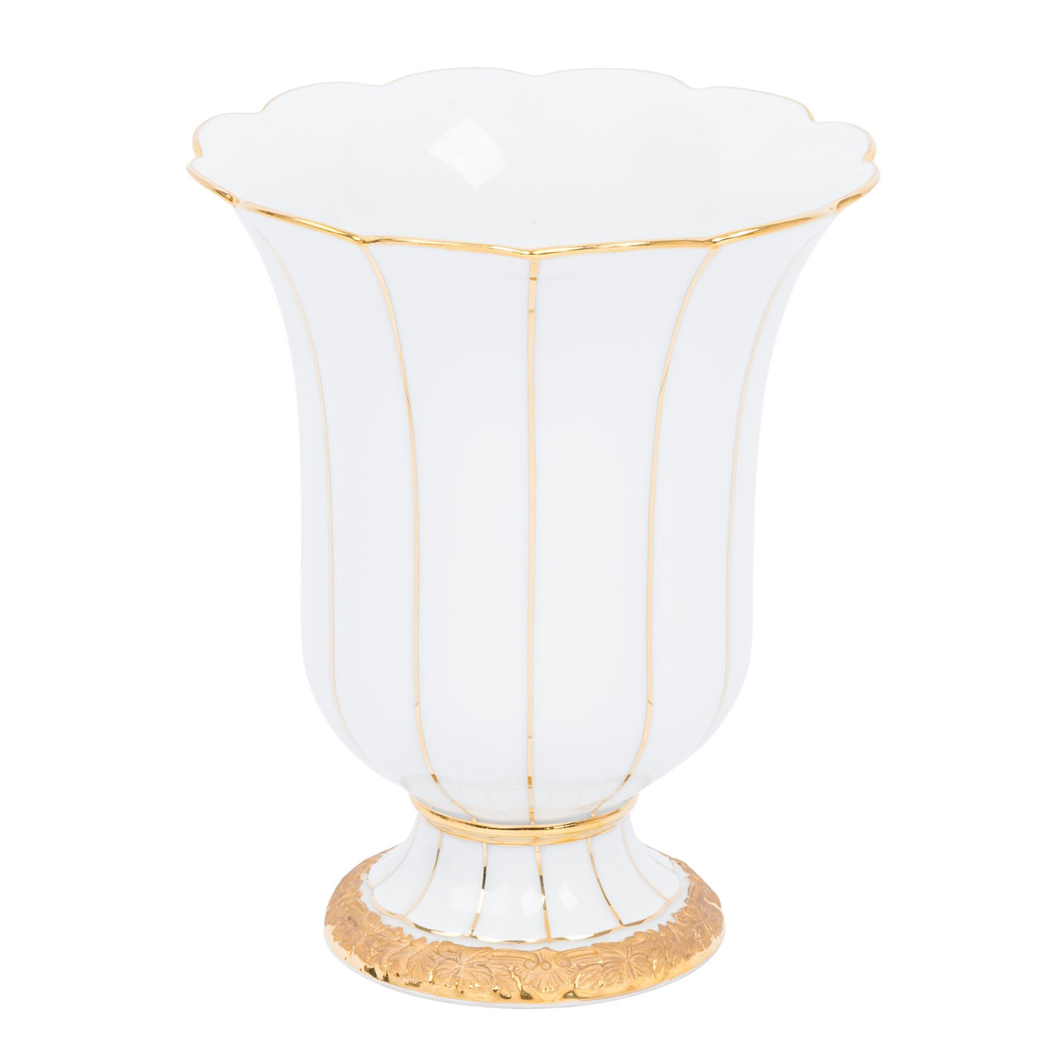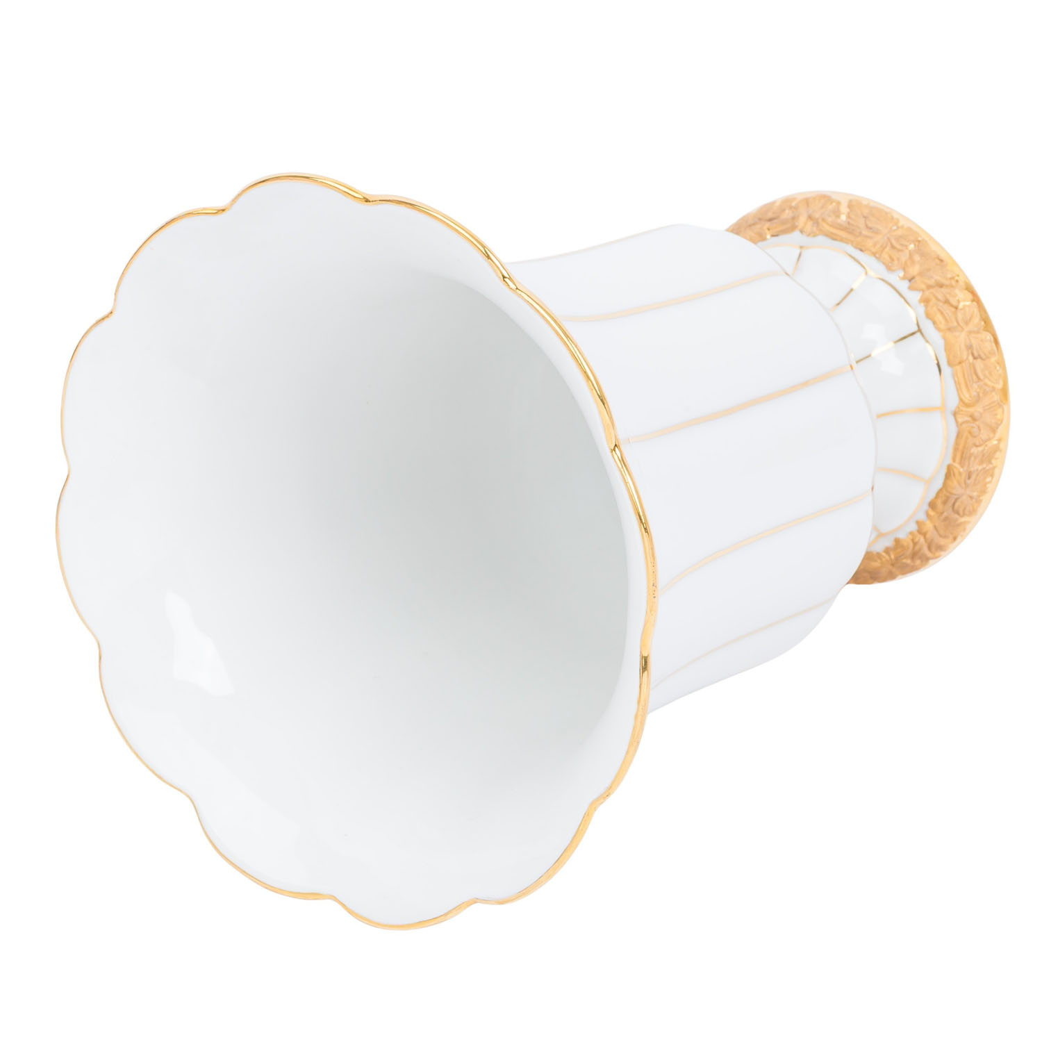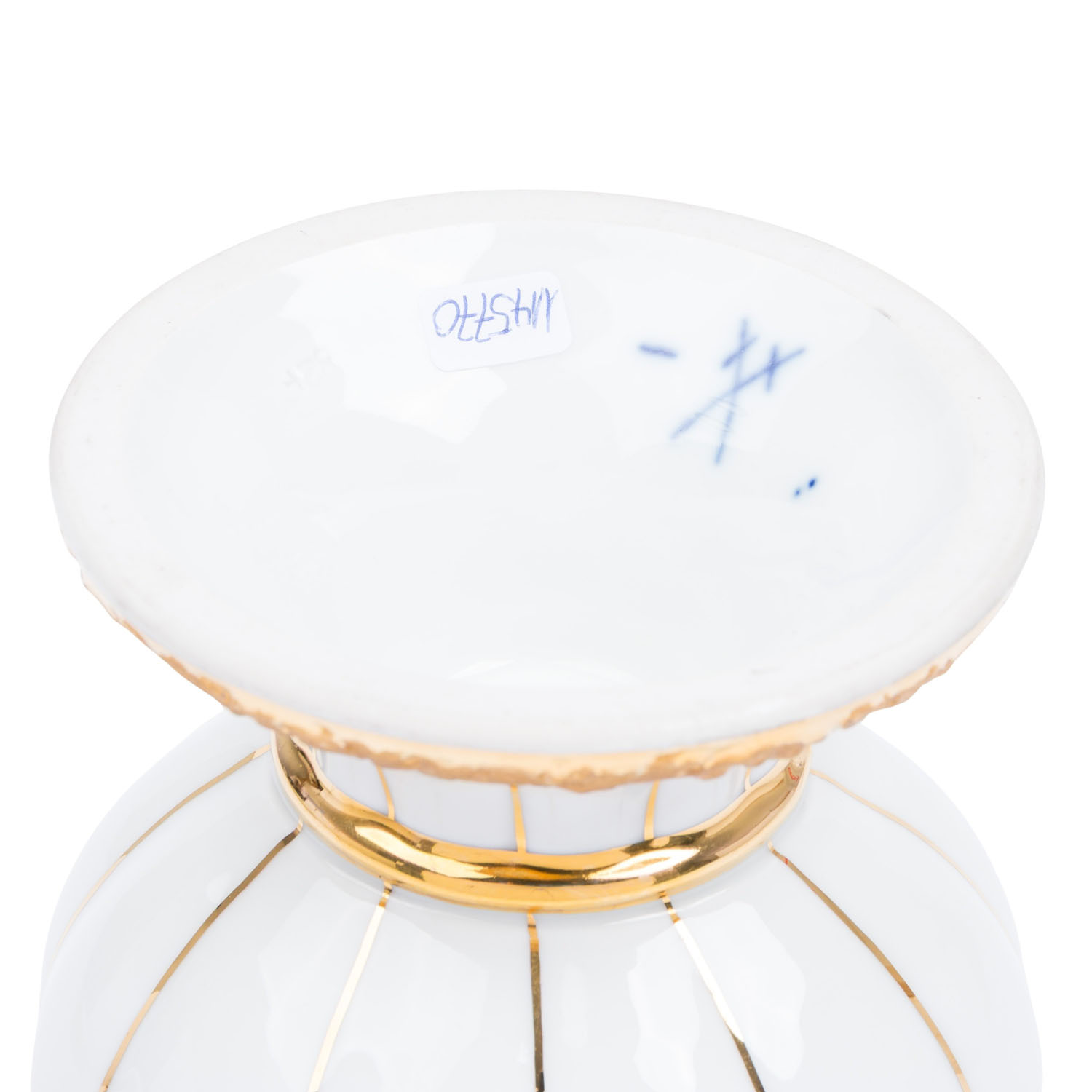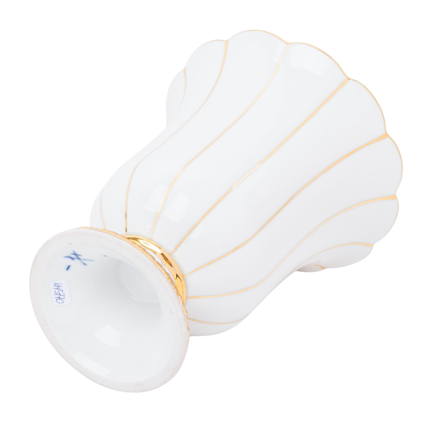 MEISSEN 7 “B-shape and X-shape” pompous service pieces, 1st and 2nd choice, 20th century. 1 'B-Form' place setting (cup, saucer and plate) with bright gold decoration, 2nd choice; 1 'B-Form' place setting with bright gold and cobalt blue decoration, 1st choice; 1 'X-Form' vase with matt and bright gold decoration (h. approx. 17 cm).