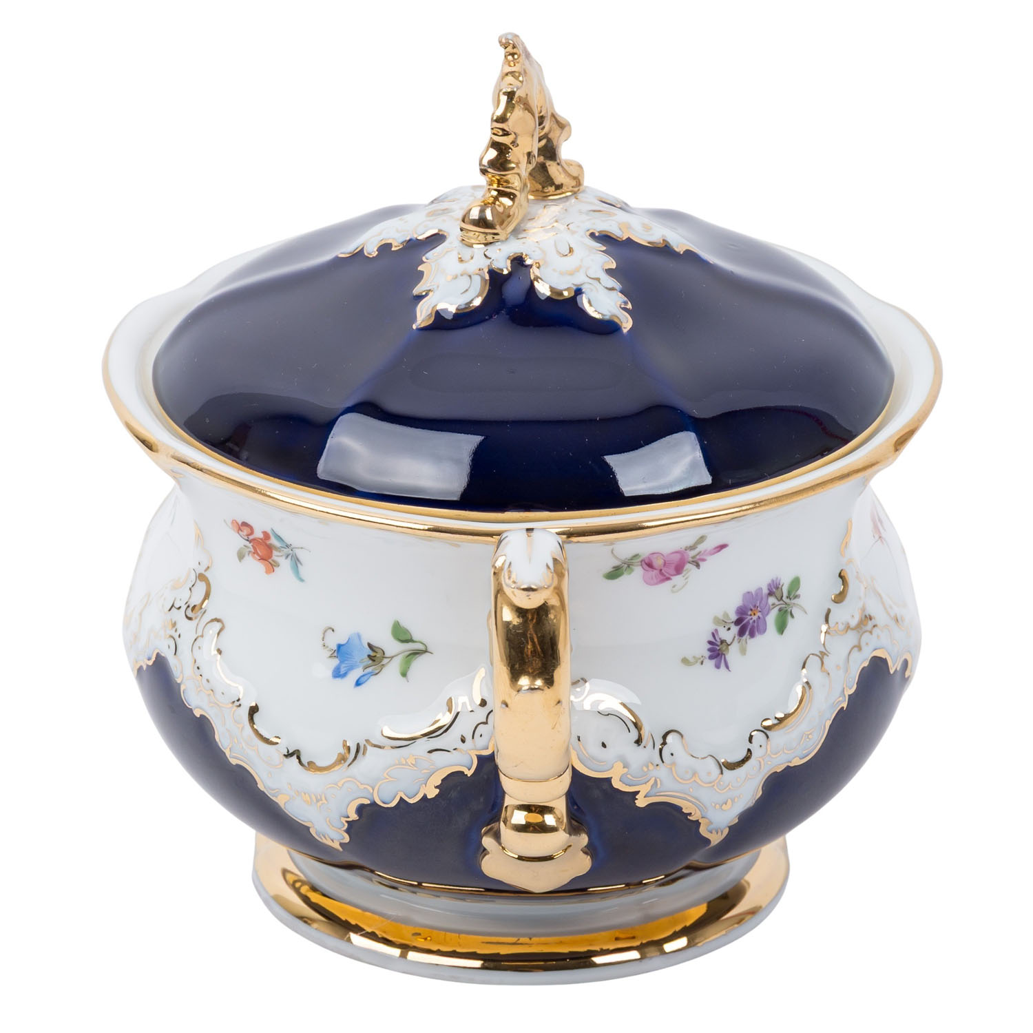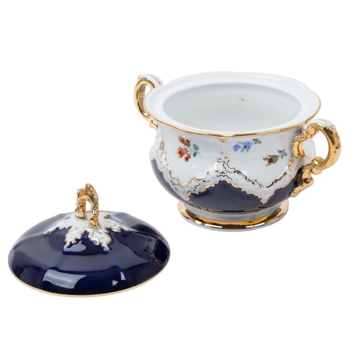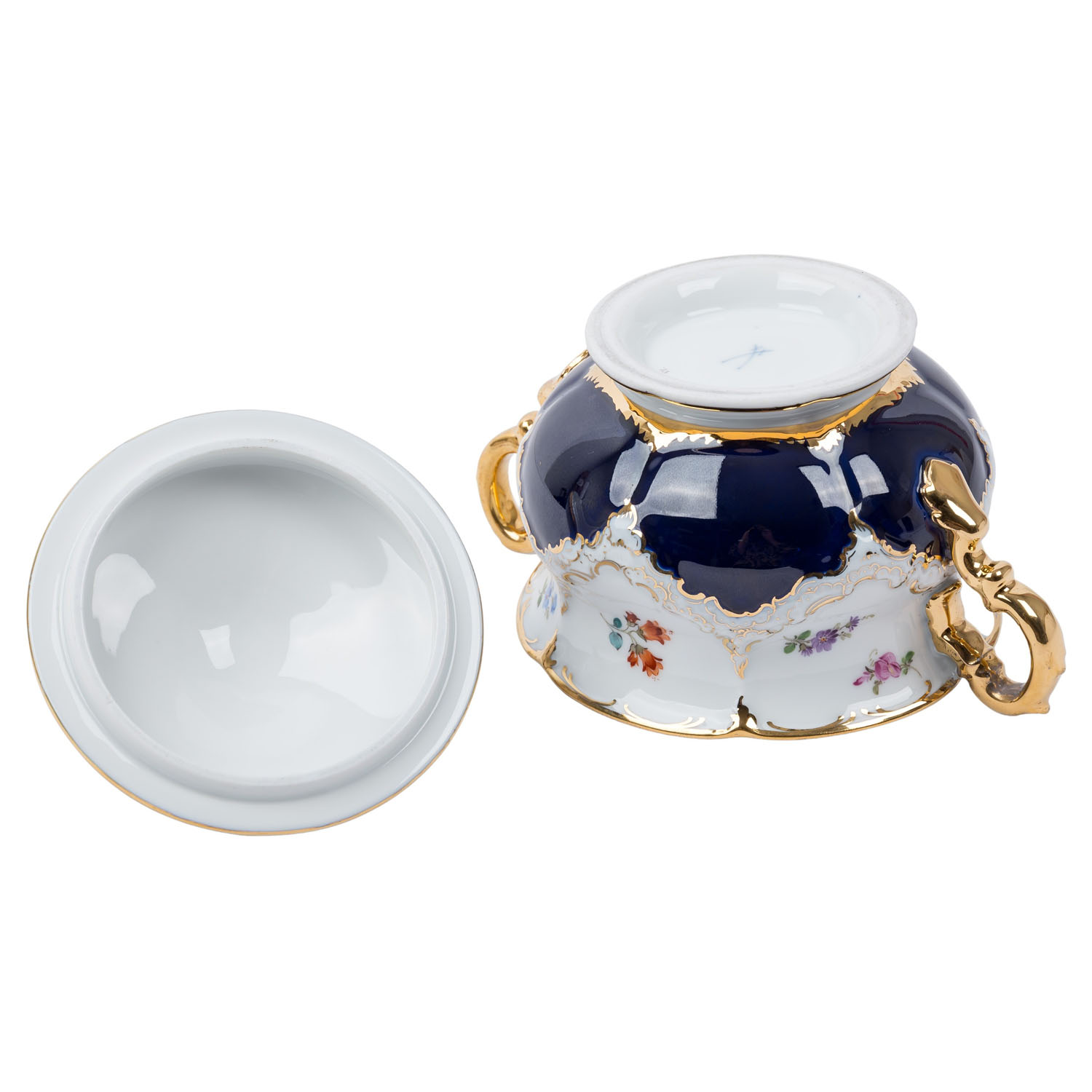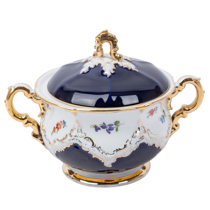 MEISSEN lid box “B-shape”, 1st choice, 20th century. White porcelain with rich gold decoration, partially decorated in cobalt blue, with strewn flower painting, diameter without handle approx. 13 cm. One handle has a chip and is slightly rubbed.