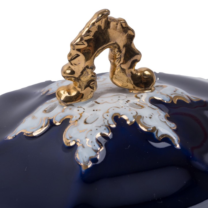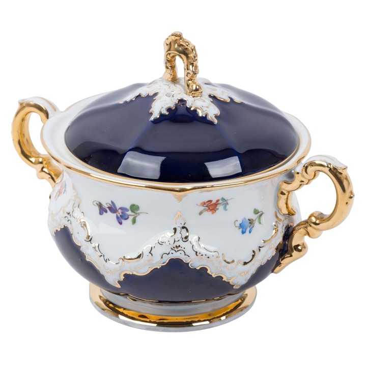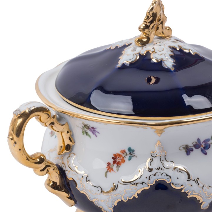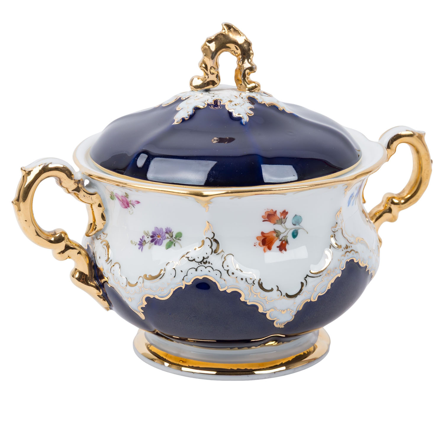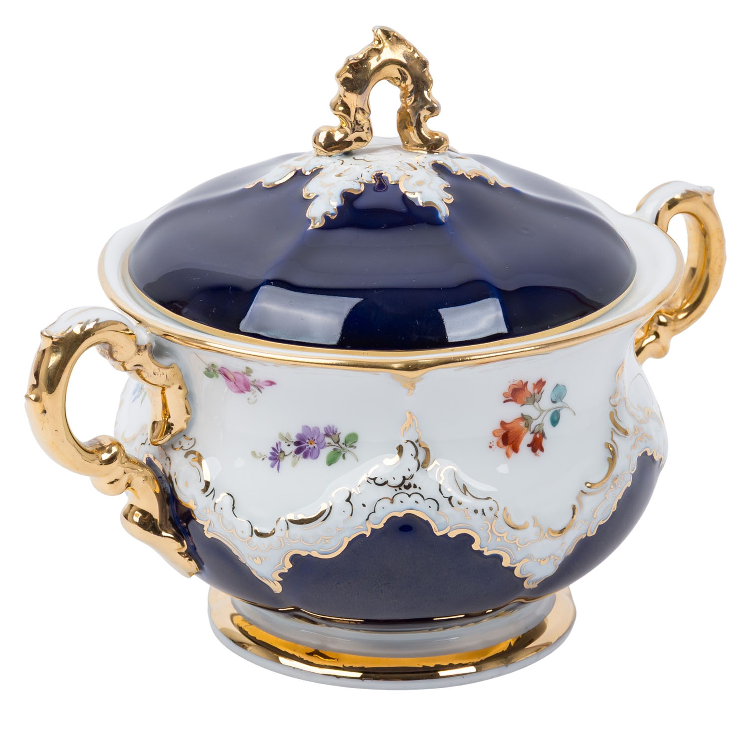 MEISSEN lid box “B-shape”, 1st choice, 20th century. White porcelain with rich gold decoration, partially decorated in cobalt blue, with strewn flower painting, diameter without handle approx. 13 cm. One handle has a chip and is slightly rubbed.