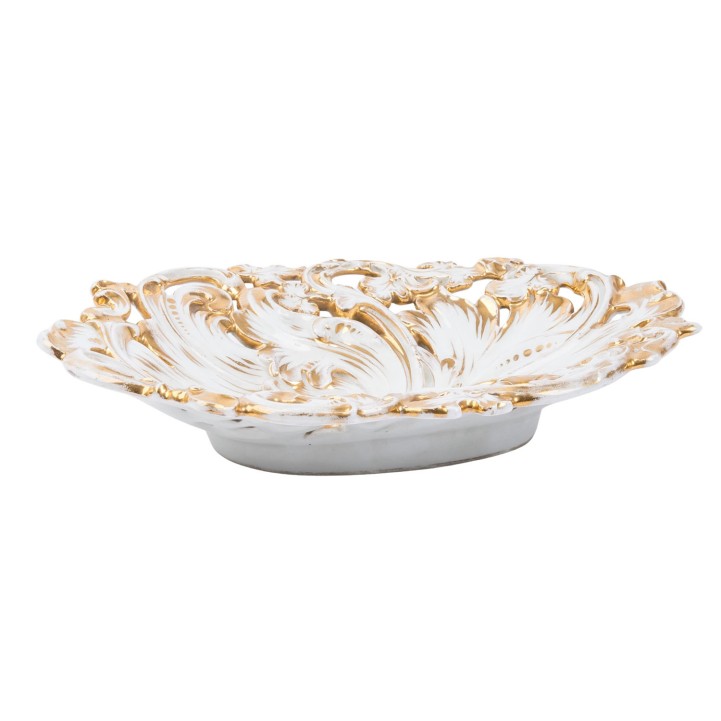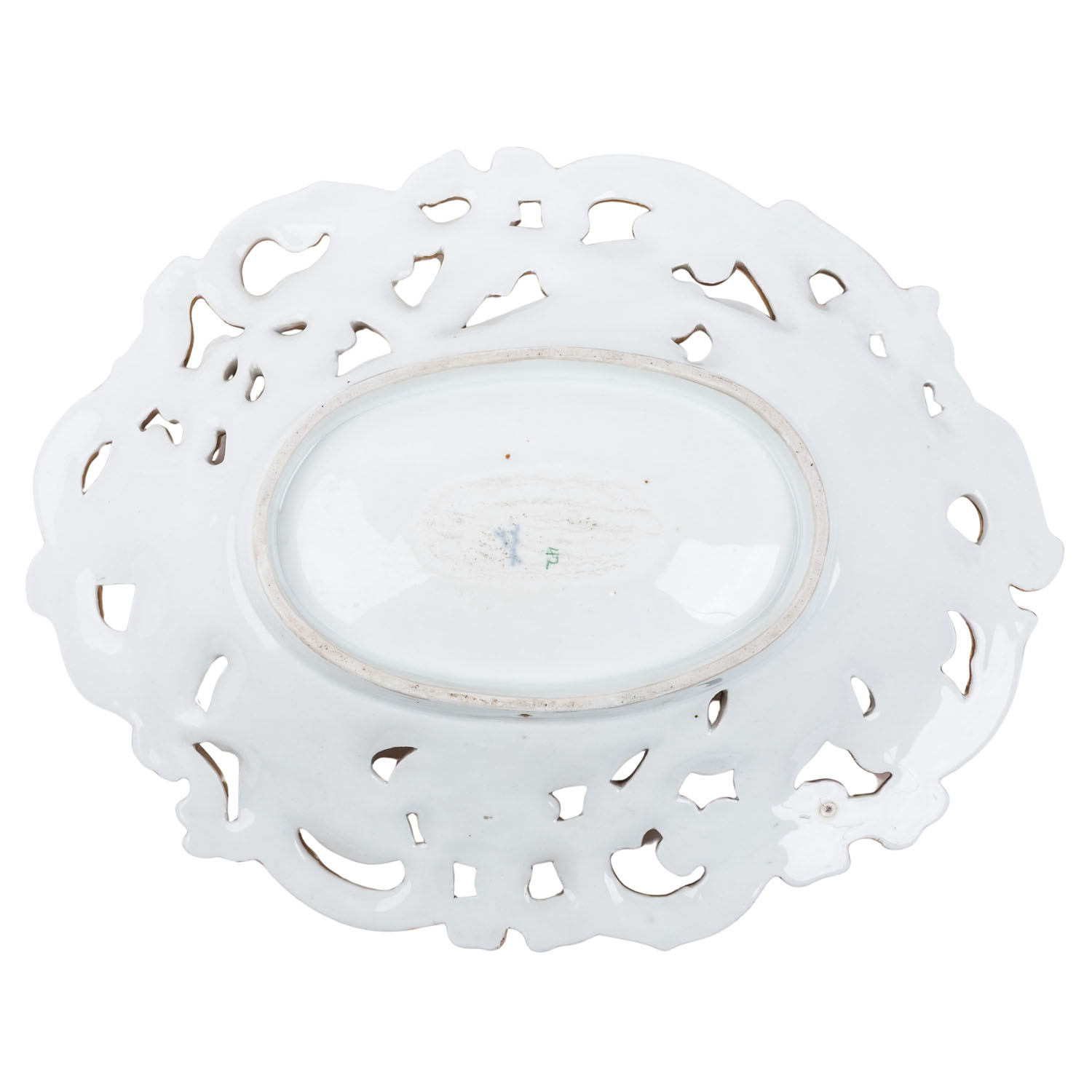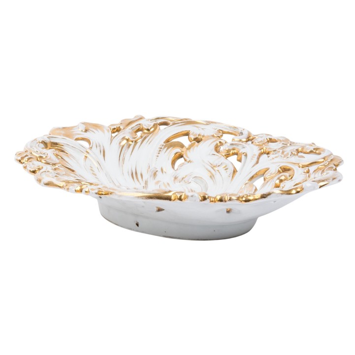 MEISSEN bowl circa 1850, Oval bowl with rich floral relief and openwork decoration, gilded (partly rubbed), model number Y 32 c, L 32 cm, signs of age and use, age-related firing defects on the back.