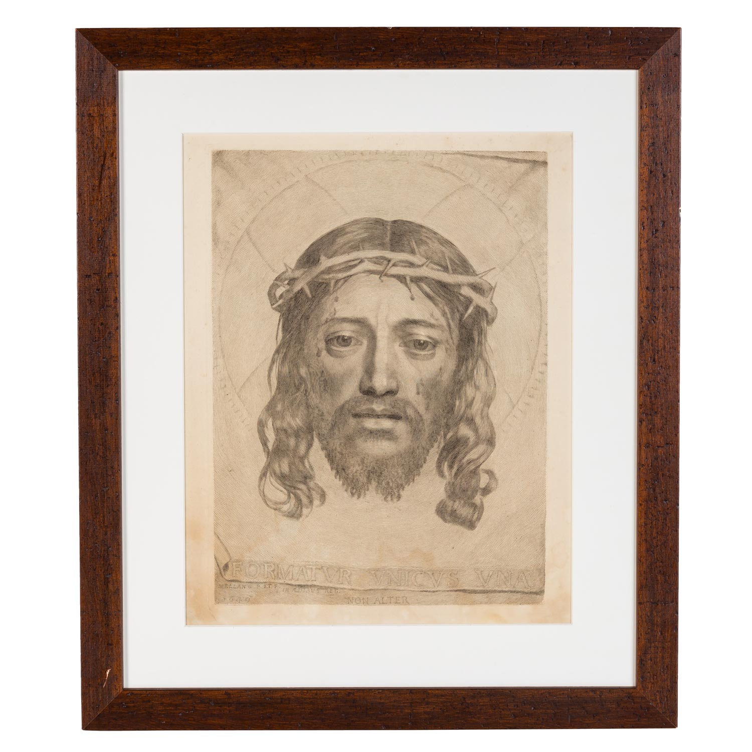 MELLAN, CLAUDE (1598-1688), 'Formatur unicus una, non alter', Veronica's sweatcloth with the face of Christ, copperplate/handmade paper, titled, inscribed and dated in the plate ‘MELLAN C. P. ET F.; IN AEDIBUS REG. 1649', HxW: plate approx. 44x33 cm, sheet approx. 55x38.5 cm, mat cut-out approx. 47x37 cm, outer frame dimensions approx. 67x57 cm. Traces of age, browned and stained, creases and tear to lower sheet margin (covered by mount). Framed behind glass in passepartout (sheet not mounted, frame mouldings partially slightly bumped).