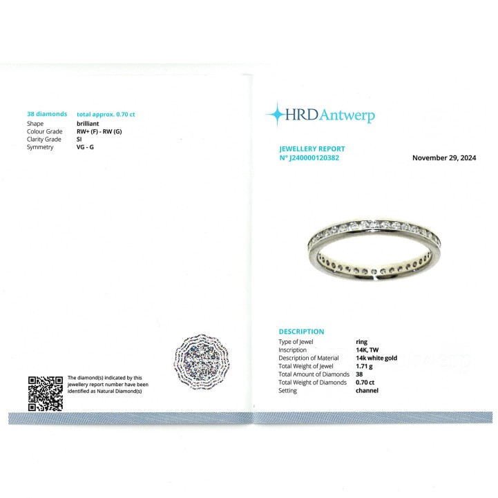 Memory ring with 38 brilliant-cut diamonds totaling approx. 0.70 ct, RW (F-G)/SI, 14K white gold, 1.7 g, RW: 51, 21st century, minimal signs of wear, incl. HRD jewelry report (11/2024).