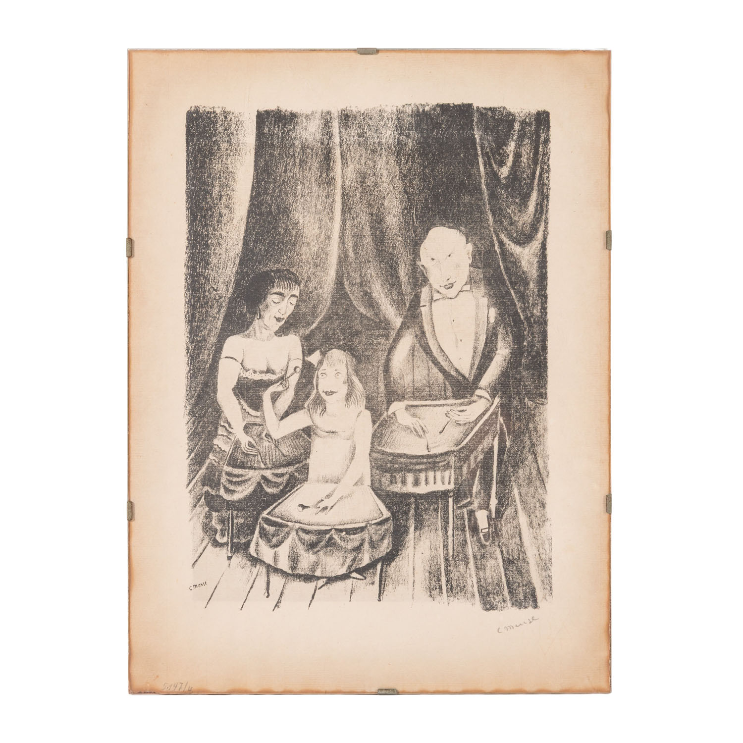 MENSE, CARLO (1886-1965), ‘Jazzkapelle’, lithograph/paper, signed by hand in pencil lower right, signed in the plate lower left, HxW: plate approx. 31x22.5 cm, sheet approx. 40x30 cm, outer frame dimensions approx. 40x30 cm. Signs of age and wear, browned, wavy, strong discolouration to margins. Framed behind glass (traces of age and wear).