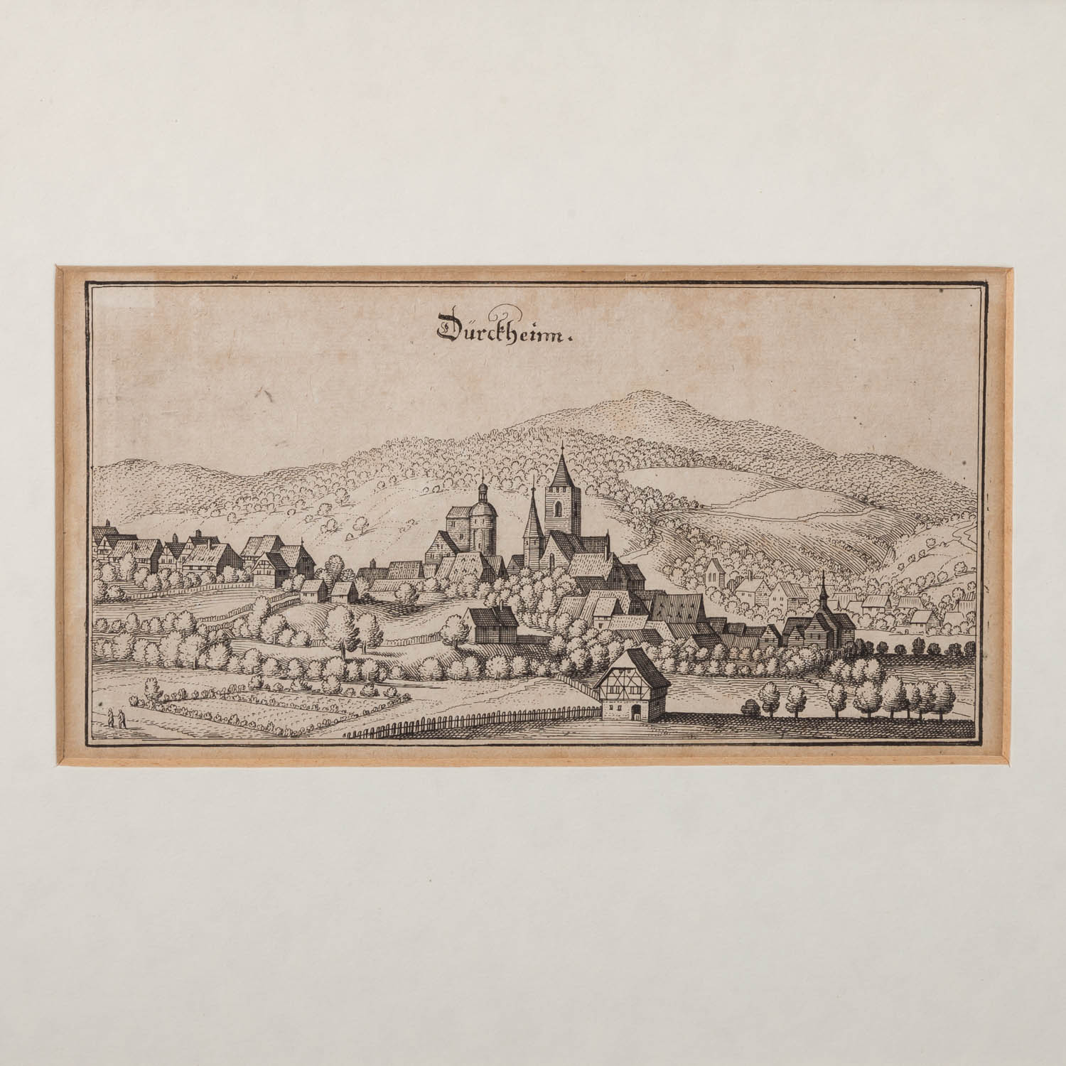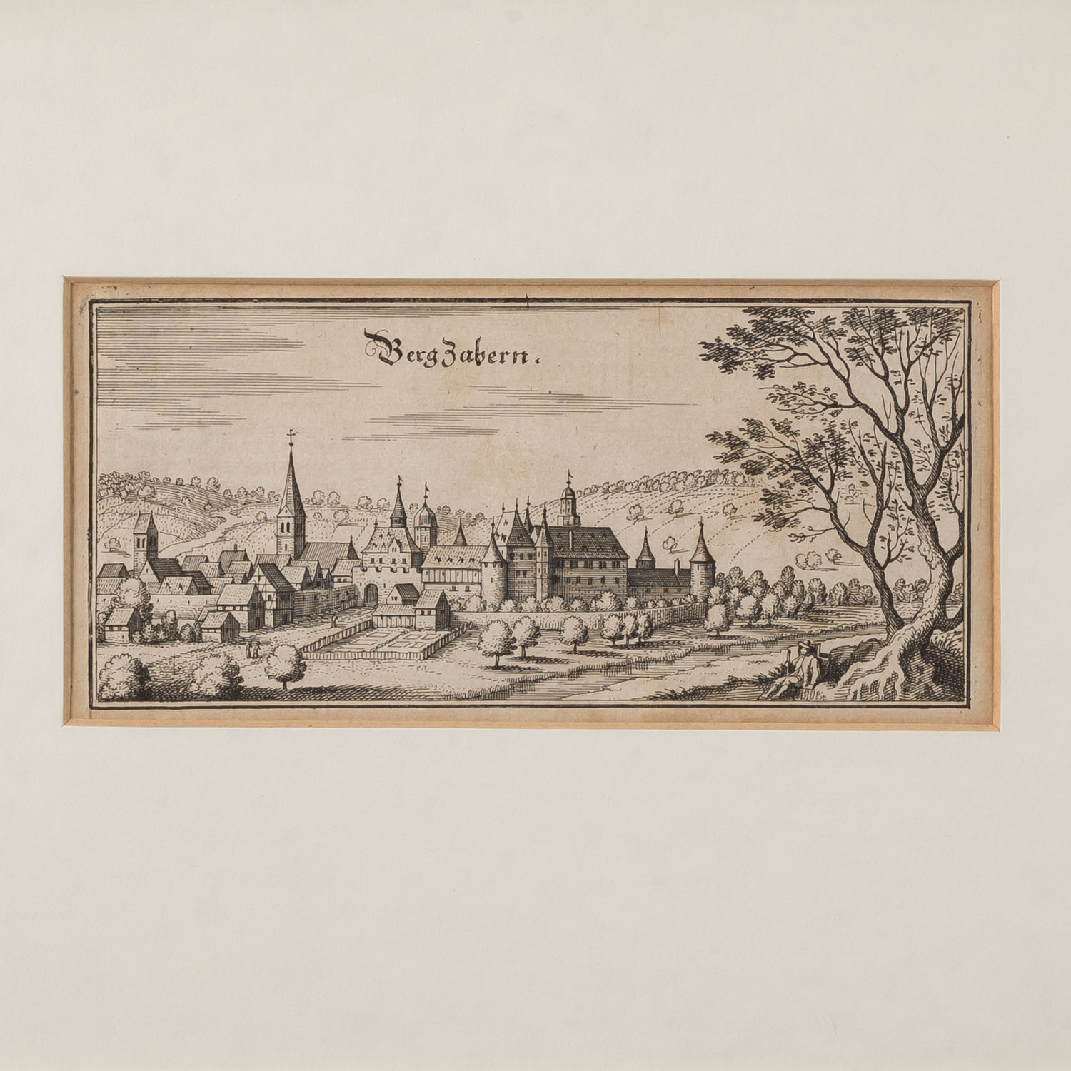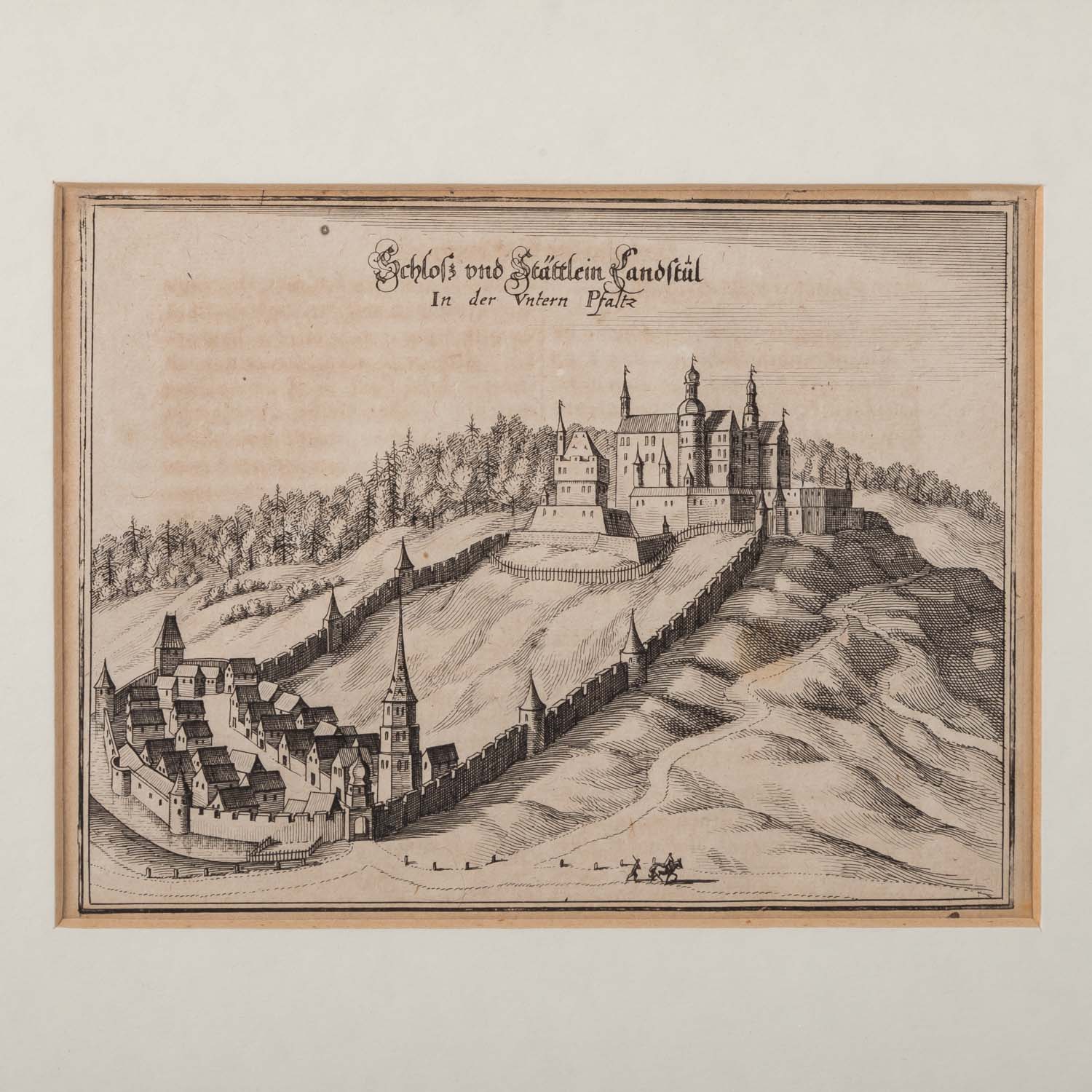 MERIAN and other (17th/18th C.), 5 Views Pfalz,'Schloß und Stättlein Landstuhl', 'Durckheim', 'Berg Zabern', 'S: Lambrecht' (dieses wohl späterer Abzug)und 'Leiningen', each copperplate engraving/laid paper, each with a title in the sky area, partly the book text on the back visible, HxW: plates approx. 9x17.5 cm to 14x18 cm (each 24.5x33 cm external dimensions frame). Signs of age, each browned, part. slightly stained. Each framed behind glass in a passe-partout.
