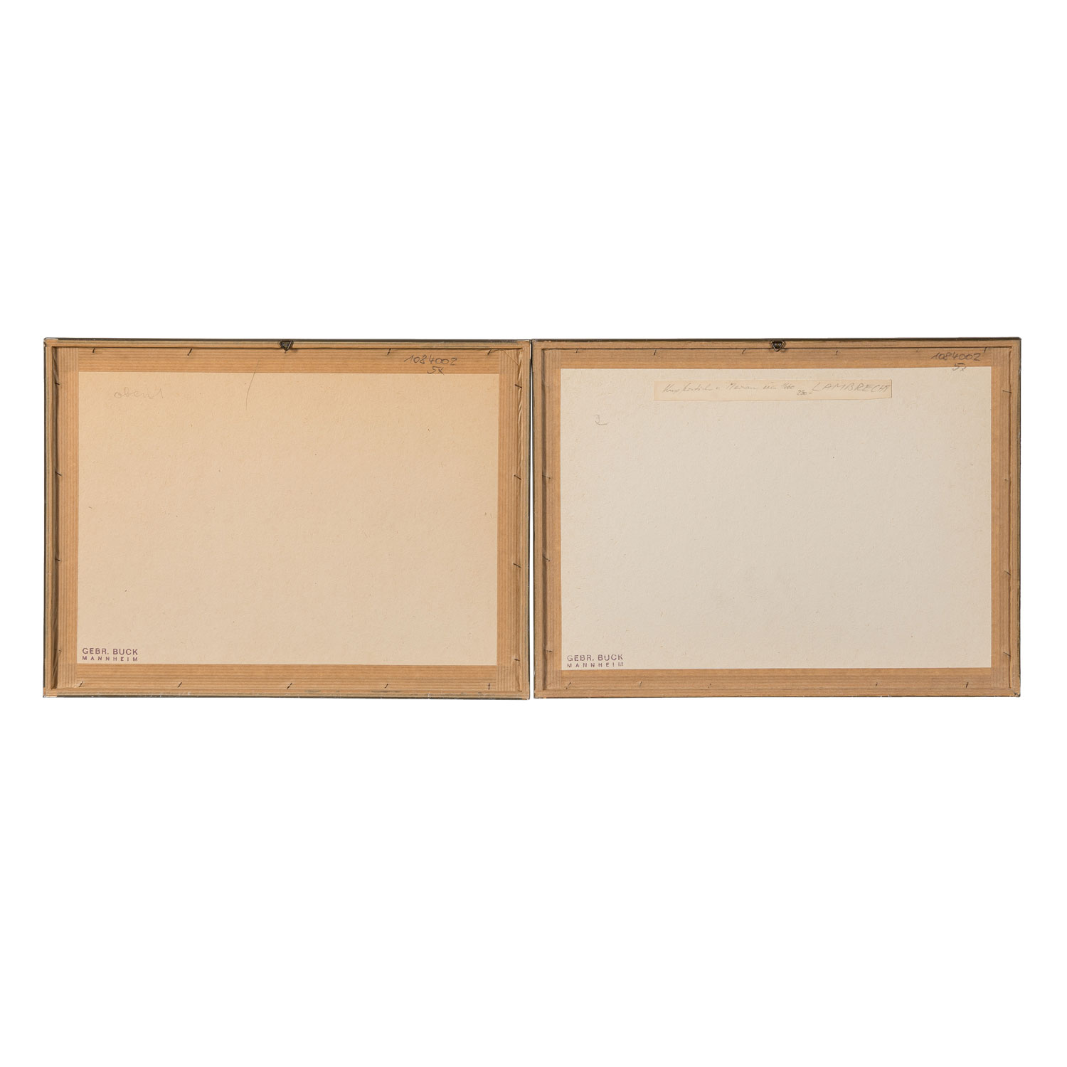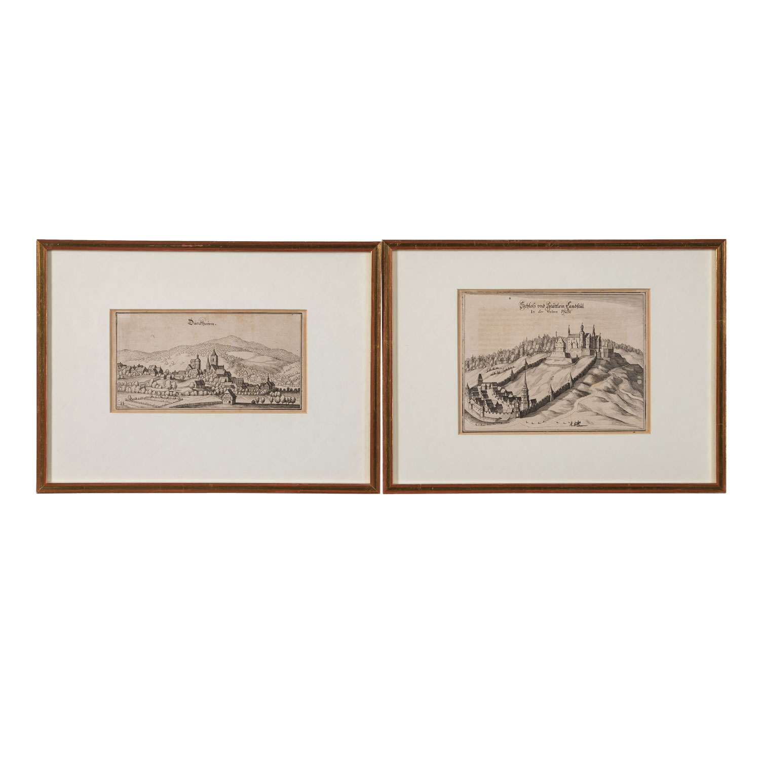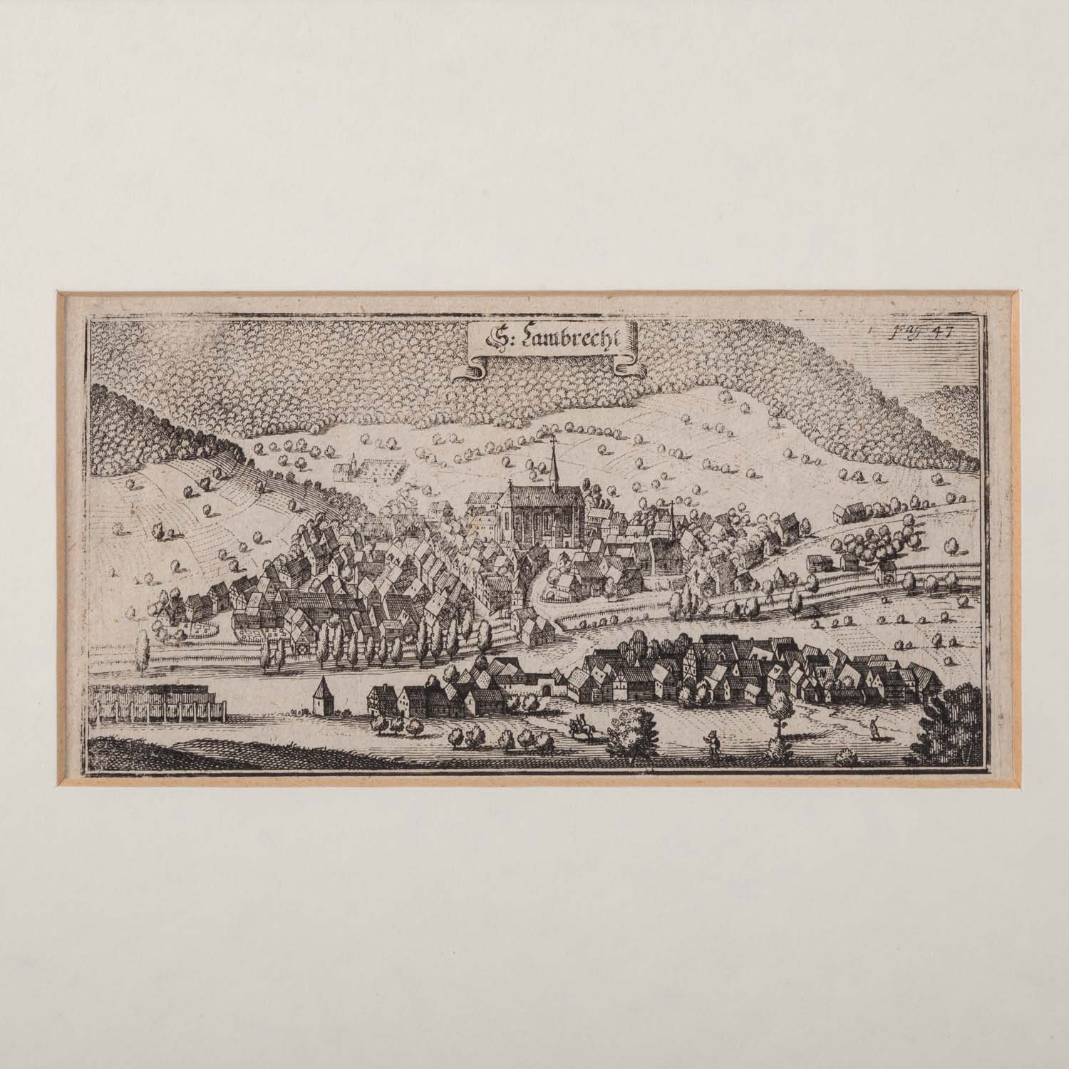 MERIAN and other (17th/18th C.), 5 Views Pfalz,'Schloß und Stättlein Landstuhl', 'Durckheim', 'Berg Zabern', 'S: Lambrecht' (dieses wohl späterer Abzug)und 'Leiningen', each copperplate engraving/laid paper, each with a title in the sky area, partly the book text on the back visible, HxW: plates approx. 9x17.5 cm to 14x18 cm (each 24.5x33 cm external dimensions frame). Signs of age, each browned, part. slightly stained. Each framed behind glass in a passe-partout.