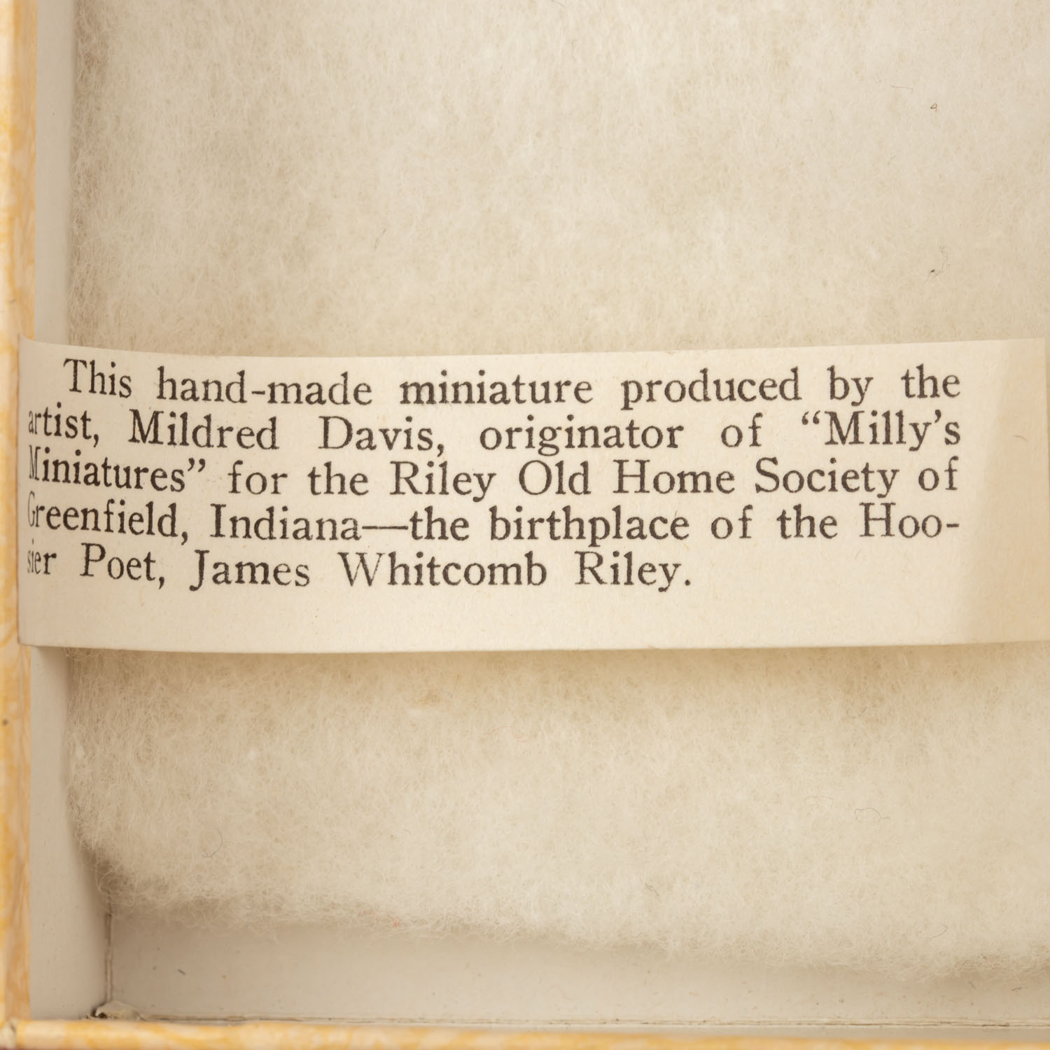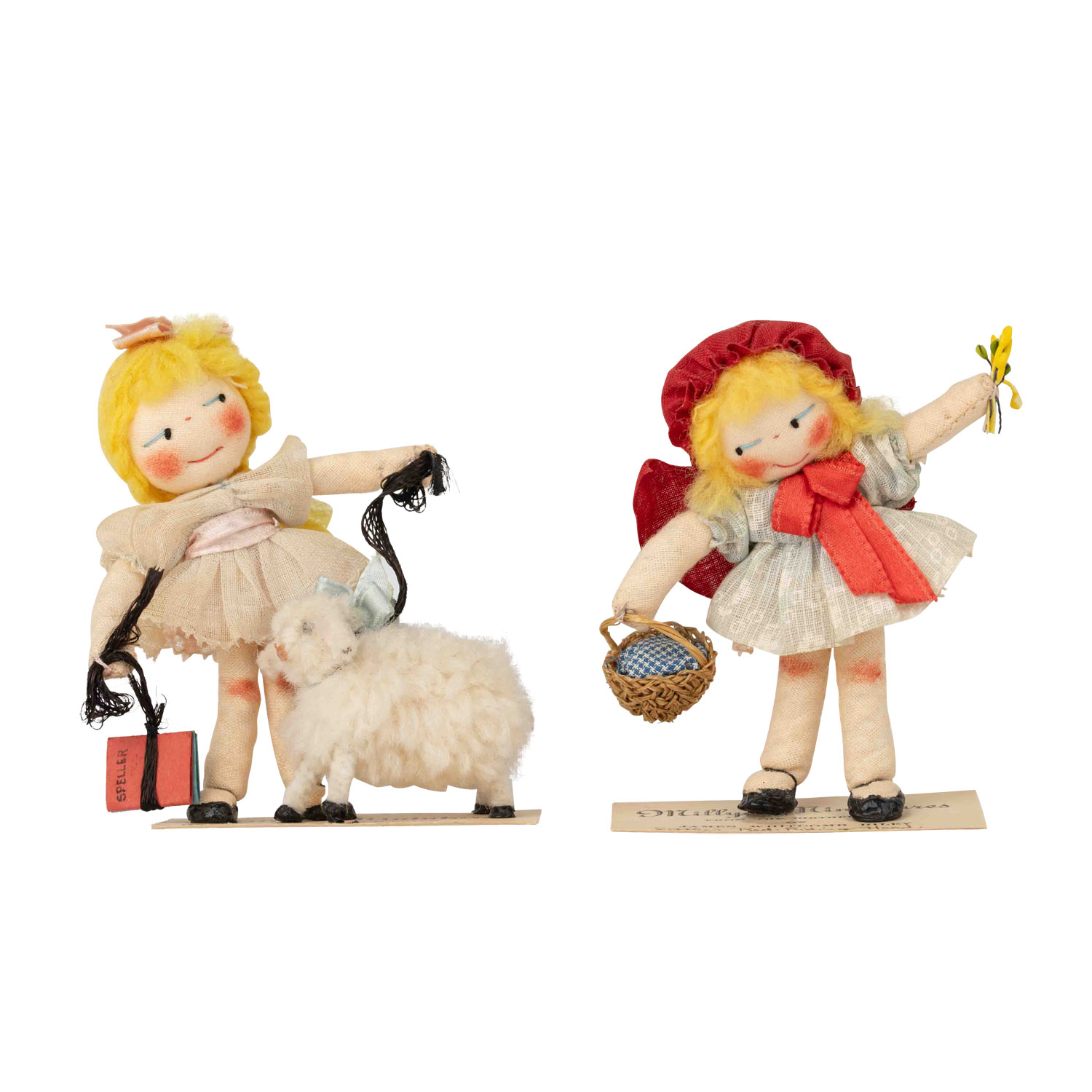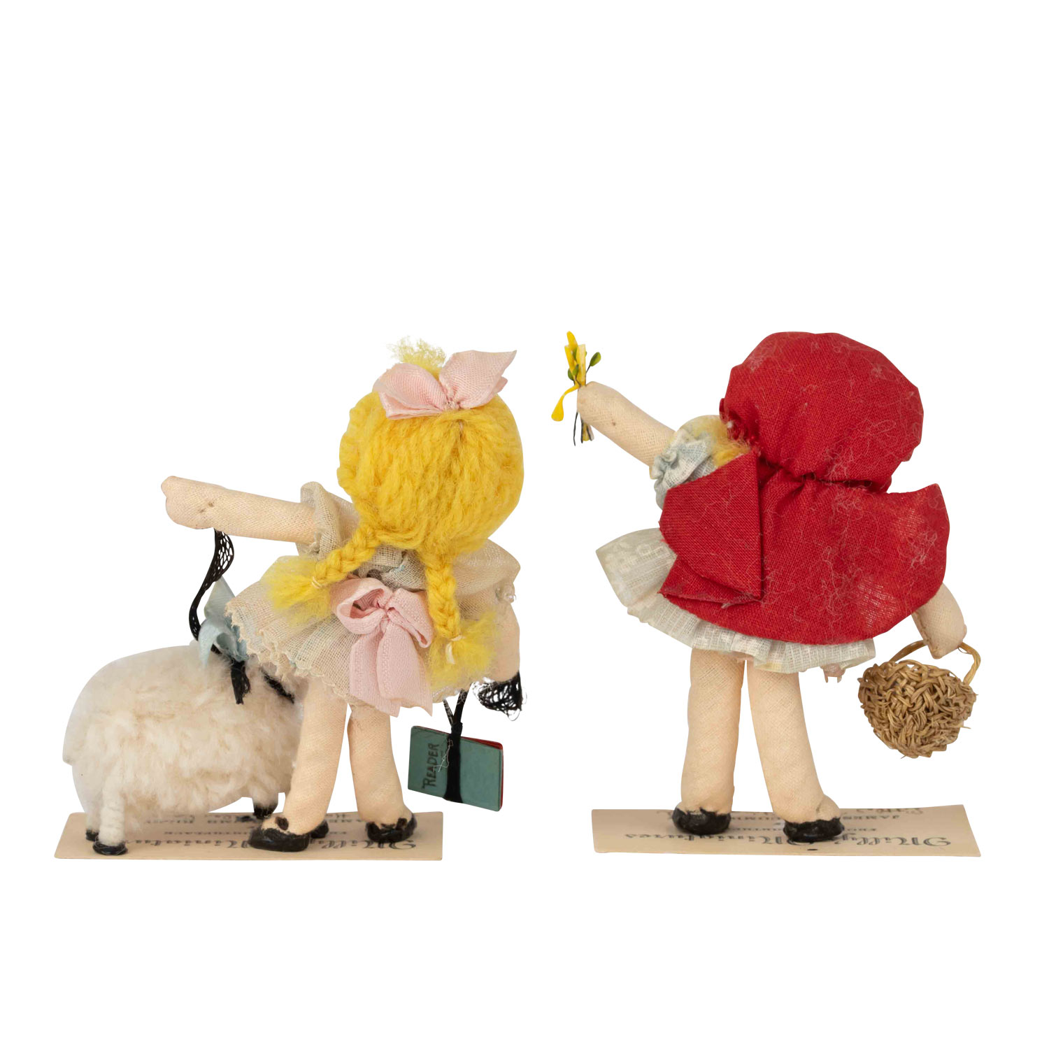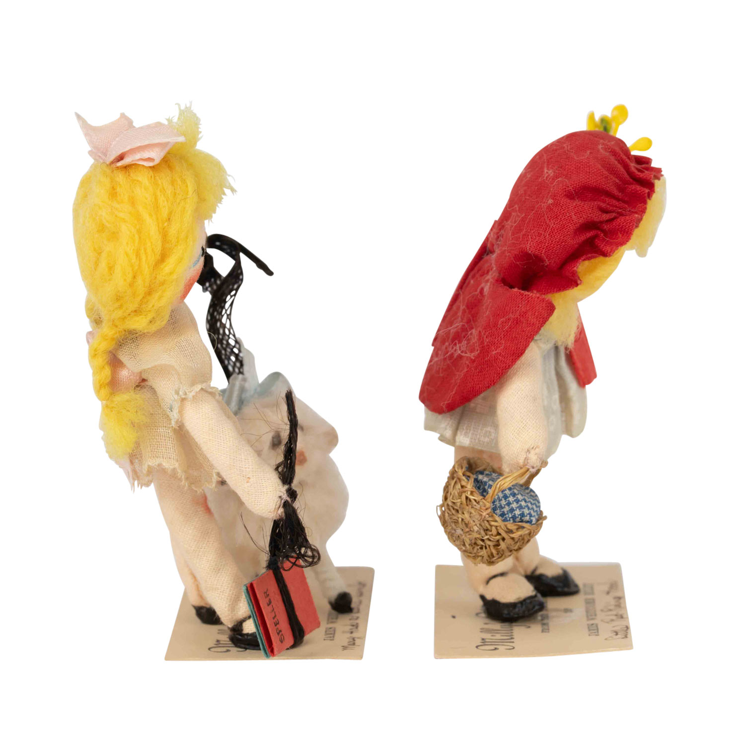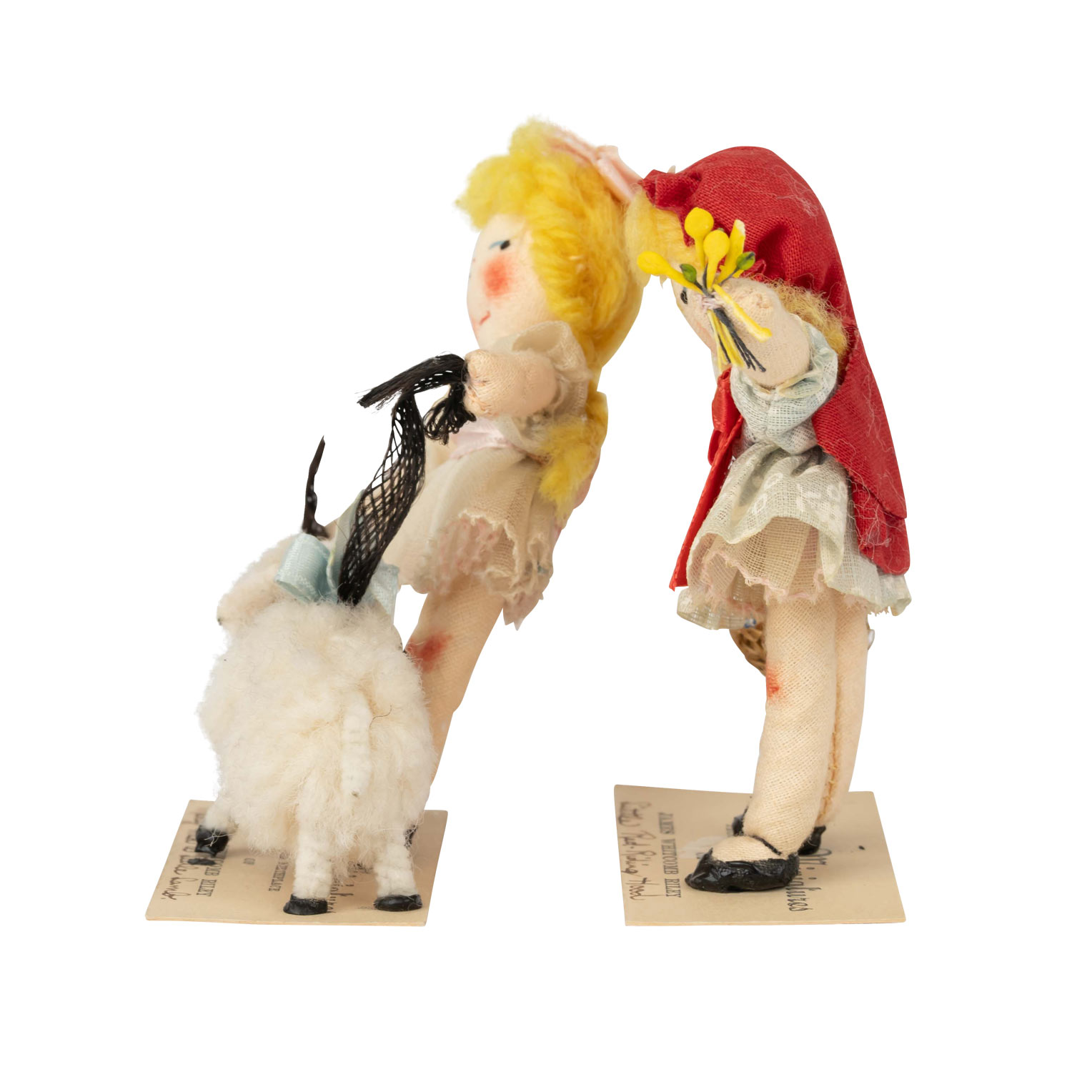 MILLY'S MINIATURES 2 dolls, 1940s, including 'Little Red Riding Hood' and 'Mary with a little lamb', handmade by the artist Mildred (Millie) Davis from Greenfield, Indiana, birthplace of the American writer and children's poet James Withcomb Riley for the 'Riley old Home Society', both dolls with delicate details, like baskets and books, original box and label attached, H 8, 5 and 8 cm.