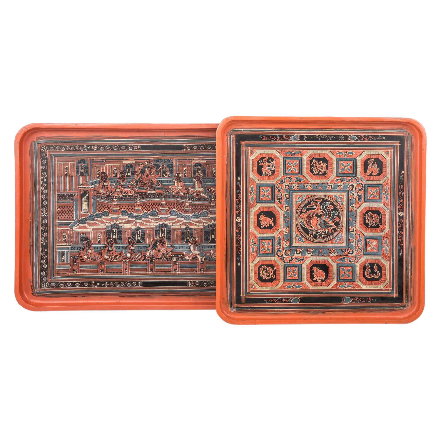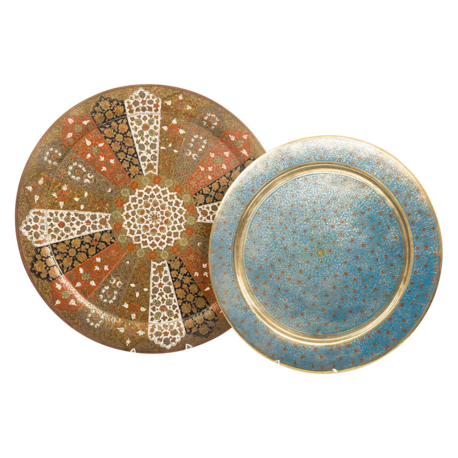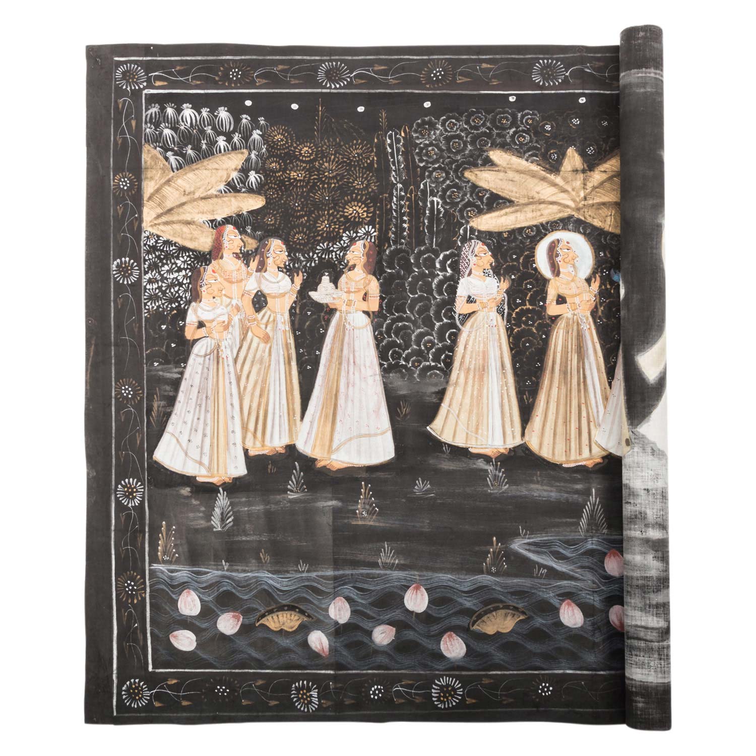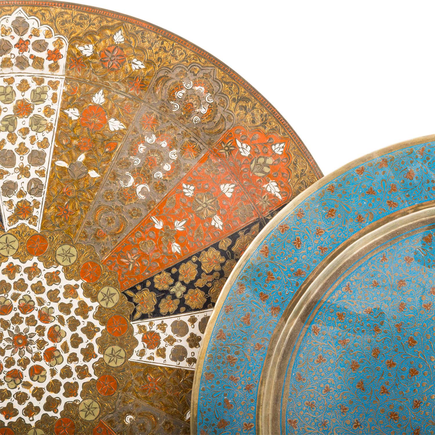 8 parts: INDIA/ASIA, 20th c.:1 painting on cotton fabric, in Mughal style, figure scene in front of black background, 85 x 117 cm, without frame AND 1 book on Indian art: 'Kishangarh Painting, Lalit Kalá Akademi', New Delih 1959 AND 2 finely engraved brass plates, D 29 cm and 34 cm AND 1 lacquer set: 2 trays (angular, D 42 cm and rectangular, L 45 cm) and 2 round lidded dishes, D ca. 10 cm. Partly damaged.