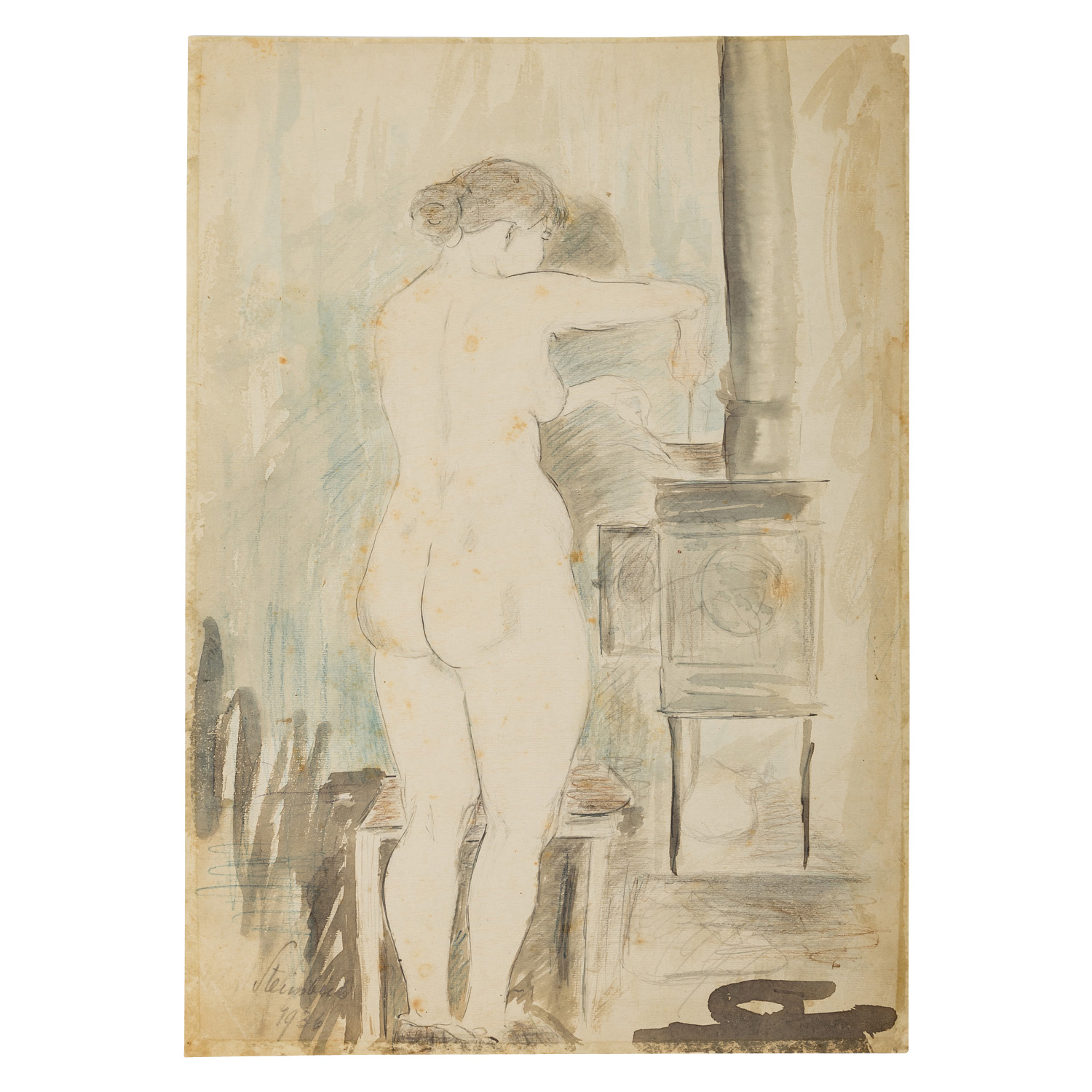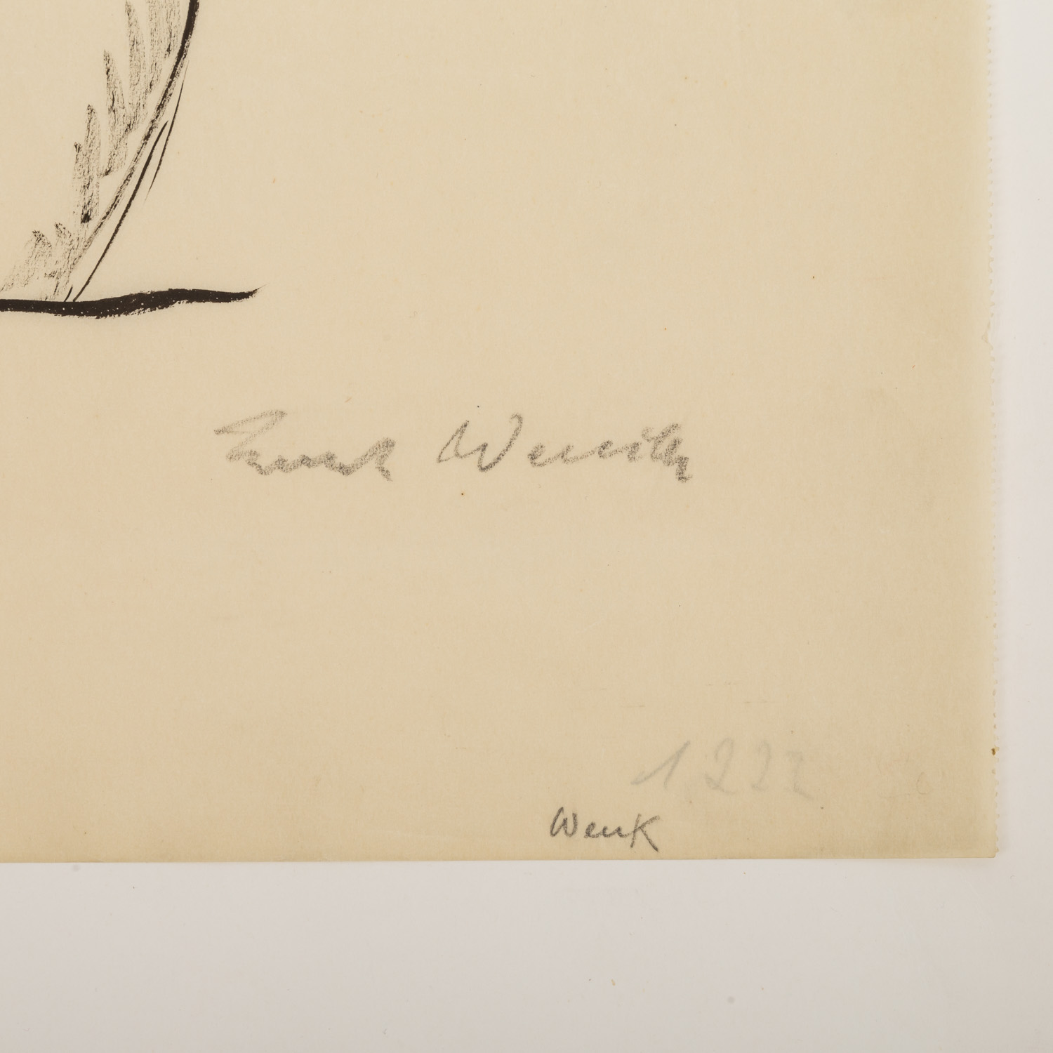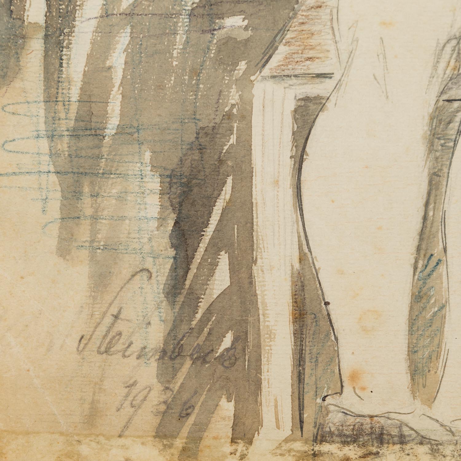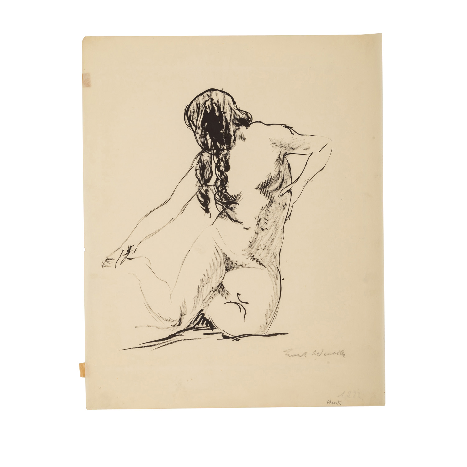 ""Female nude"", watercolor over pencil / gray-toned paper (left margin perforated), signed and dated 1936, HxW: approx. 34.5x24.5 cm; 1x ERNST WENCK (1865-1929), movement study ""Female Nude"", ink / parchment paper (right edge perforated, mounted on the left side), signed, HxW: approx. 45x36.5 cm. The slightly browned, kinks, part. stains, tears on the edge.
