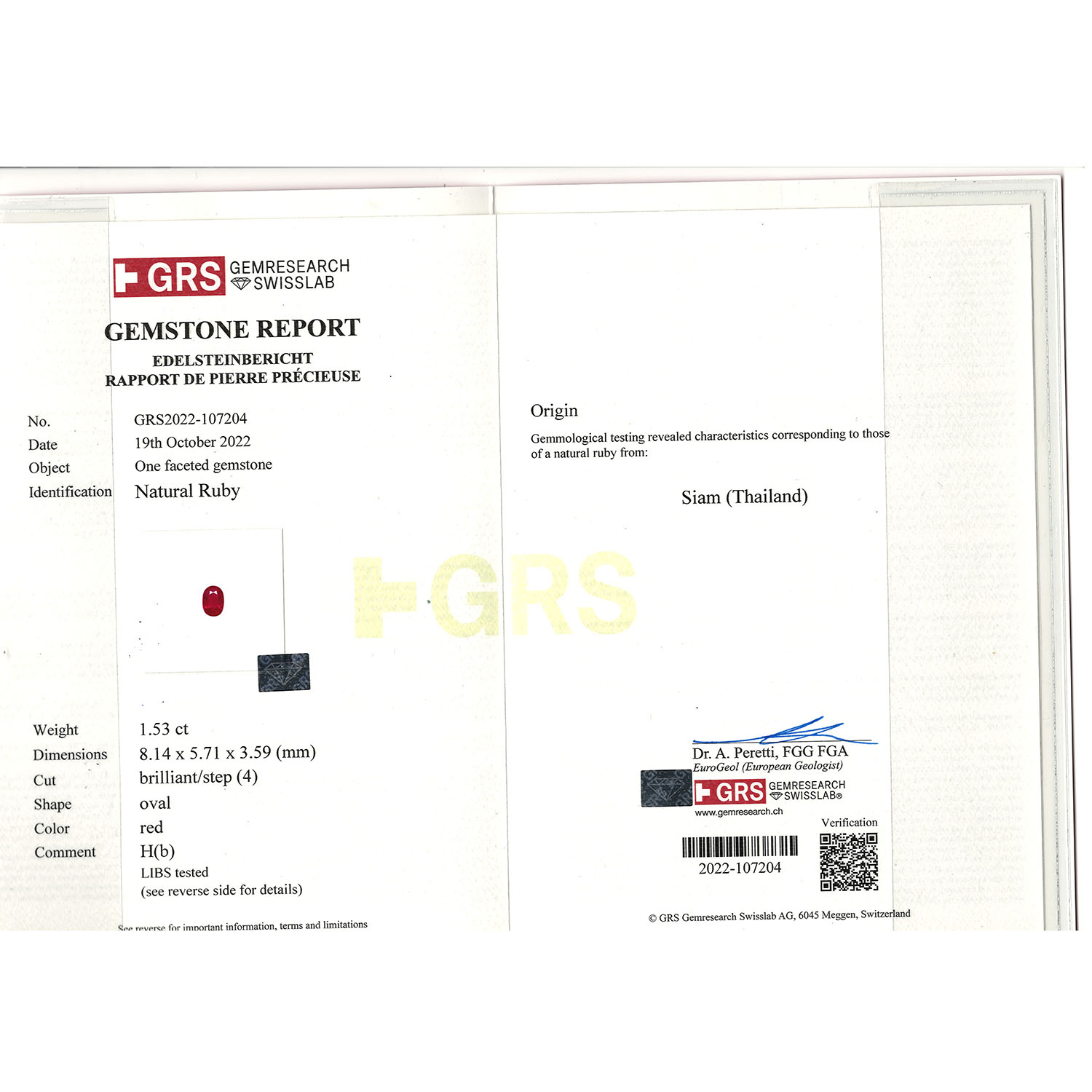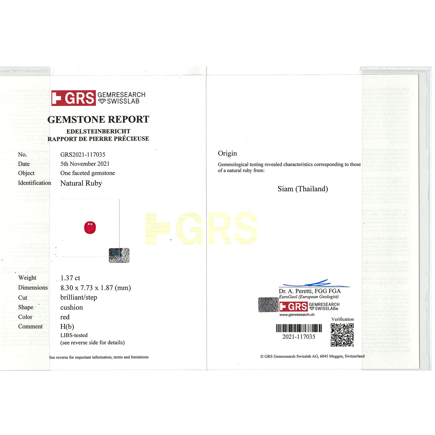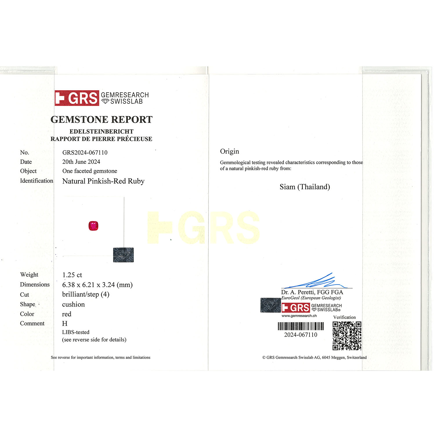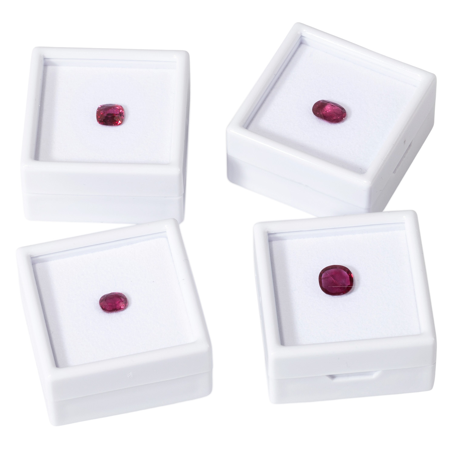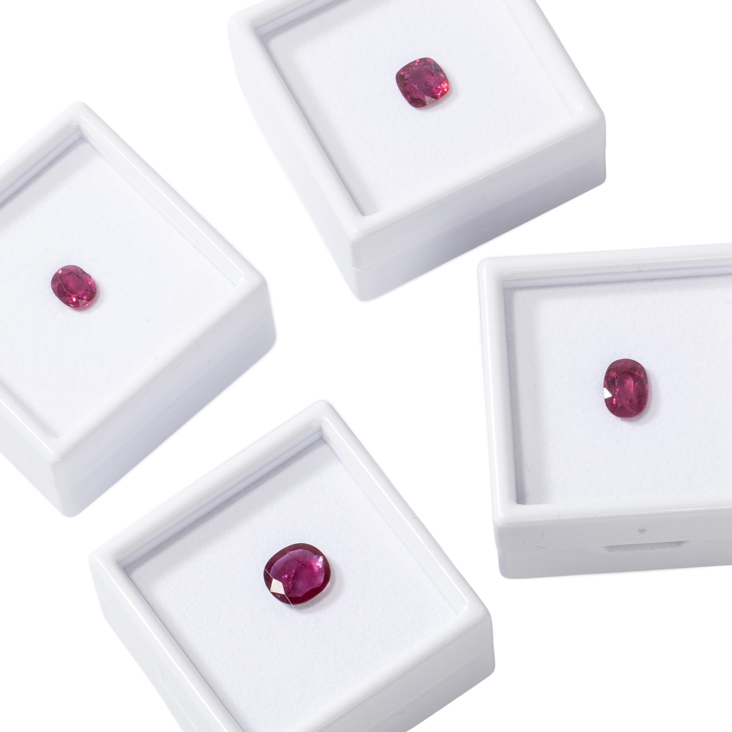 Bundle of 4 rubies, totall. c. 5.3 ct, different cuts and sizes, largest stone: c. 1.5 ct (8.1 x 5.7 x 3.5 mm), partly very fine colour, nat. growth features, some small scores, incl. GRS certificates (2024). Replacement value: c. 500 € per ct.