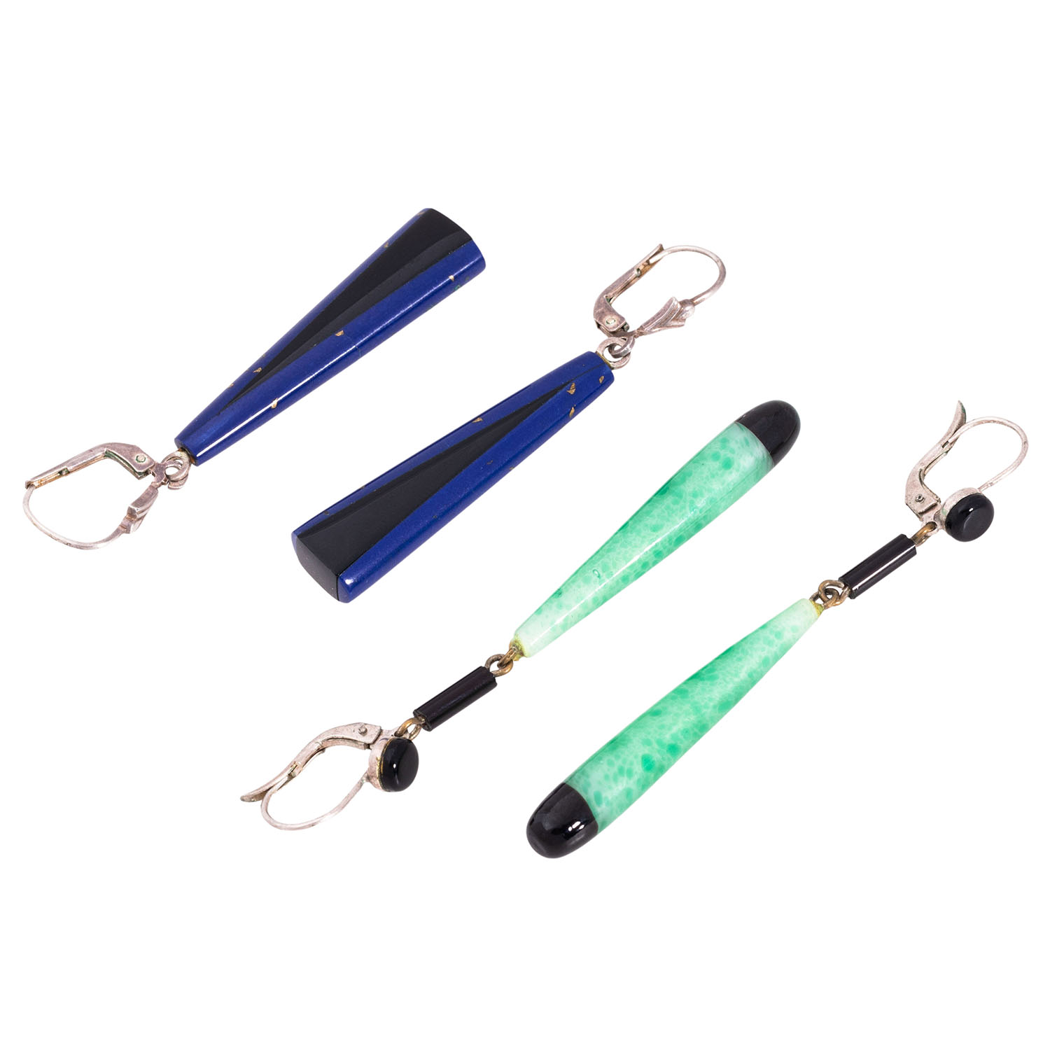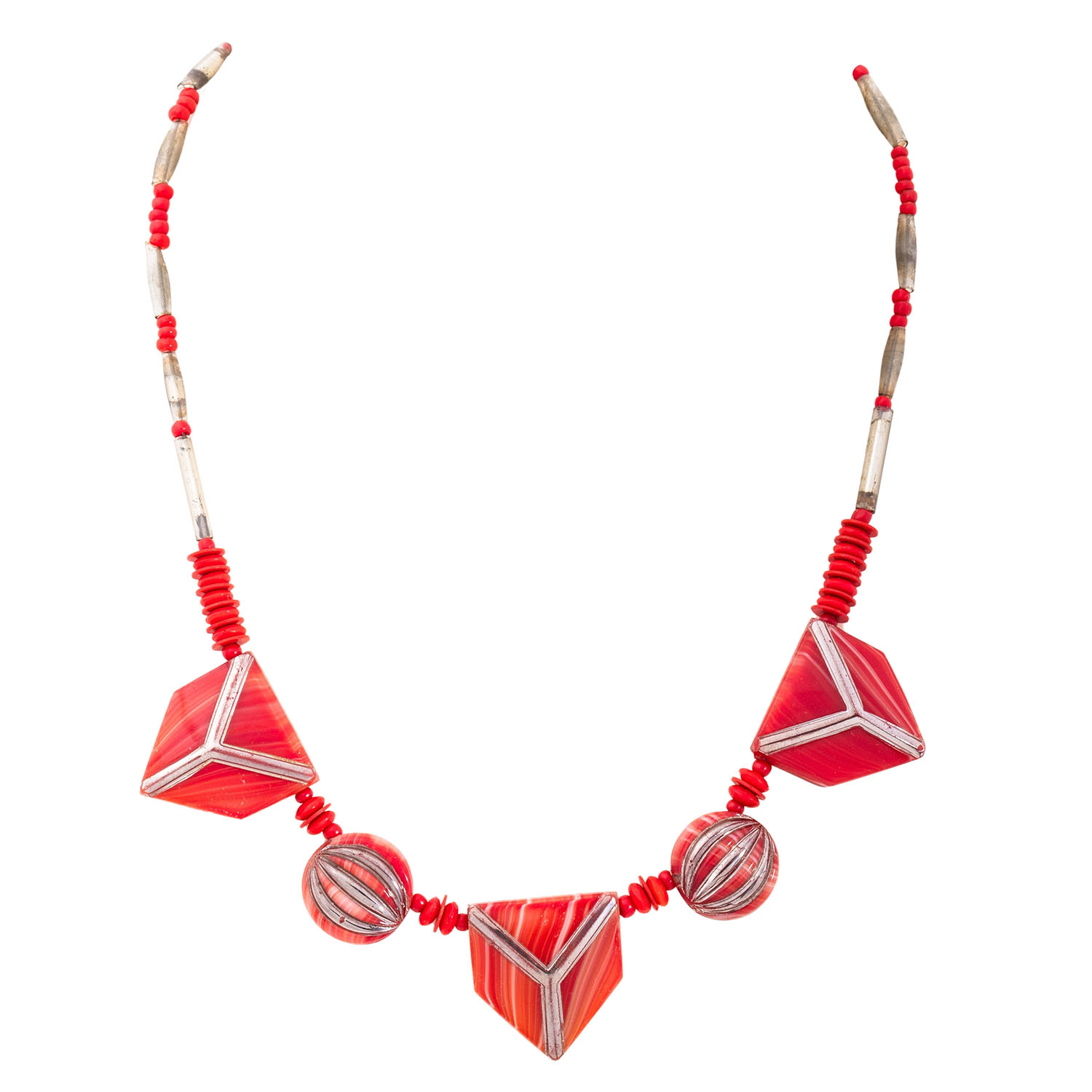 Set from costume jewellery from Pate-de-Verre, glass, faux pearls and imitation horn, partly set with rhinestones, composed of two pairs of earrings, necklace, flexible bracelet and brooch, partly silver, early 20th century, good condition.