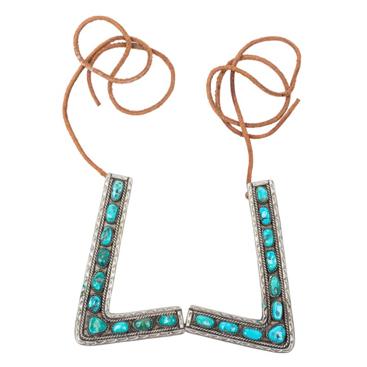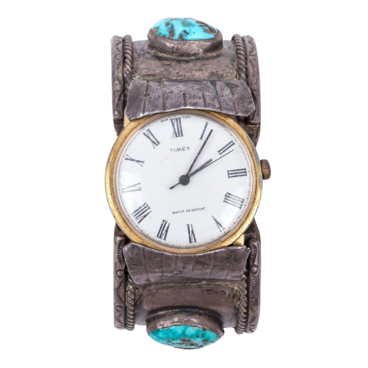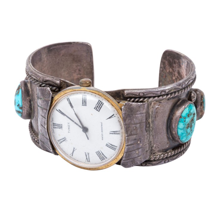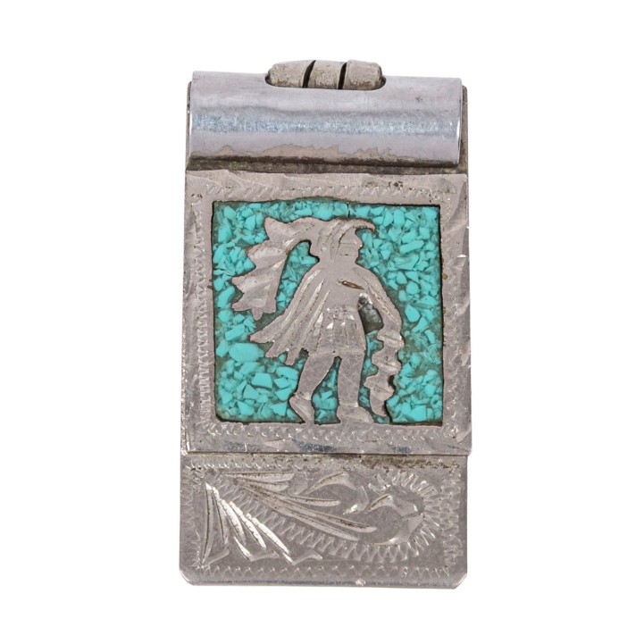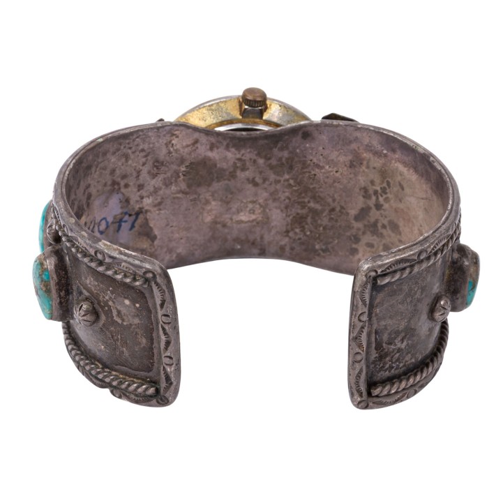 Collection of Native American jewelry, MEXICO, 20th century, made of metal with turquoise: 1 pair of collar corners, 1 bangle with watch, 1 money clip, signs of age and wear, damaged.