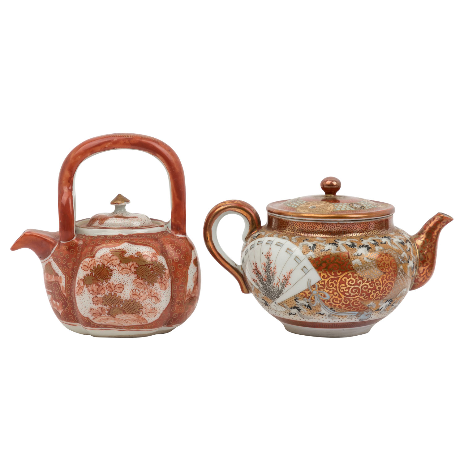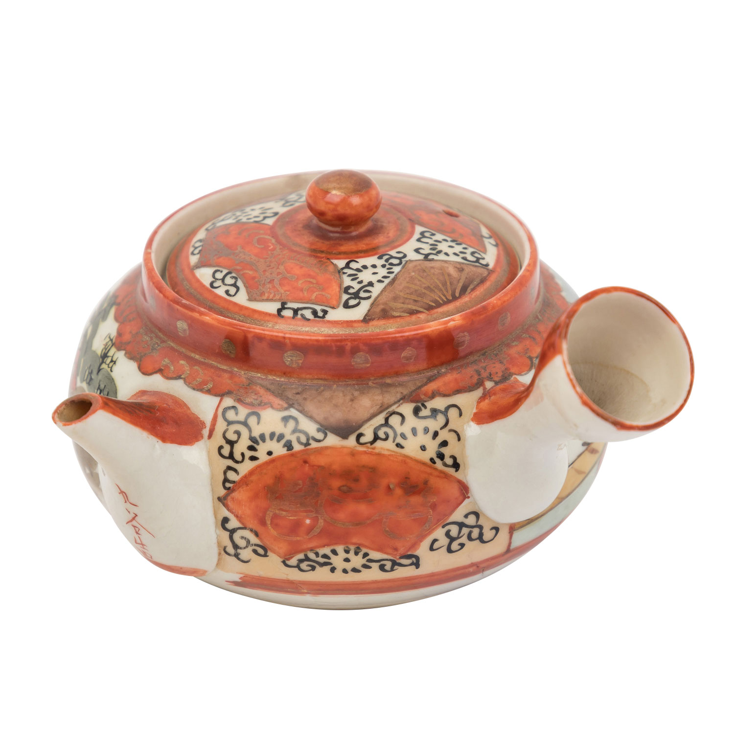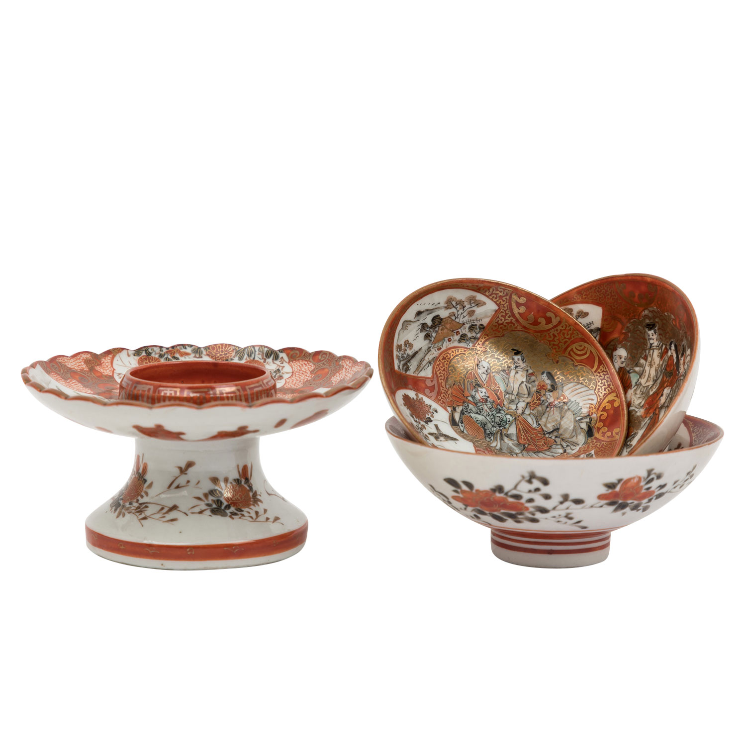 | Mixed lot of Kutani porcelain and Kutani ceramics, JAPAN, 19th c., 7 pcs: : 1.) Kyusu teapot, h. 6 cm 2.) Pot, h. 10 cm 3.) 3 small bowls, d. 7/8/9 cm with a footed offering bowl, h. 5 cm. 4.) Teapot, h. 8,5 cm. Signs of age and use, condition not perfect. FROM THE ESTATE OF ALFRED AND GISELA DIENST